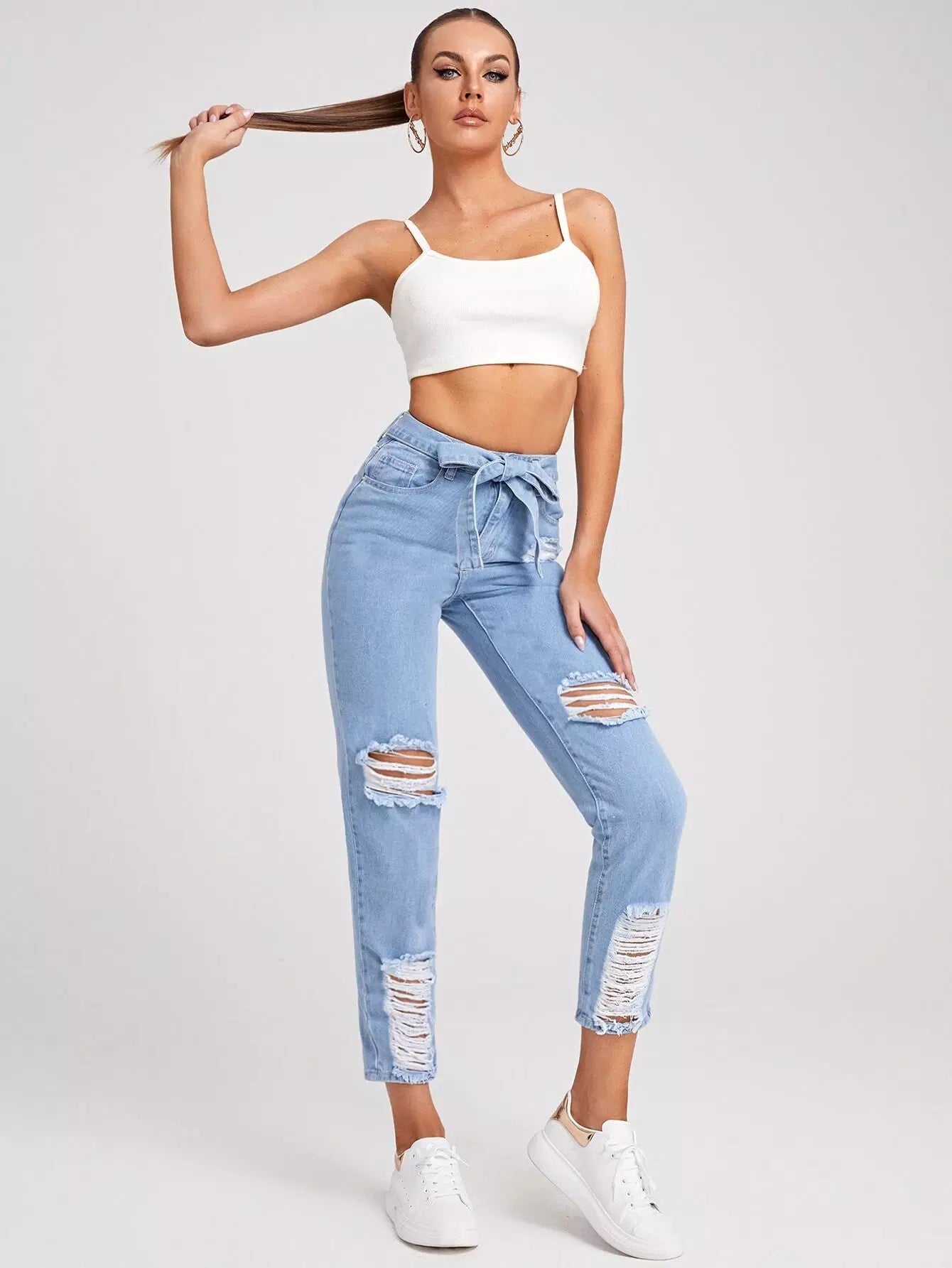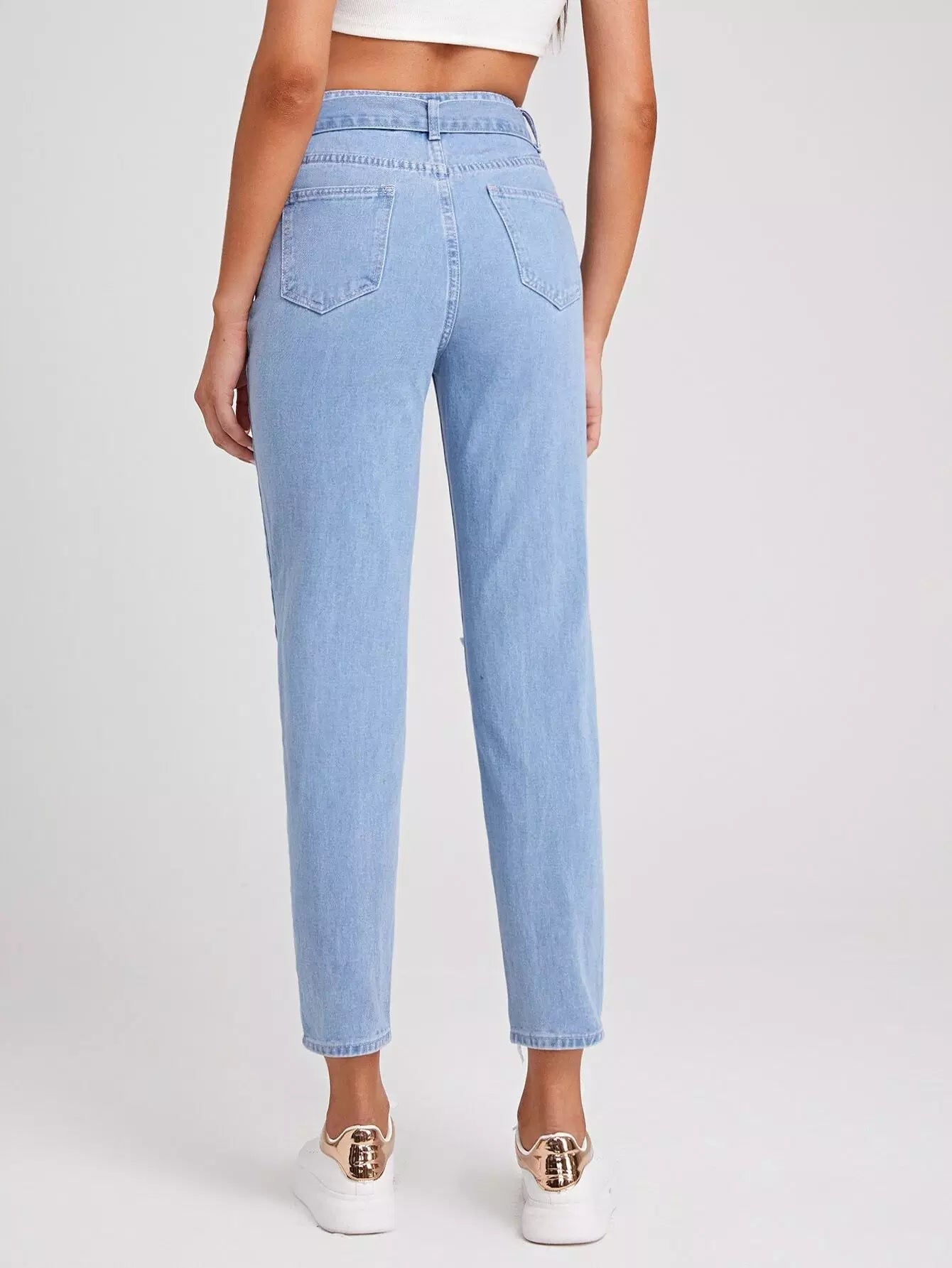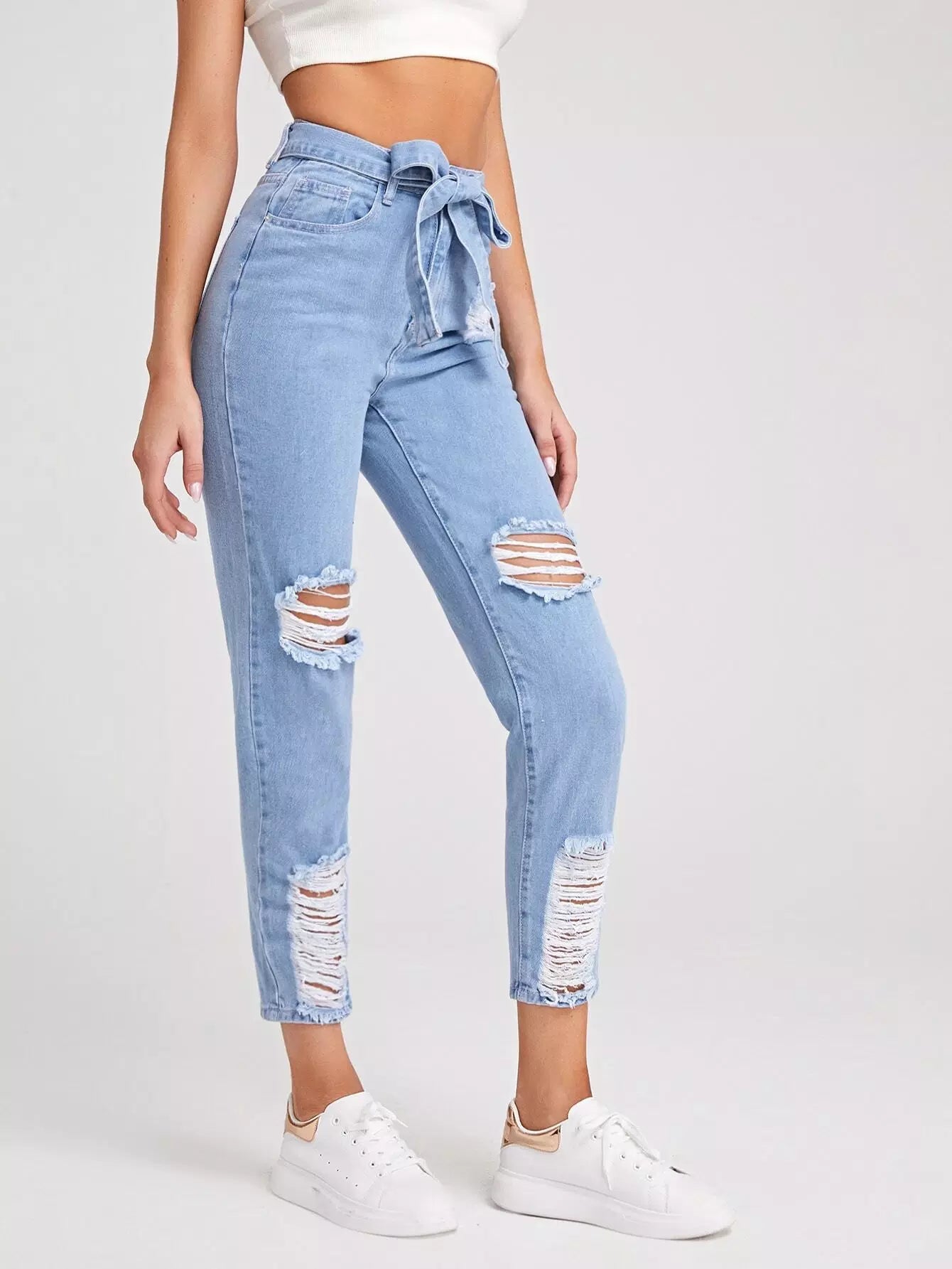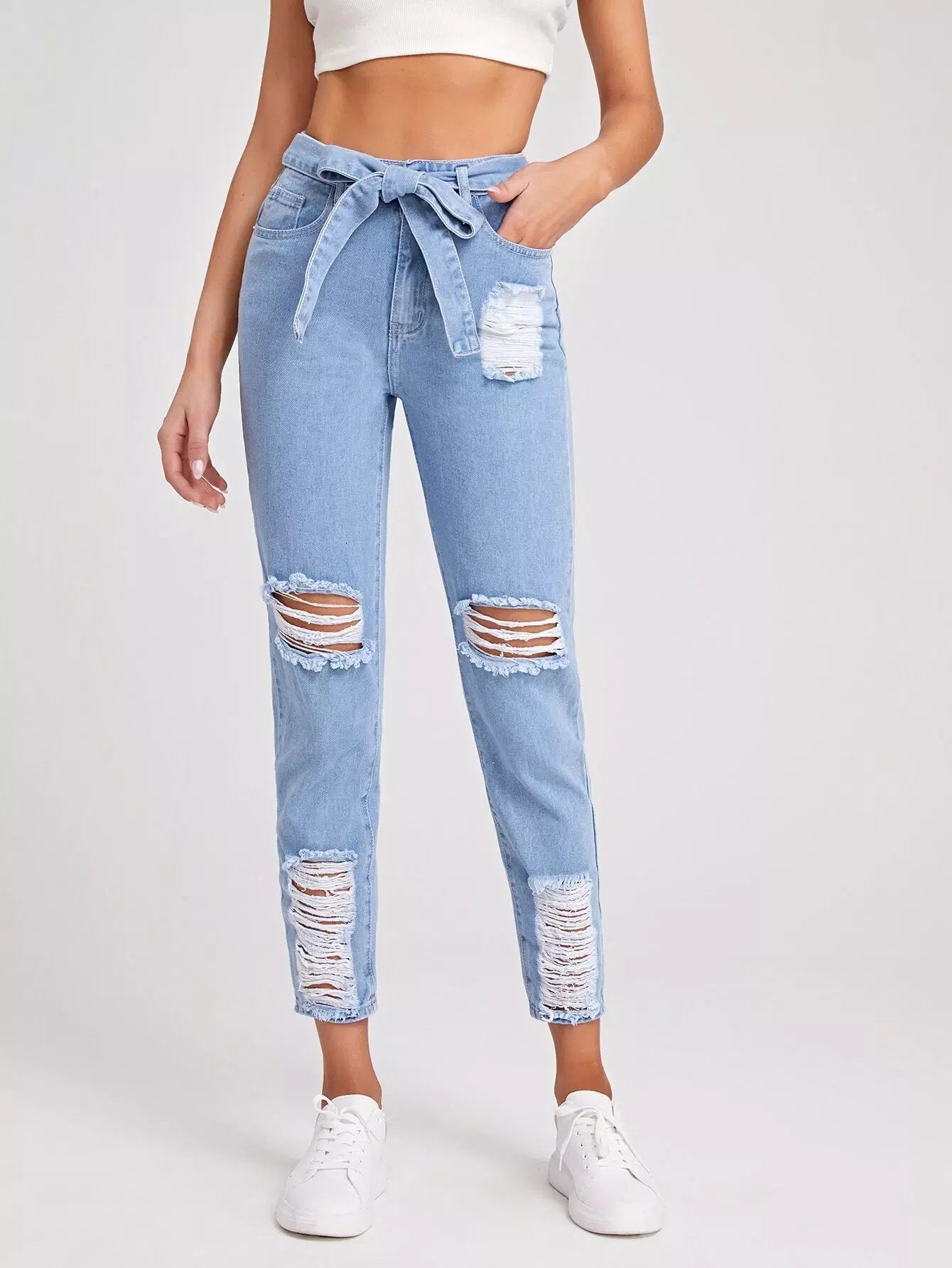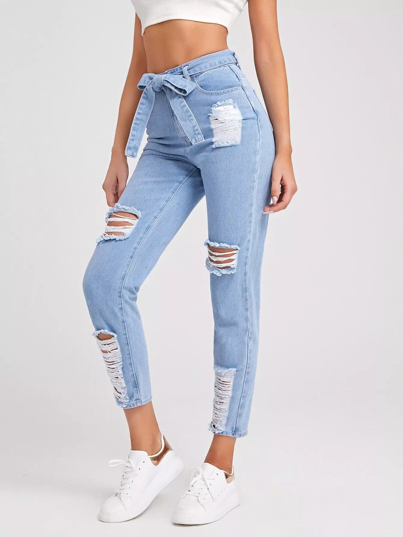 بنطال جينز ممزق ذاتي الغسيل خفيف بدون حزام