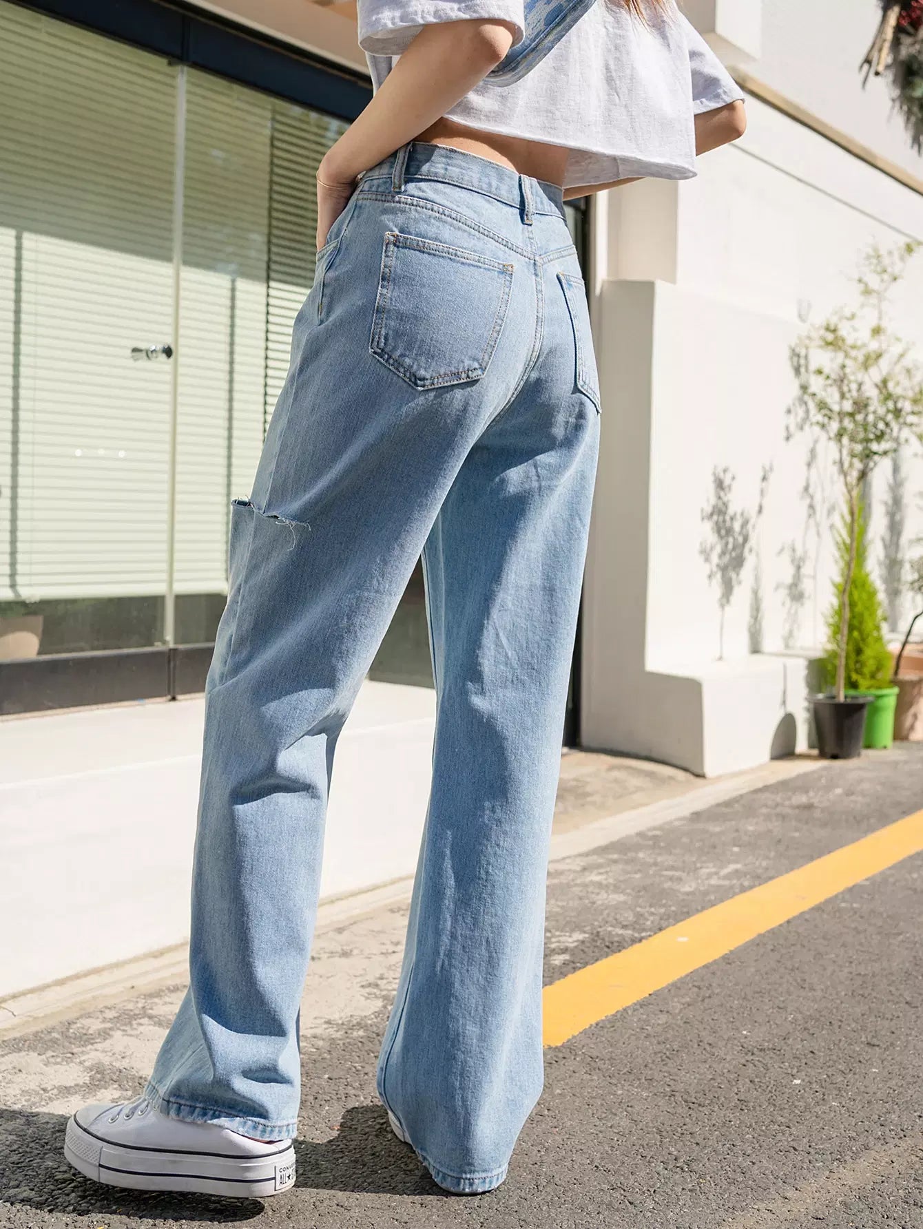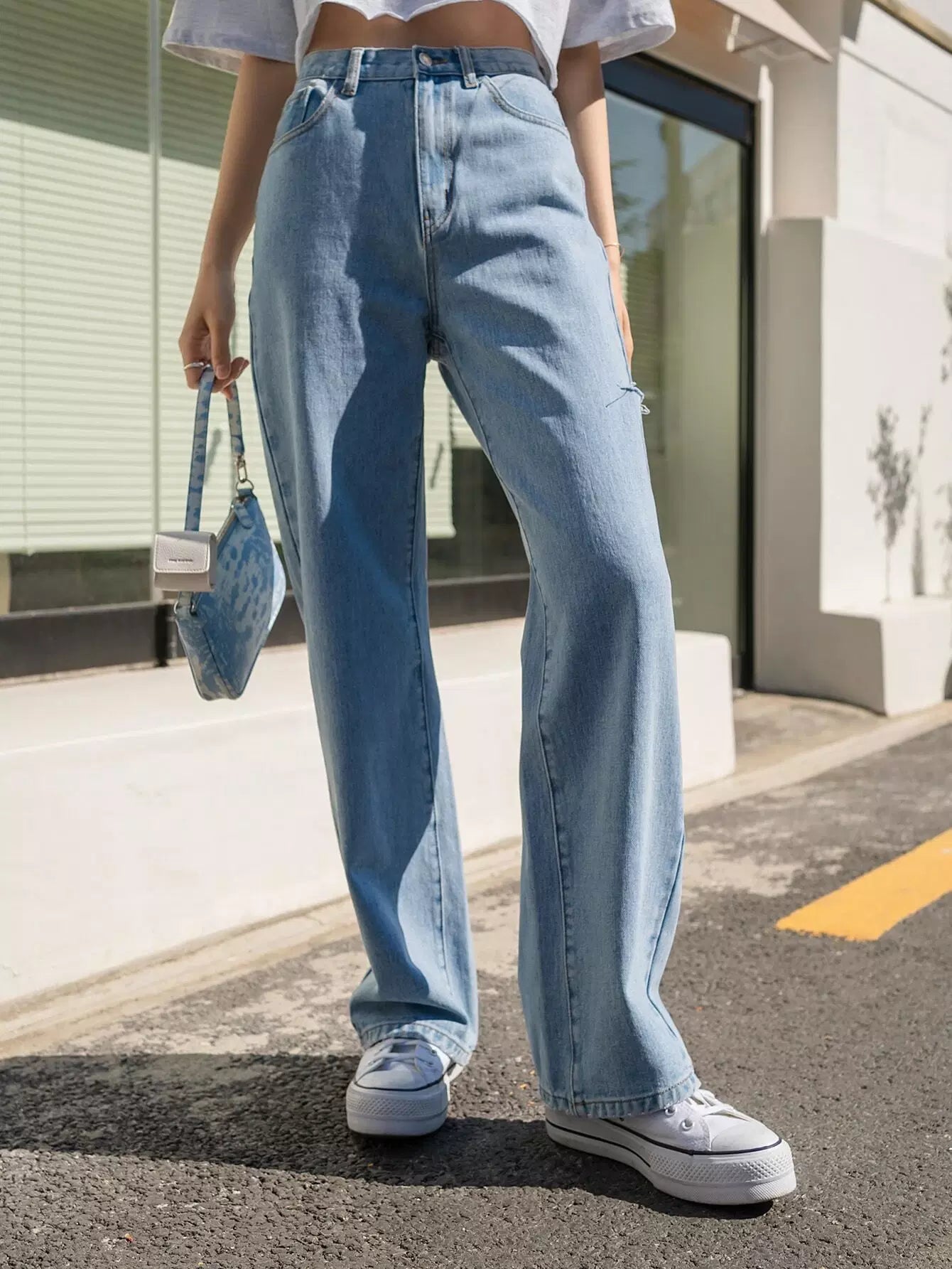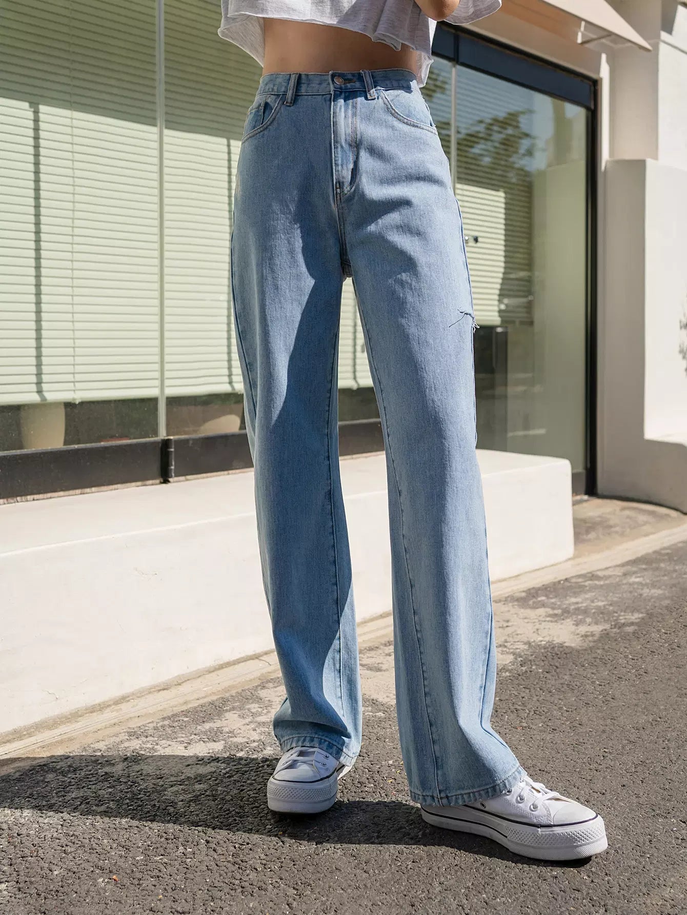 بنطلون جينز سادة ممزق مستقيم الساق مستقيم