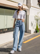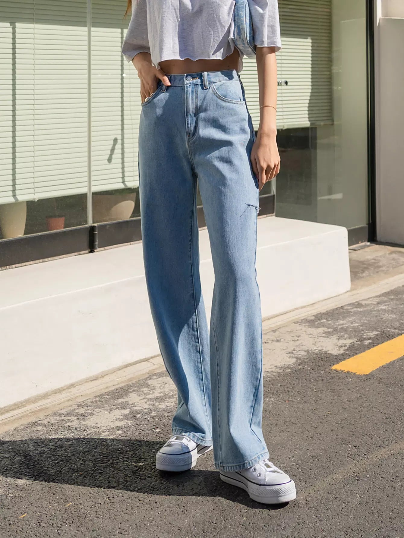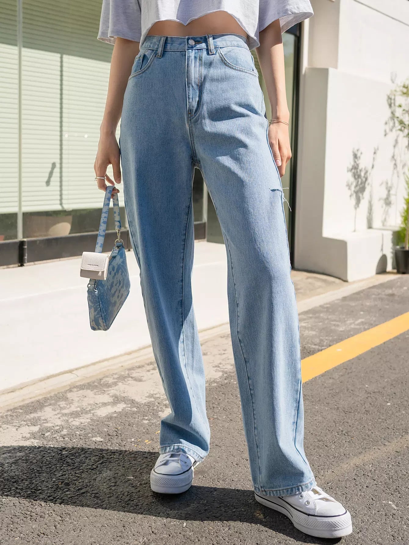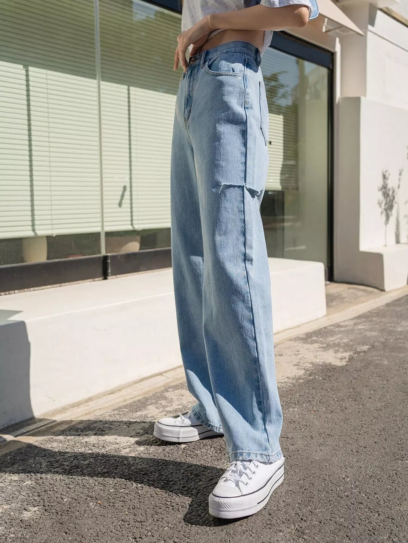 بنطلون جينز سادة ممزق مستقيم الساق مستقيم