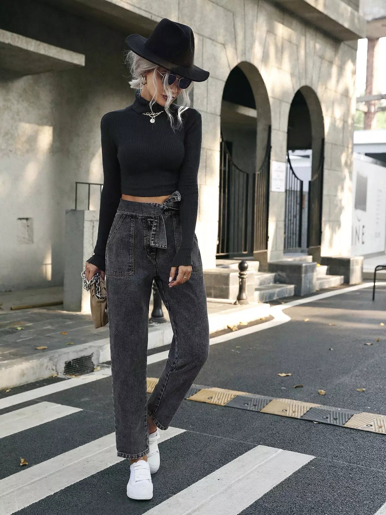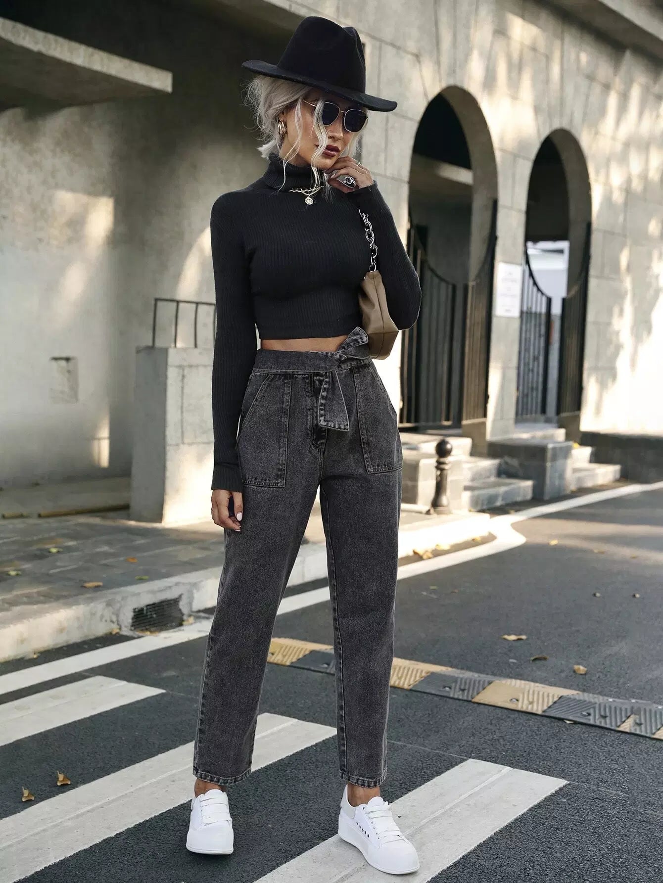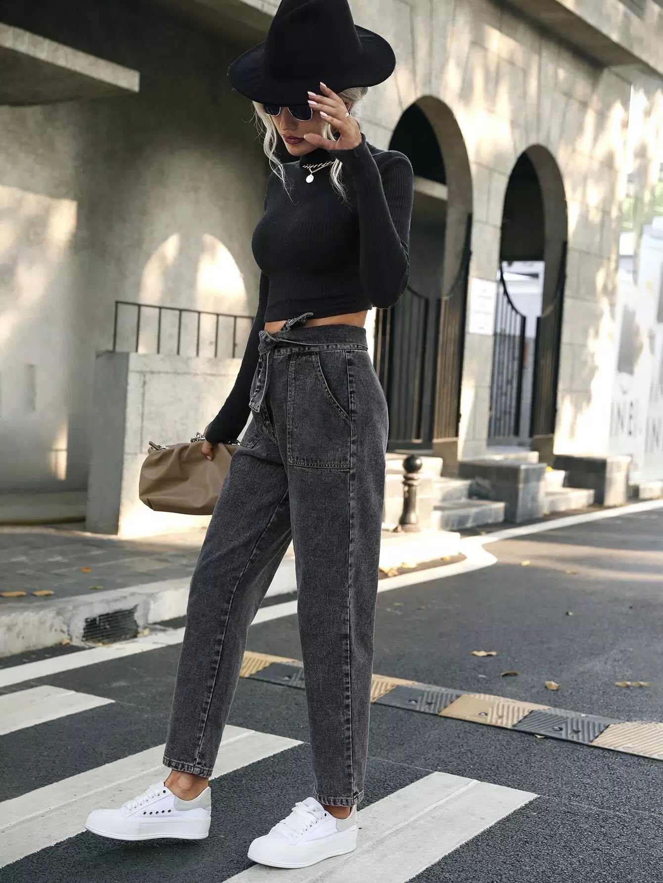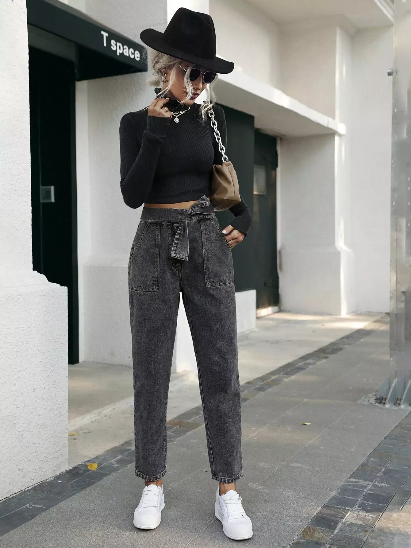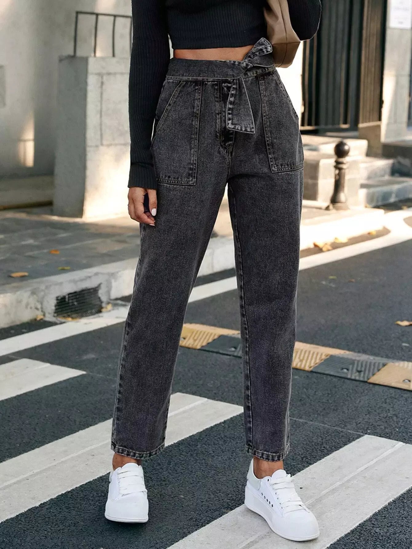 بنطال جينز برباط على الخصر وجيب مائل