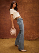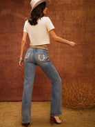 بنطلون جينز ويست فيد متوسط الارتفاع بتصميم حدوة حصان غربي مع تطريز على شكل جيب خلفي وقصة واسعة من الأمام وقصة رعاة البقر