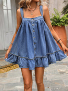 فستان Breezaya النسائي من قماش الدنيم للعطلات غير الرسمي بدون أكمام على شكل حرف A مع حاشية مكشكشة وأزرار أمامية