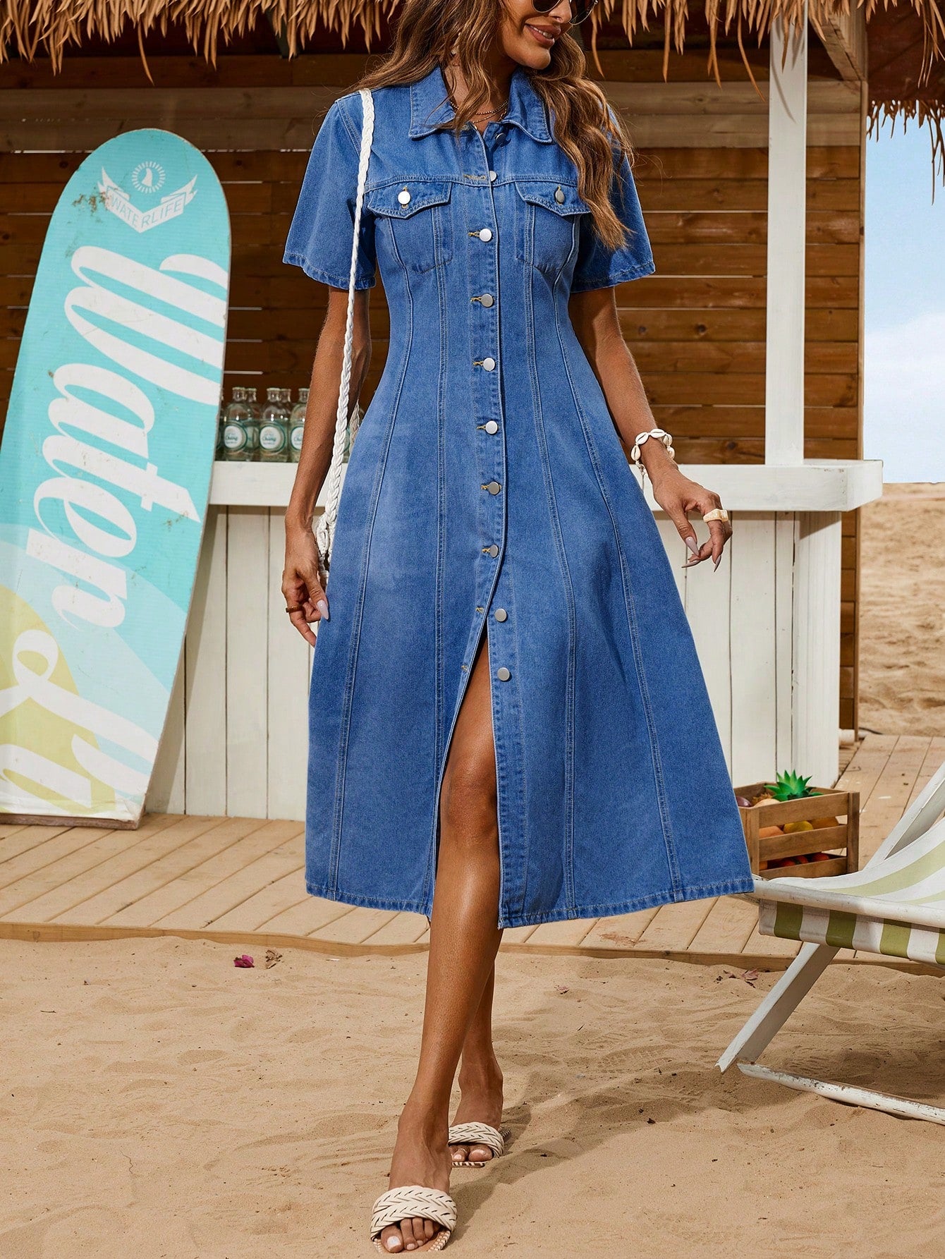 فستان بريزايا النسائي الصيفي ذو الصدر الواحد والأكمام القصيرة من قماش الدنيم الكاجوال