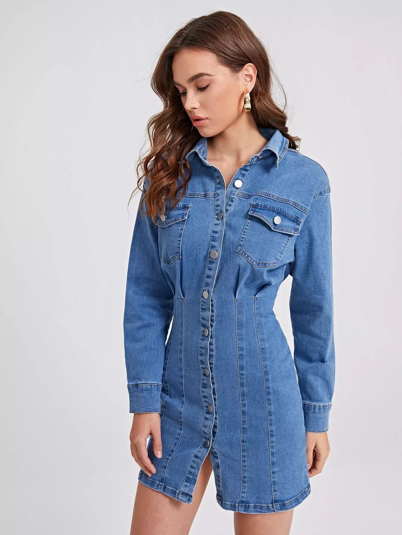 فستان دنيم بجيب أمامي بأزرار بغطاء من الدنيم