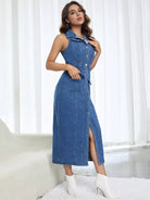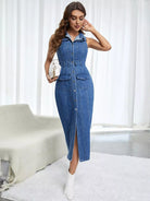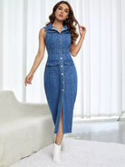 فستان دنيم بغطاء من الدنيم بأزرار وجيب بغطاء بأزرار