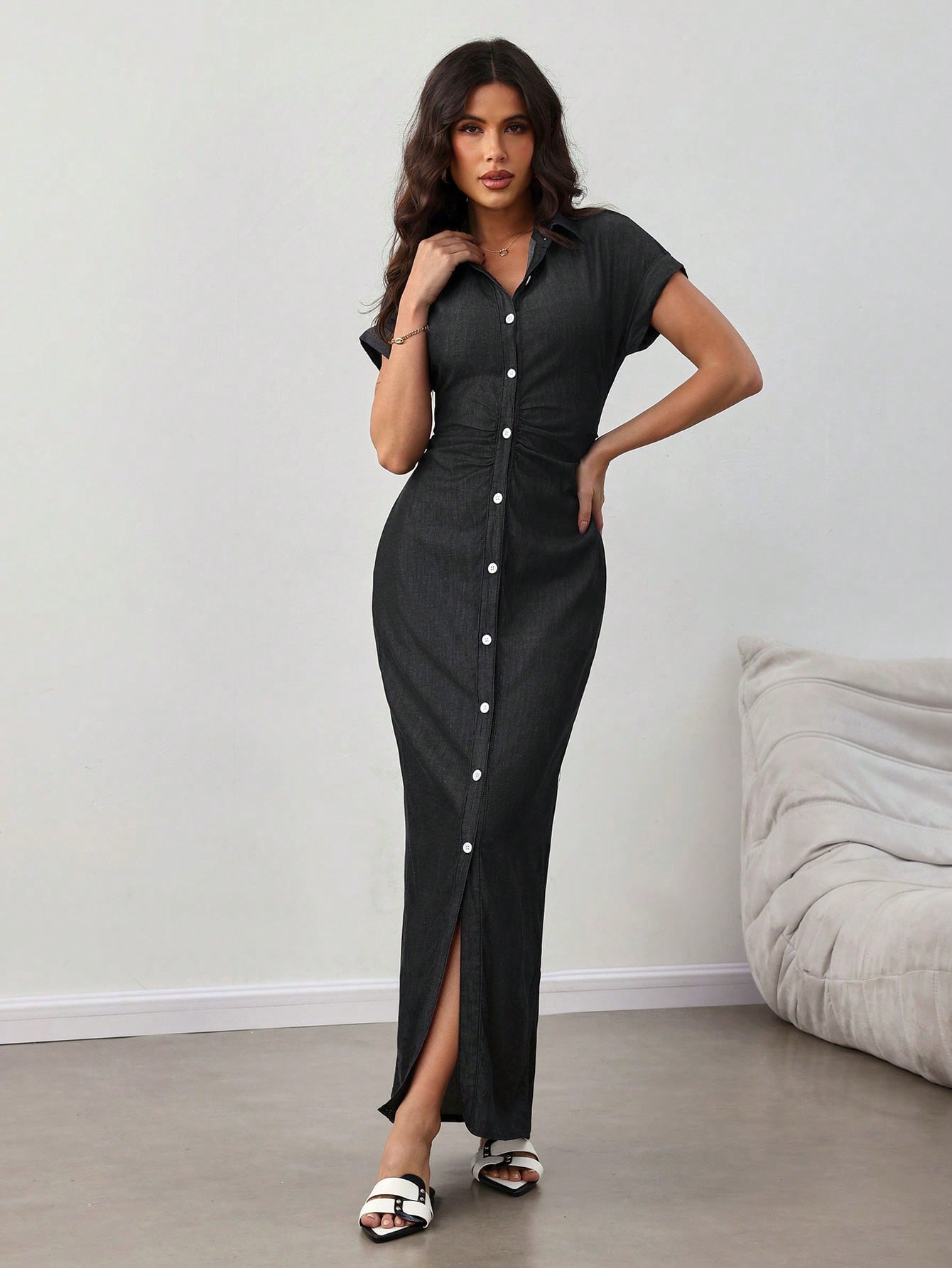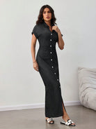 فستان جينز صيفي نسائي بأكمام قصيرة وقصة ضيقة وعصرية، بصف أزرار واحد.