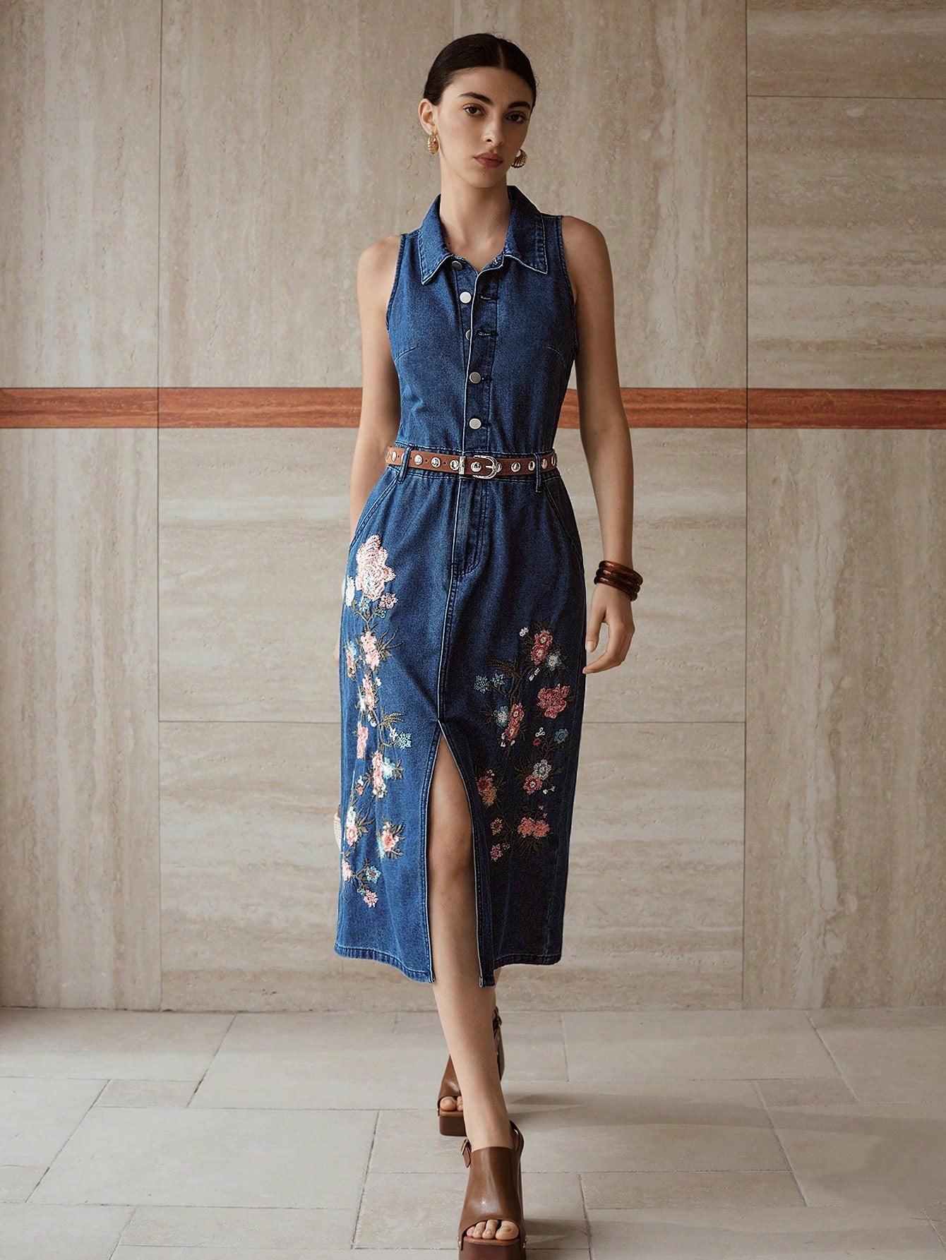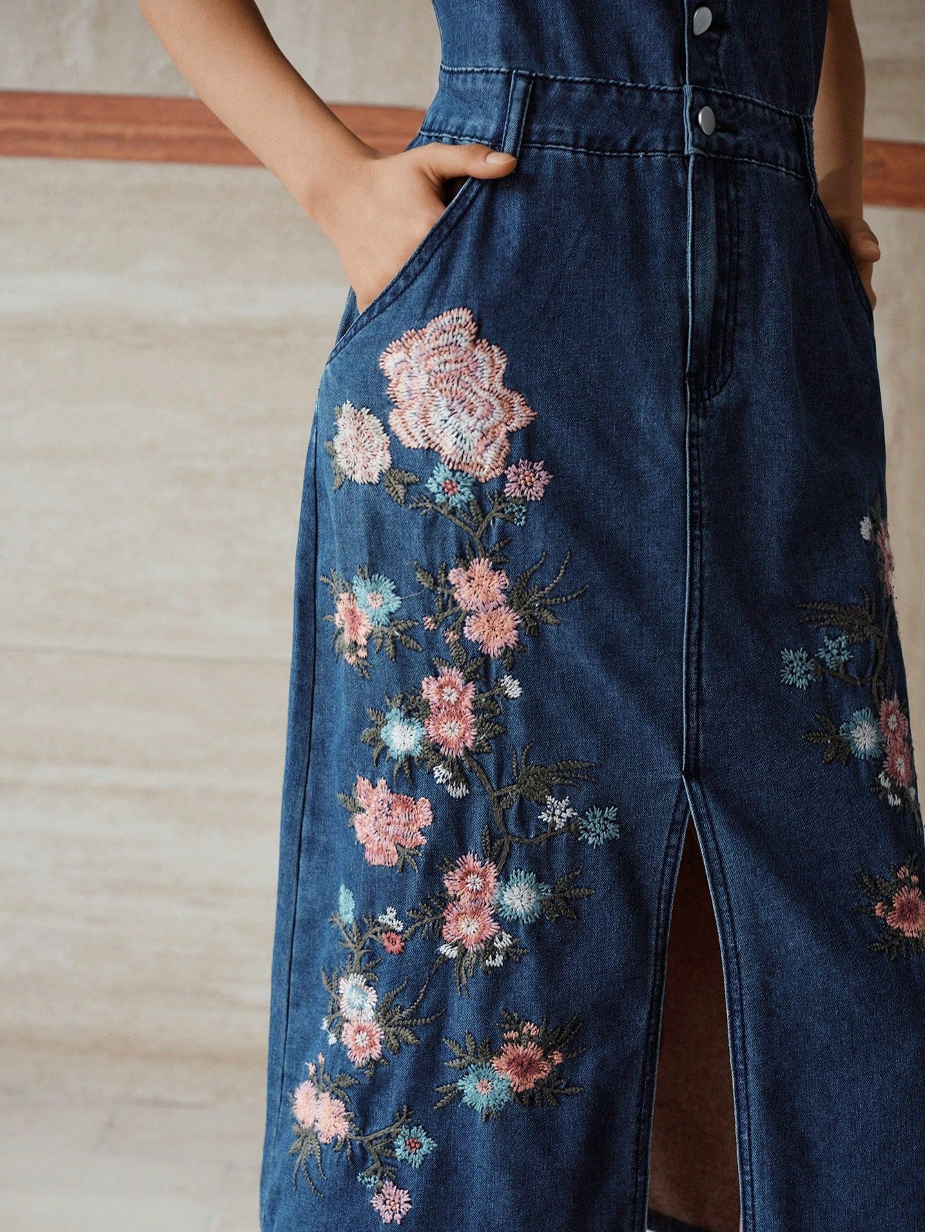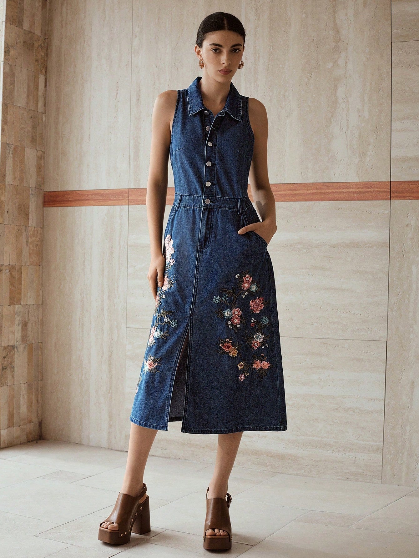 MOTF PREMIUM EMBROIDERY SPLIT DENIM DRESS