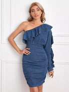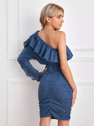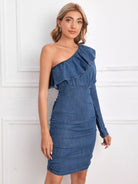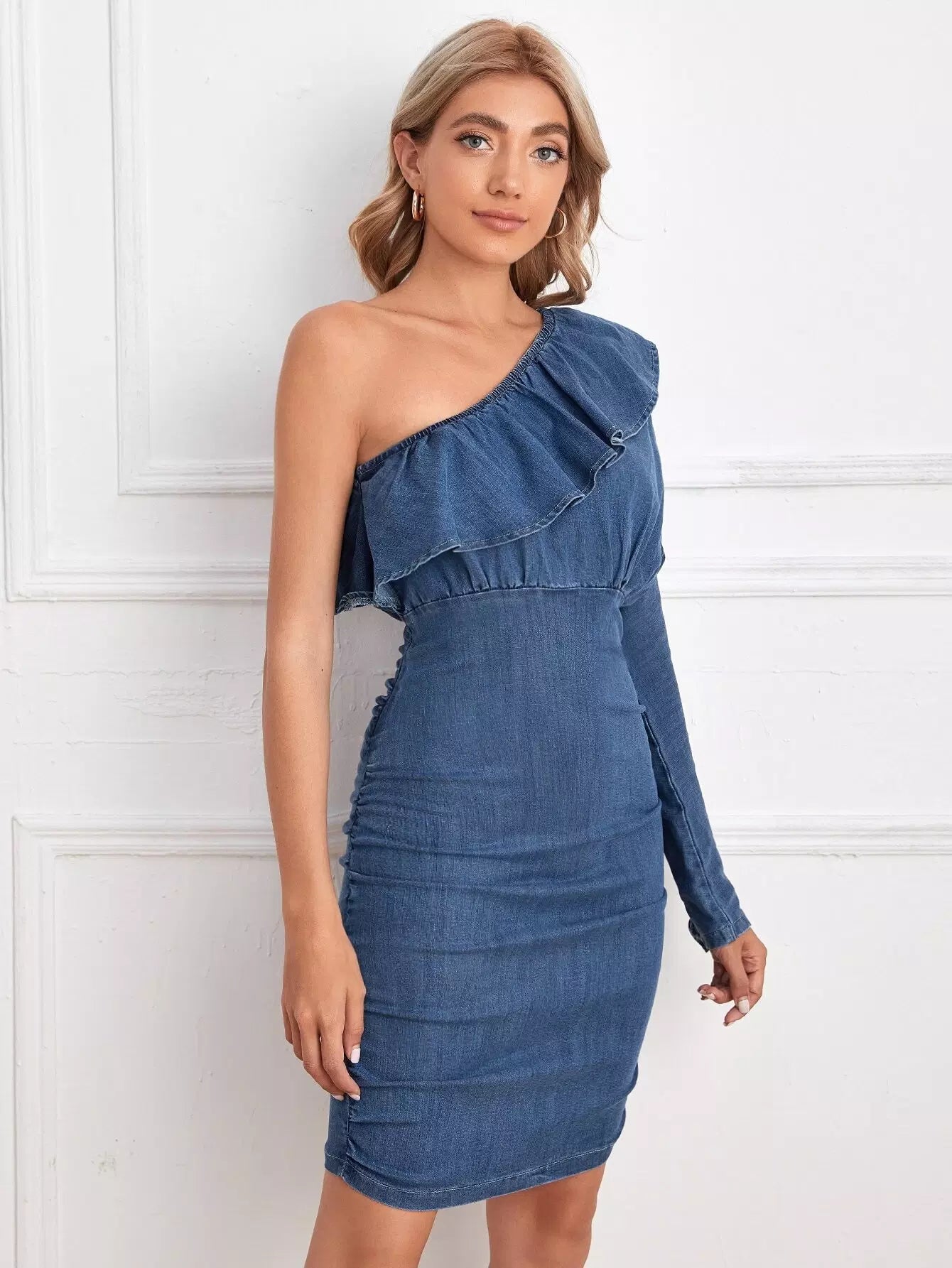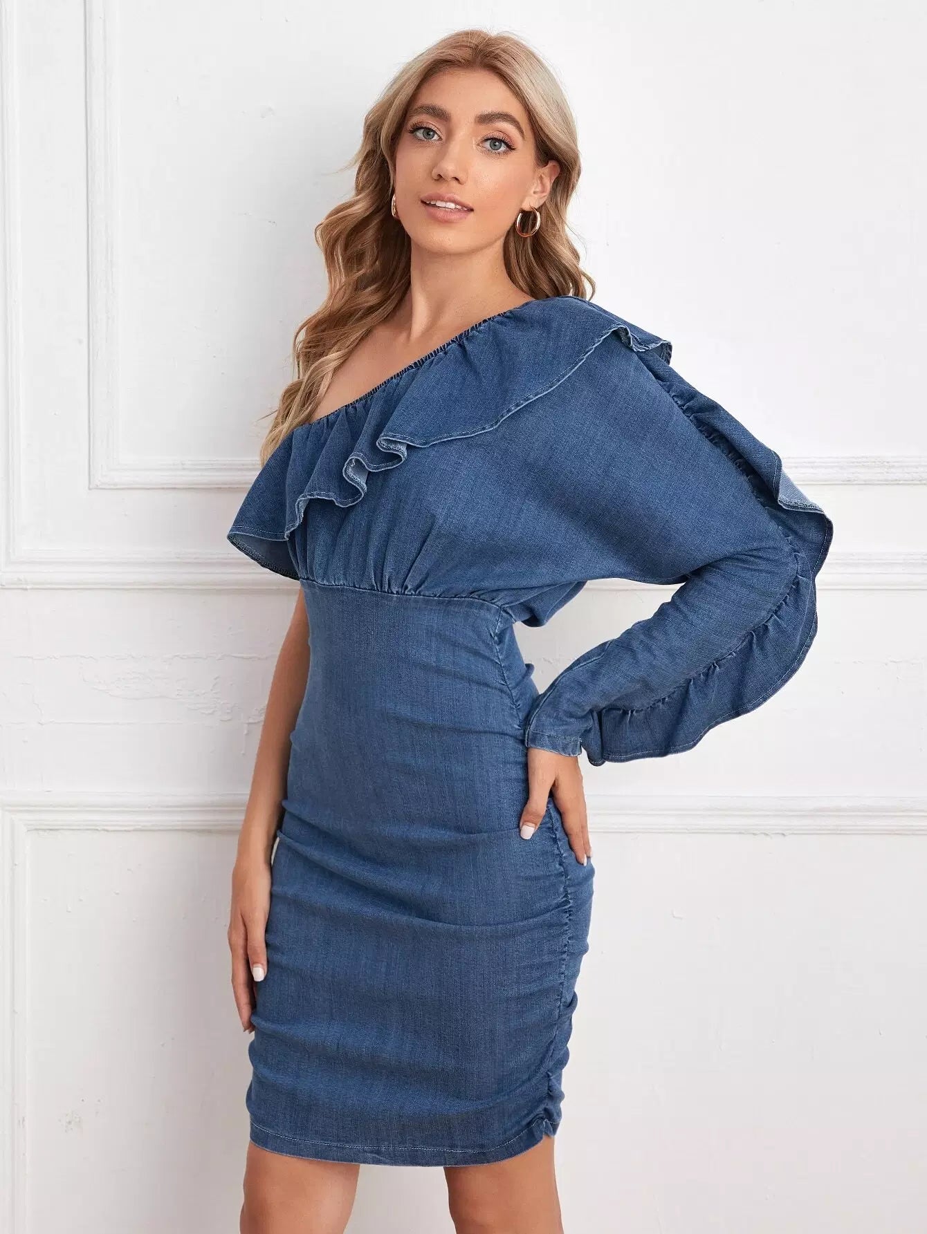 فستان دنيم مكشكش بكتف واحد مزين بكشكش