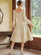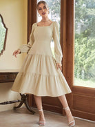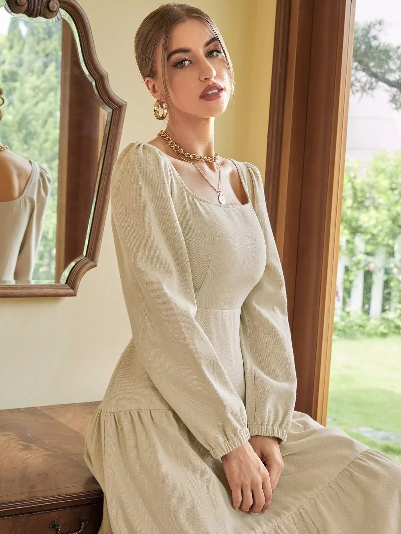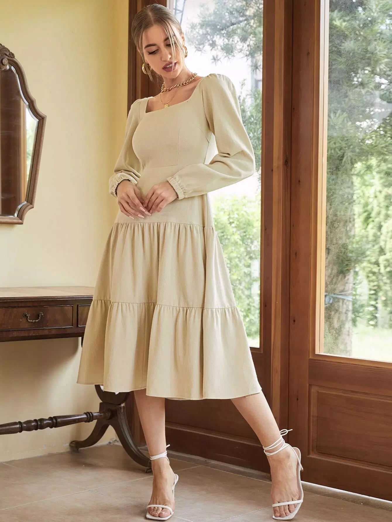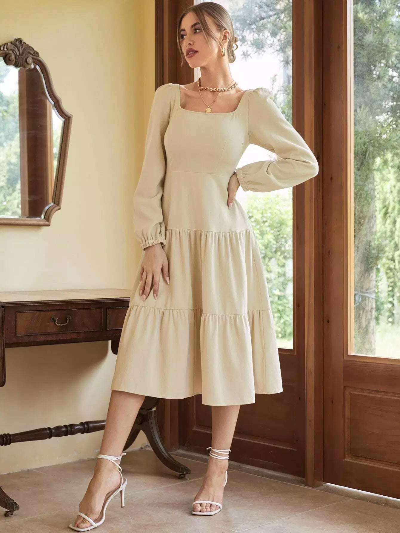فستان دنيم بأكمام سادة بأكمام أسقف سادة بحافة منفوشة