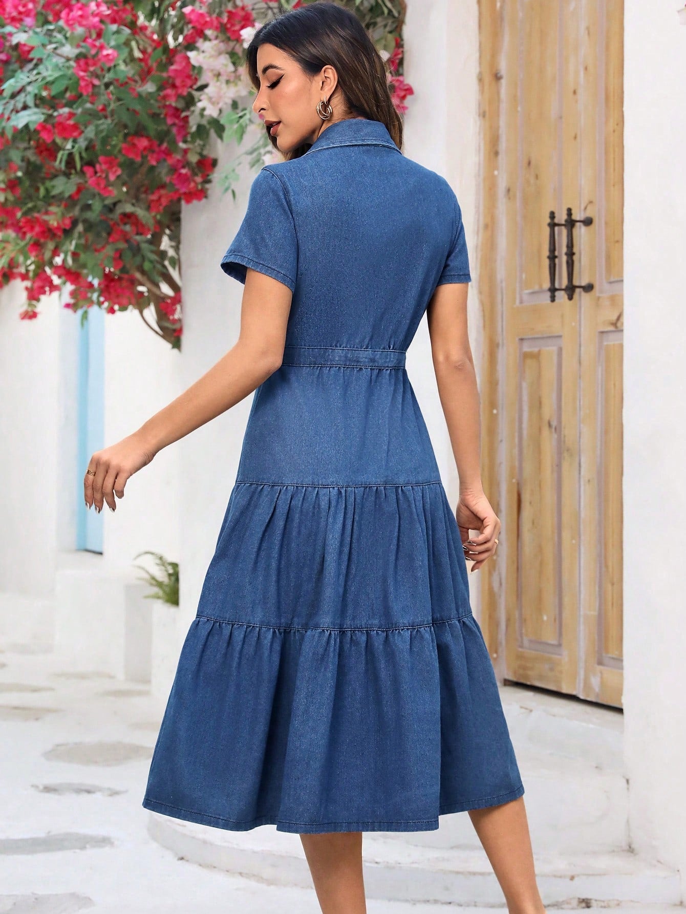 Vivid Eden Women's Button-Down Denim Dress With Flap Pockets