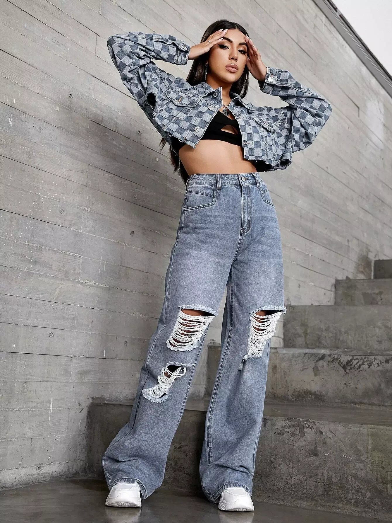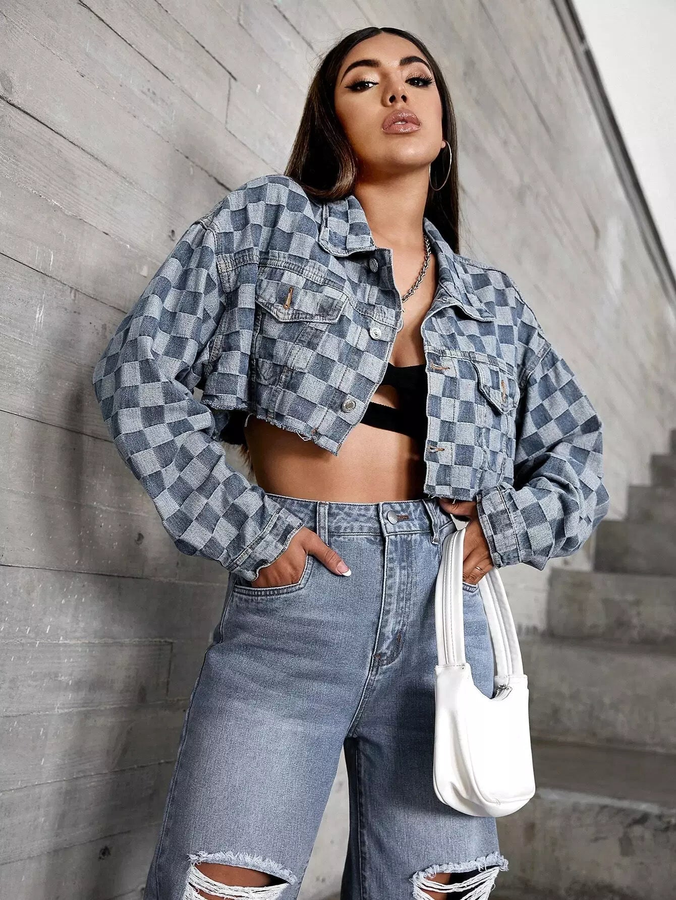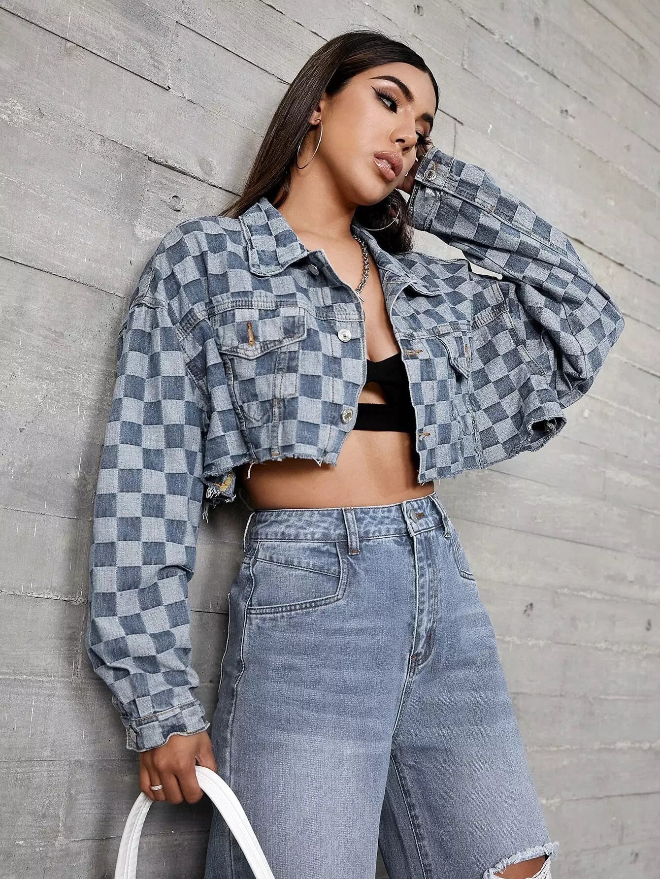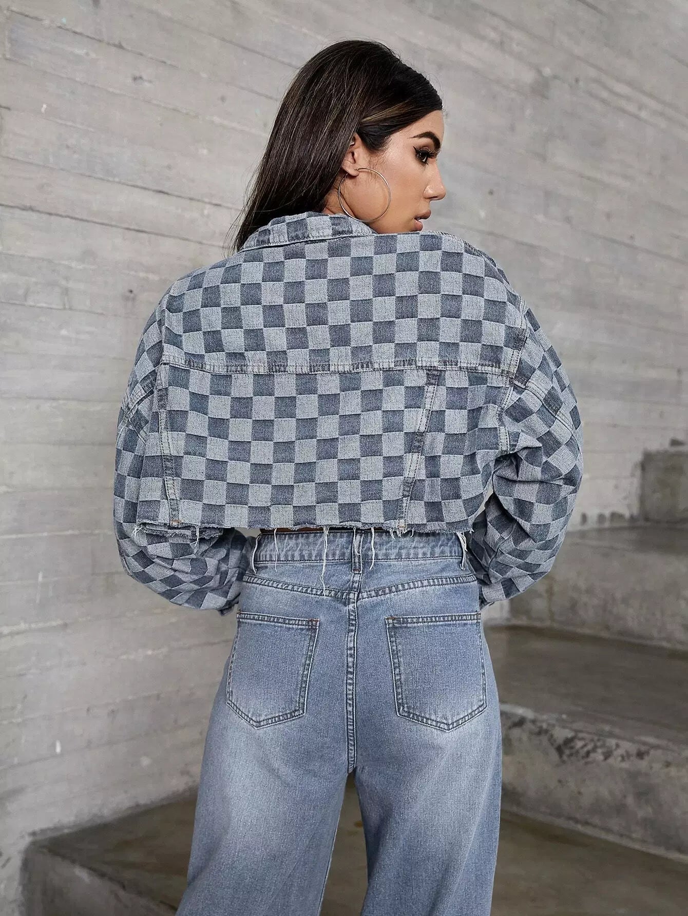 جاكيت دنيم بأزرار منقوشة على شكل رقعة شطرنج منقوشة