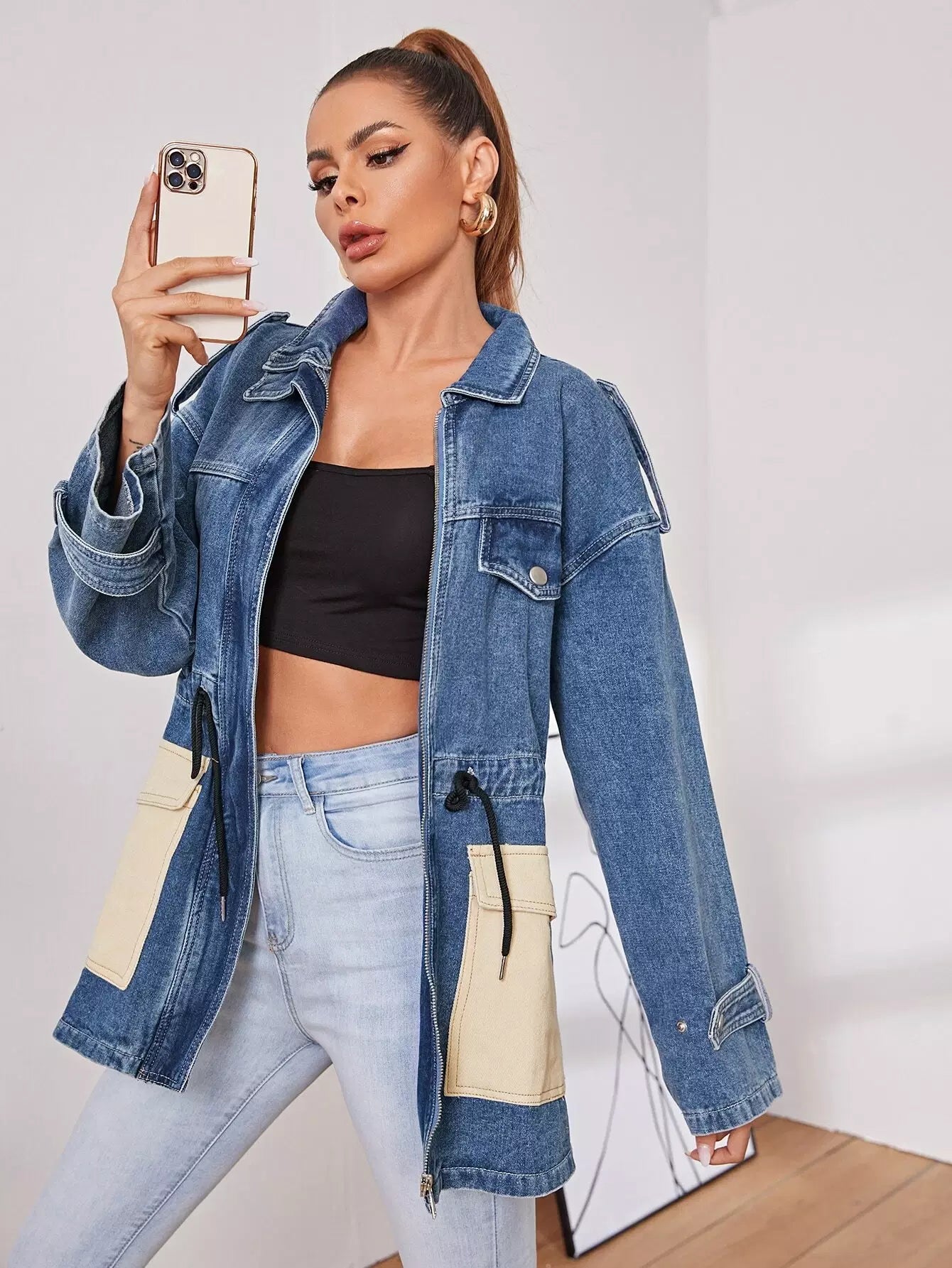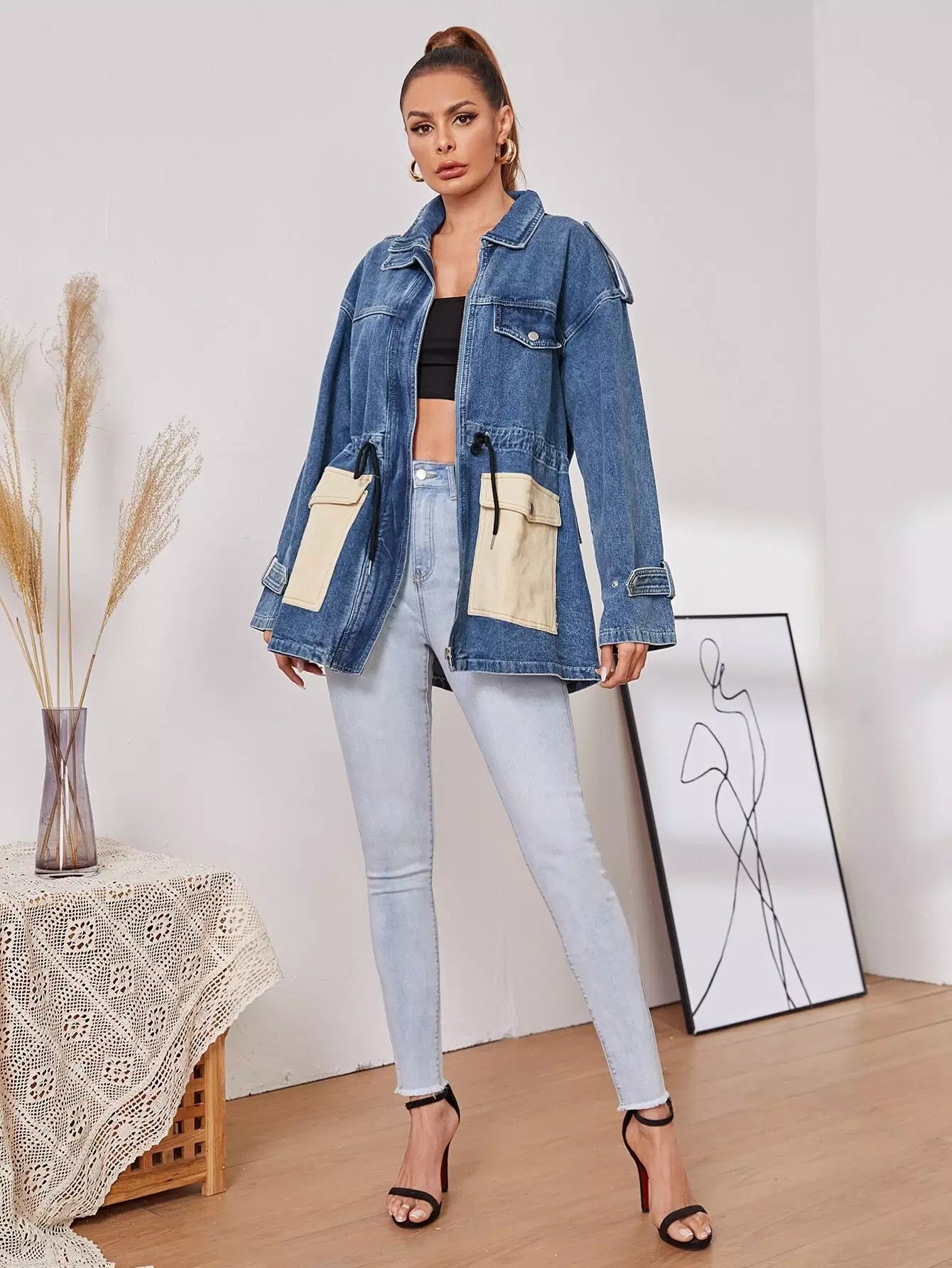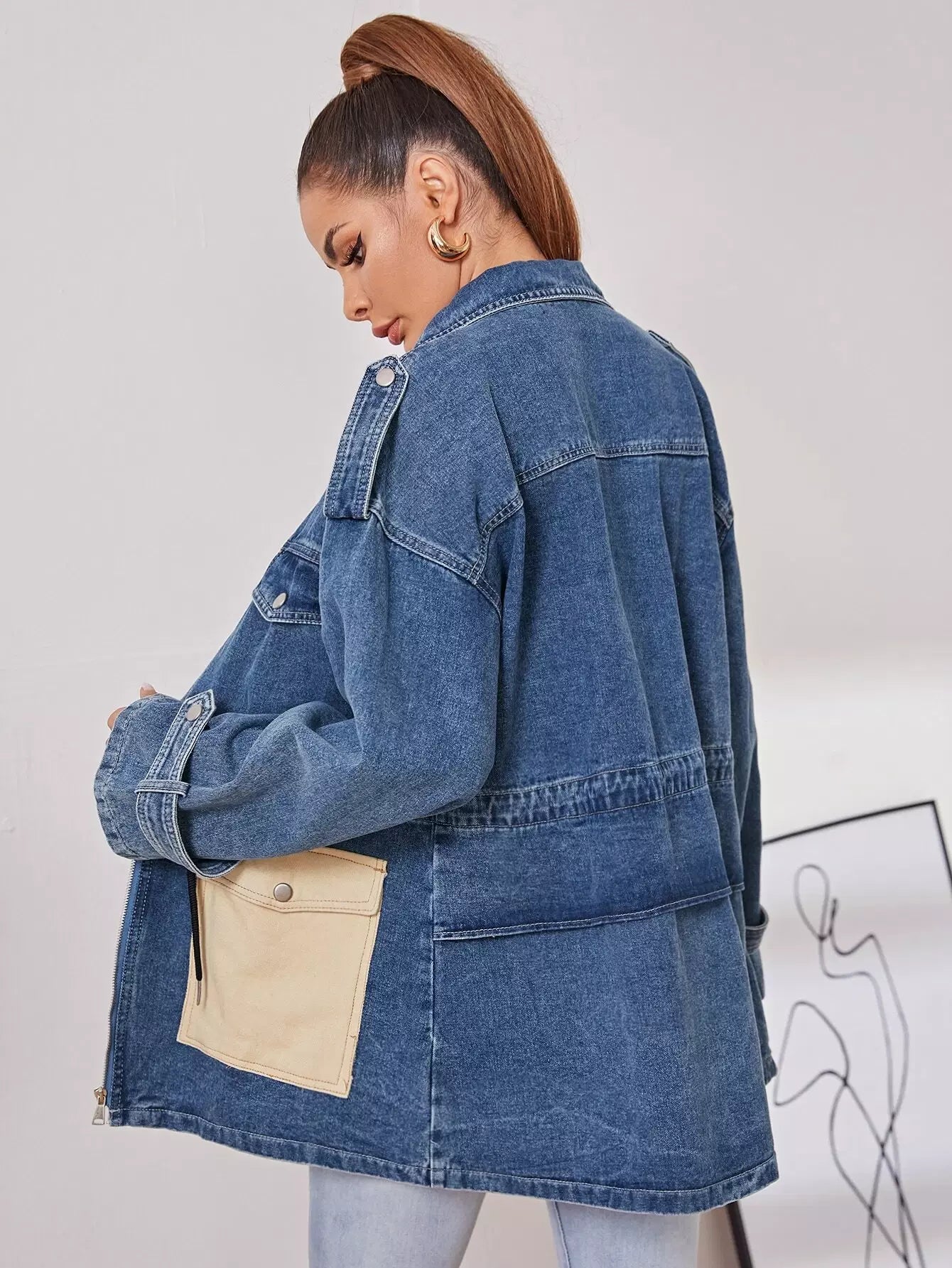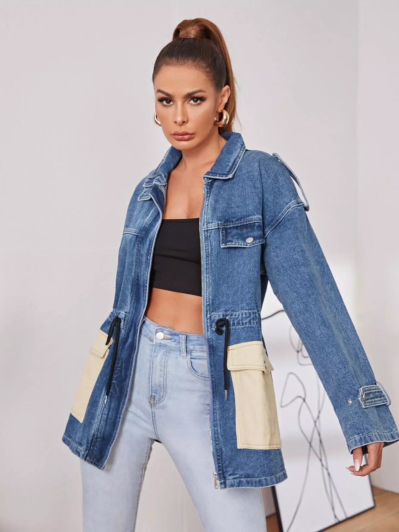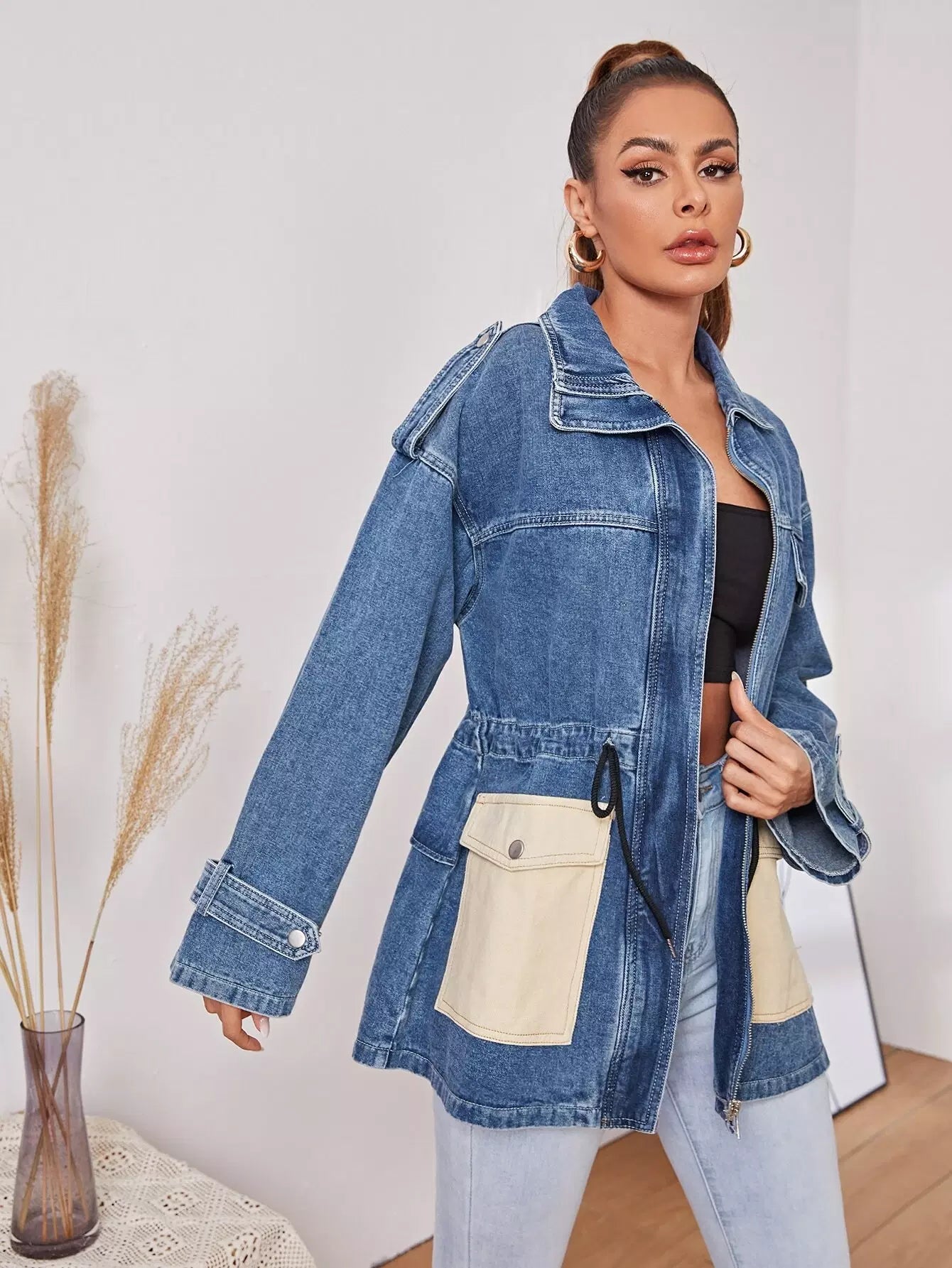 جاكيت جينز برباط على الخصر بجيب بغطاء رباط على شكل رفرف