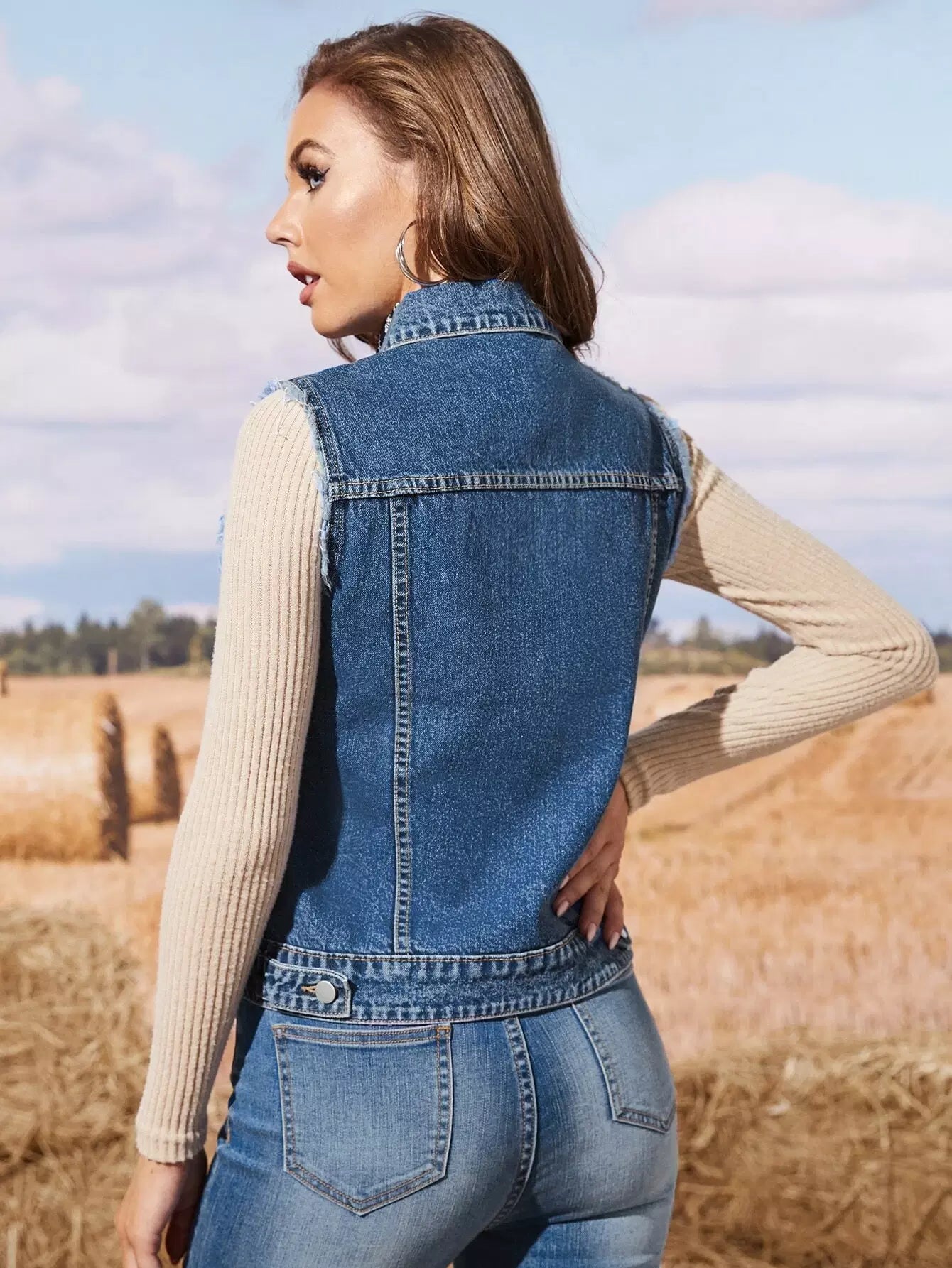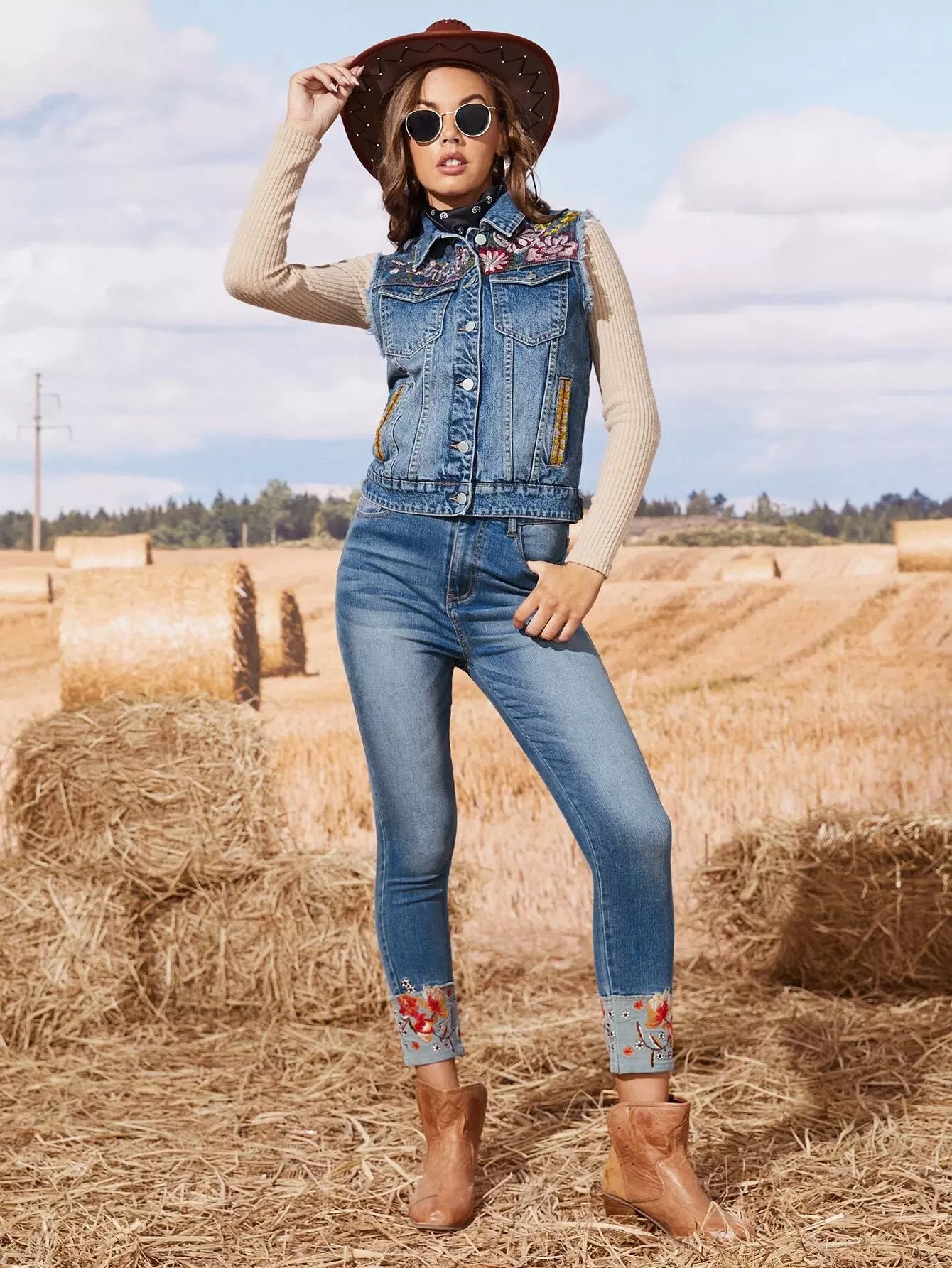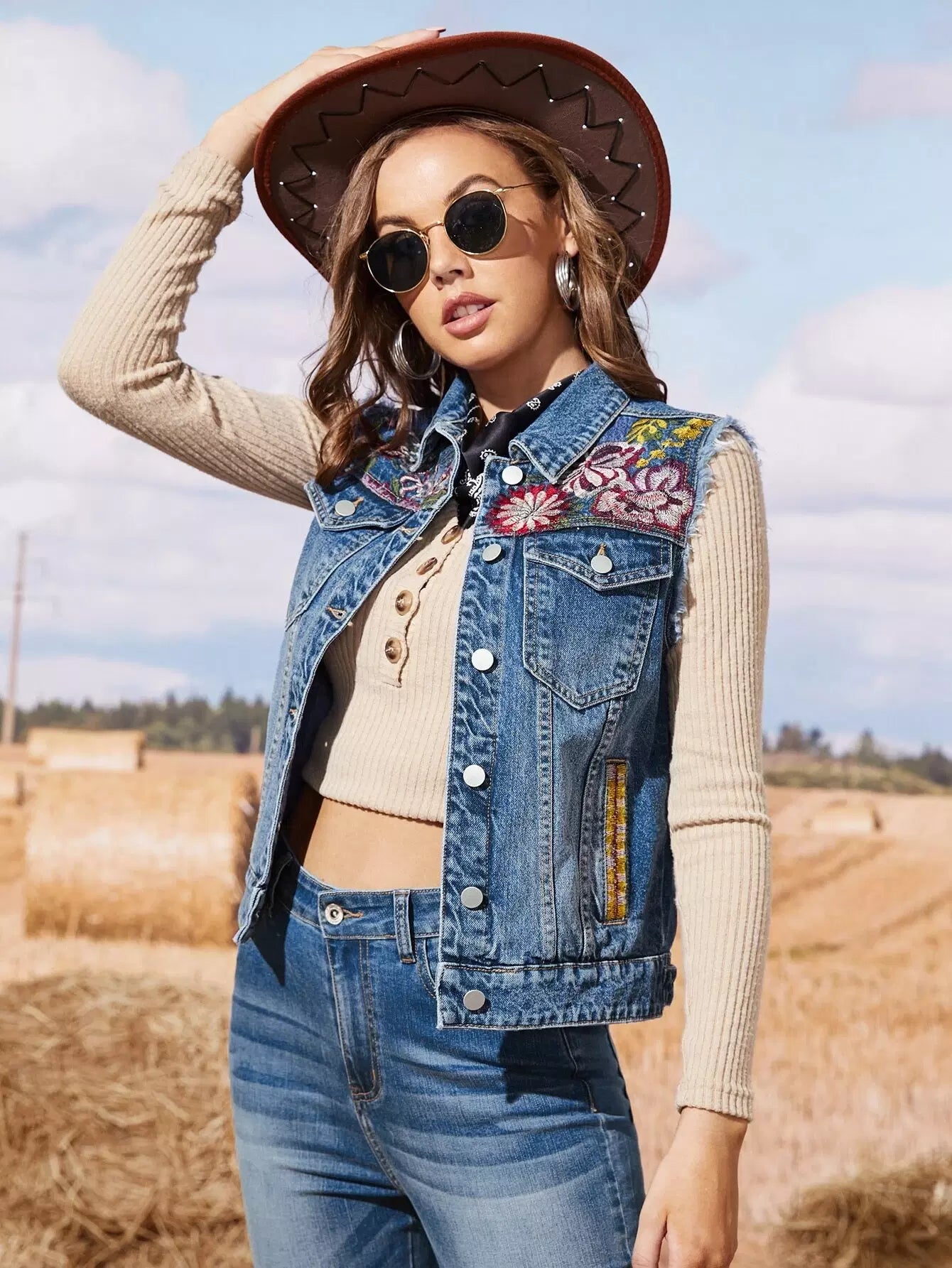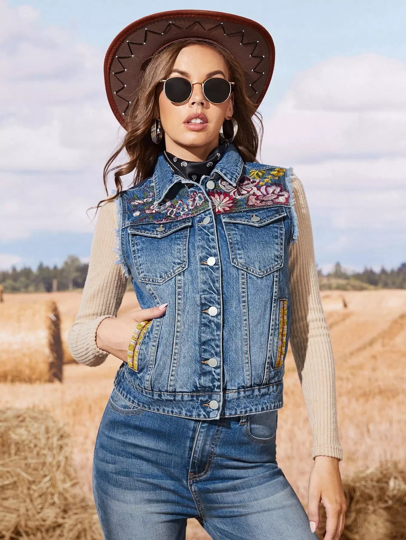 سترة جينز بدون أكمام مطرزة بالزهور