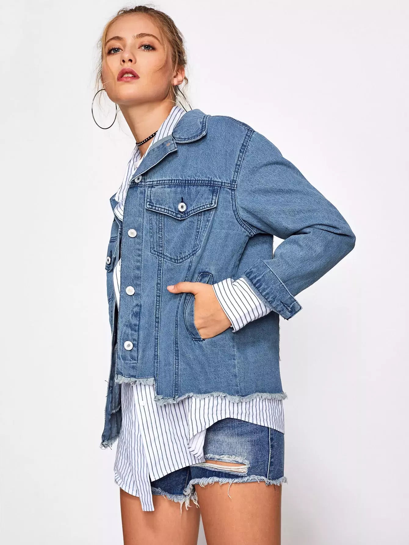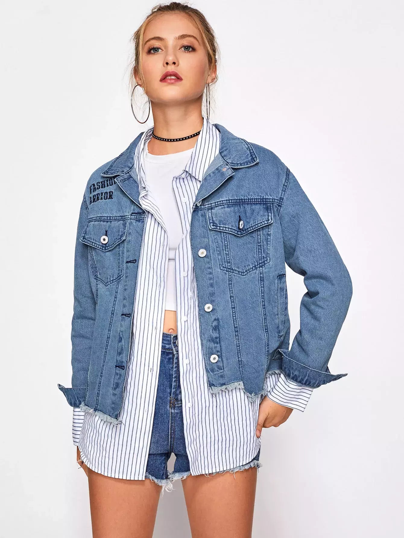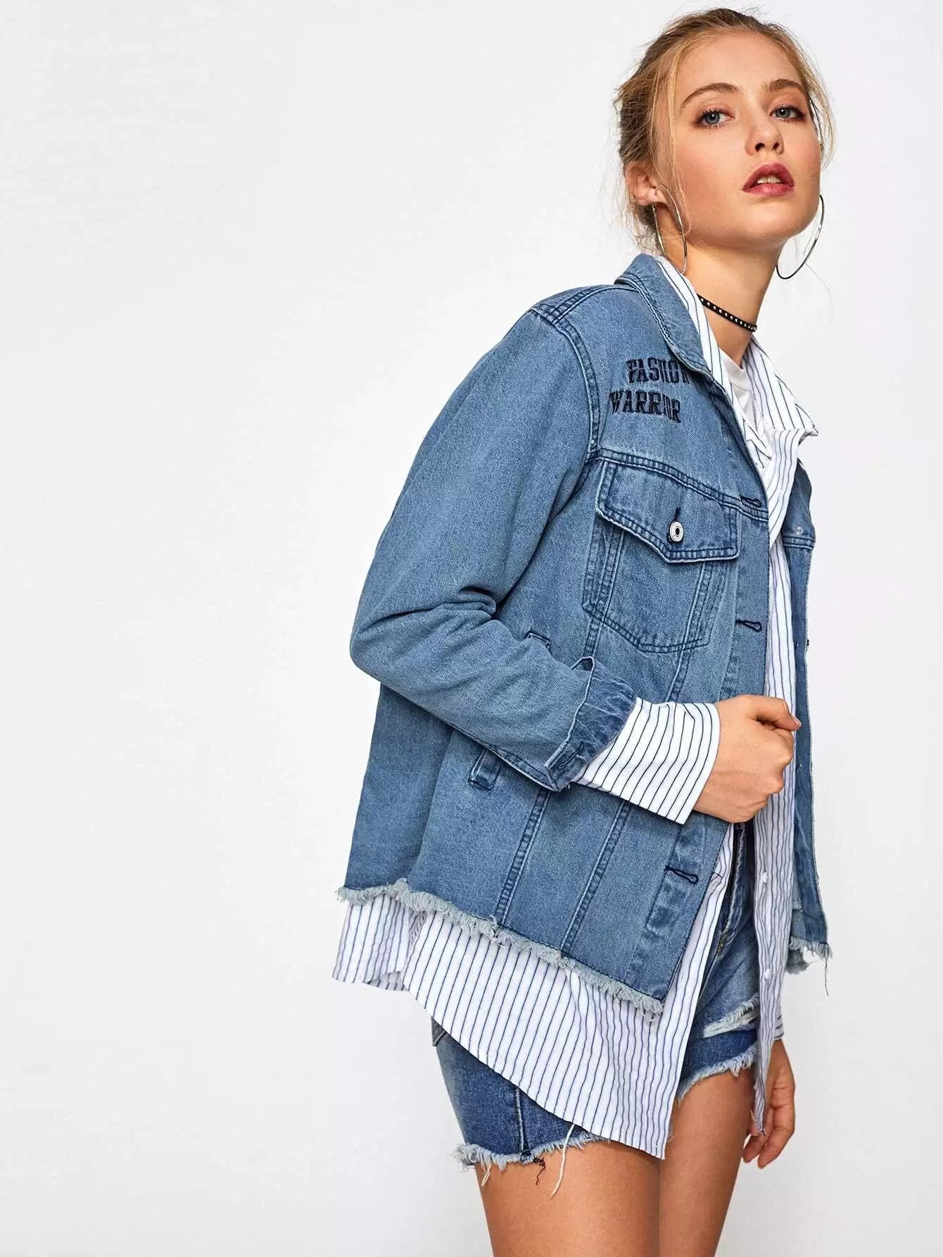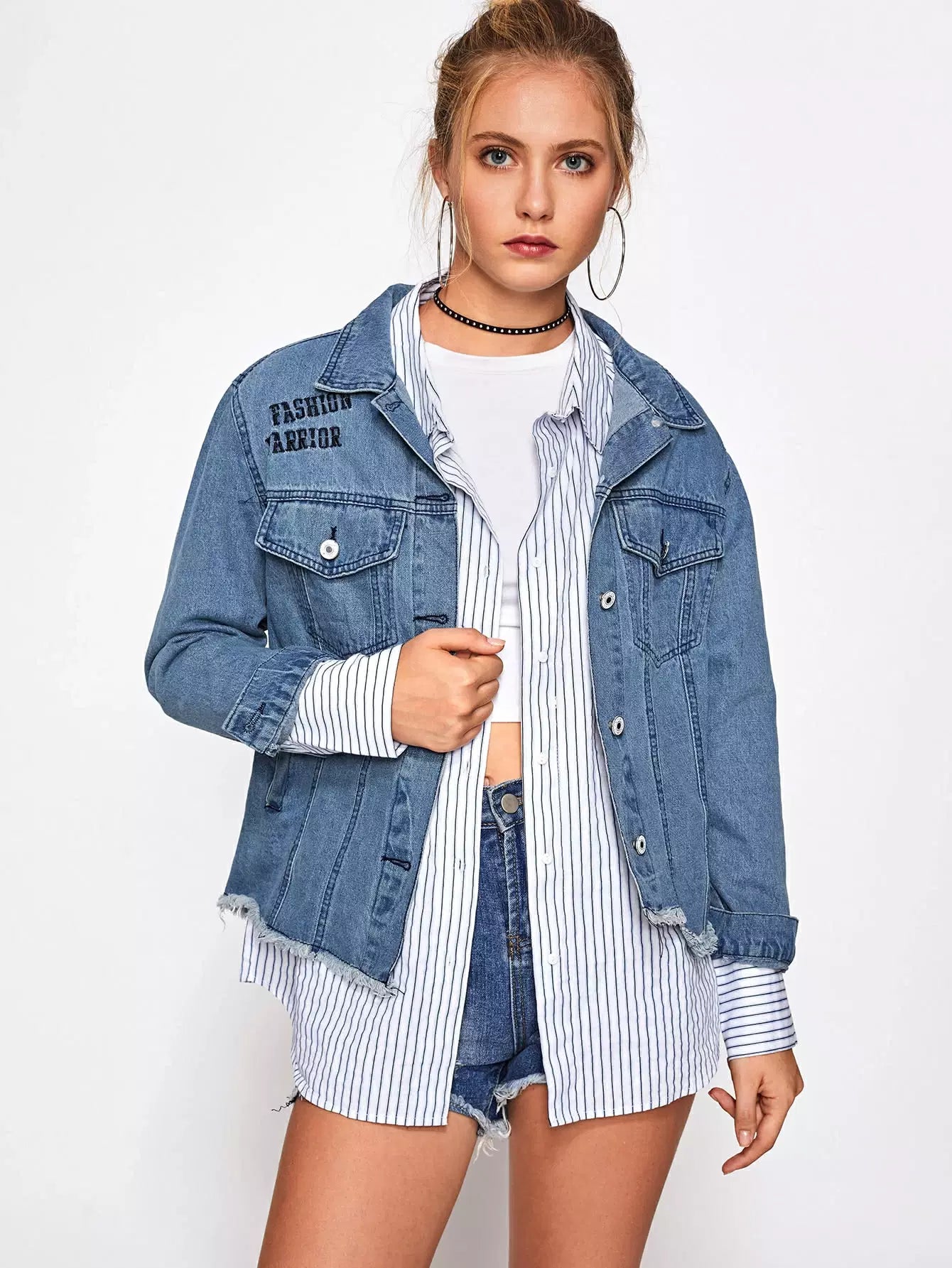 النساء - سترة الدنيم المتعثرة بطباعة فن البوب