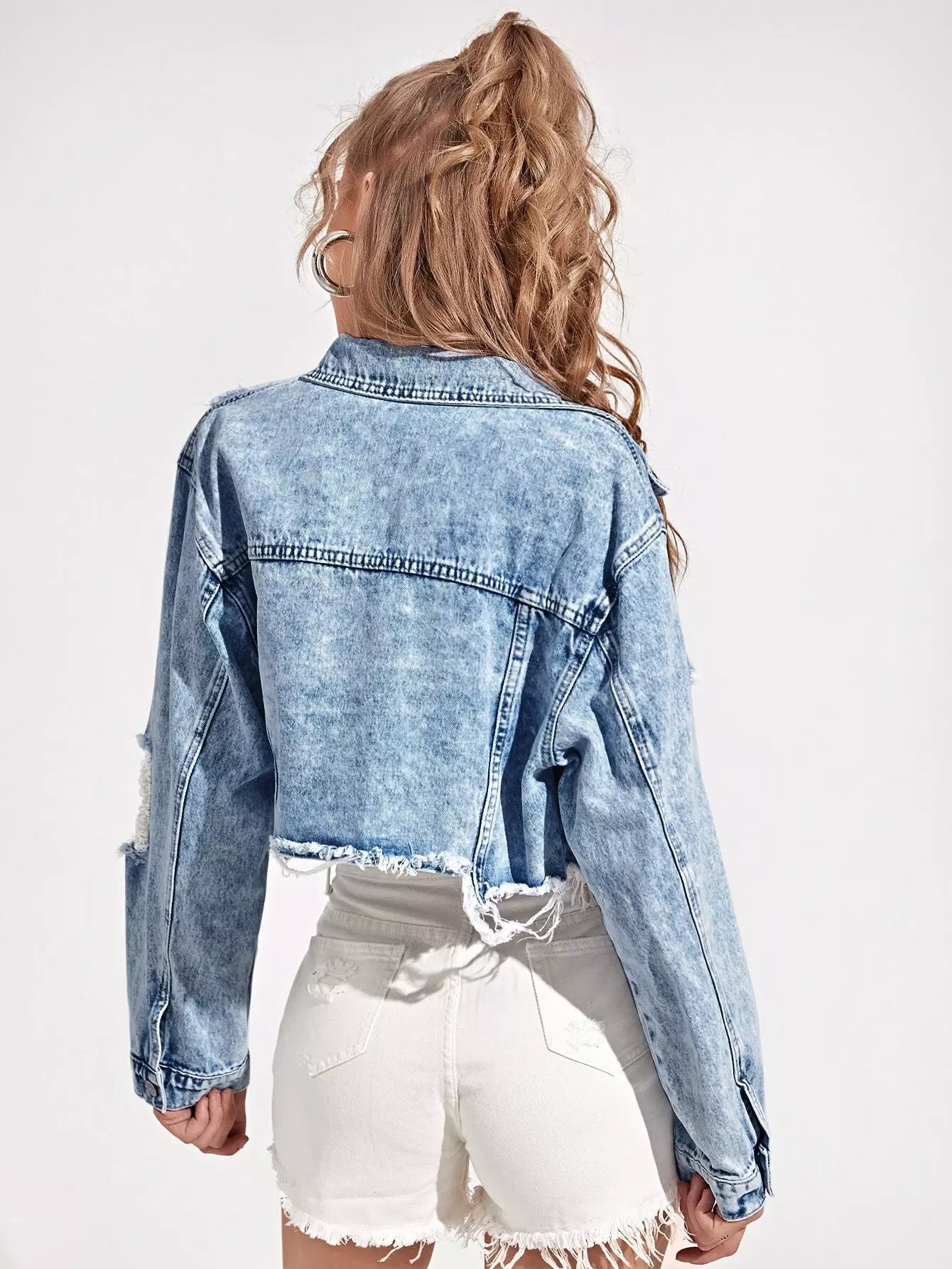 جاكيت جينز جينز بفتحة جيب ممزق بفتحة جيب ممزق
