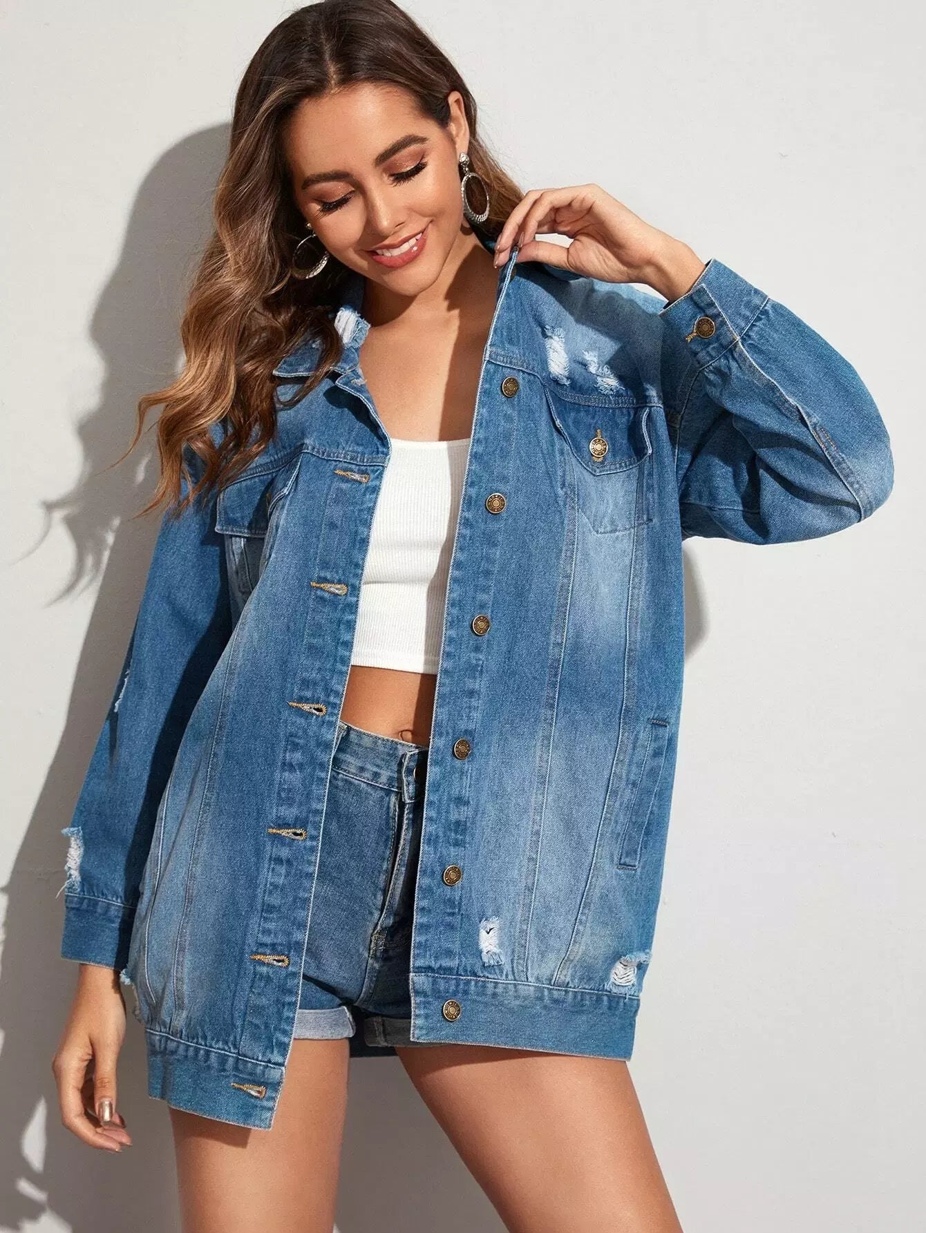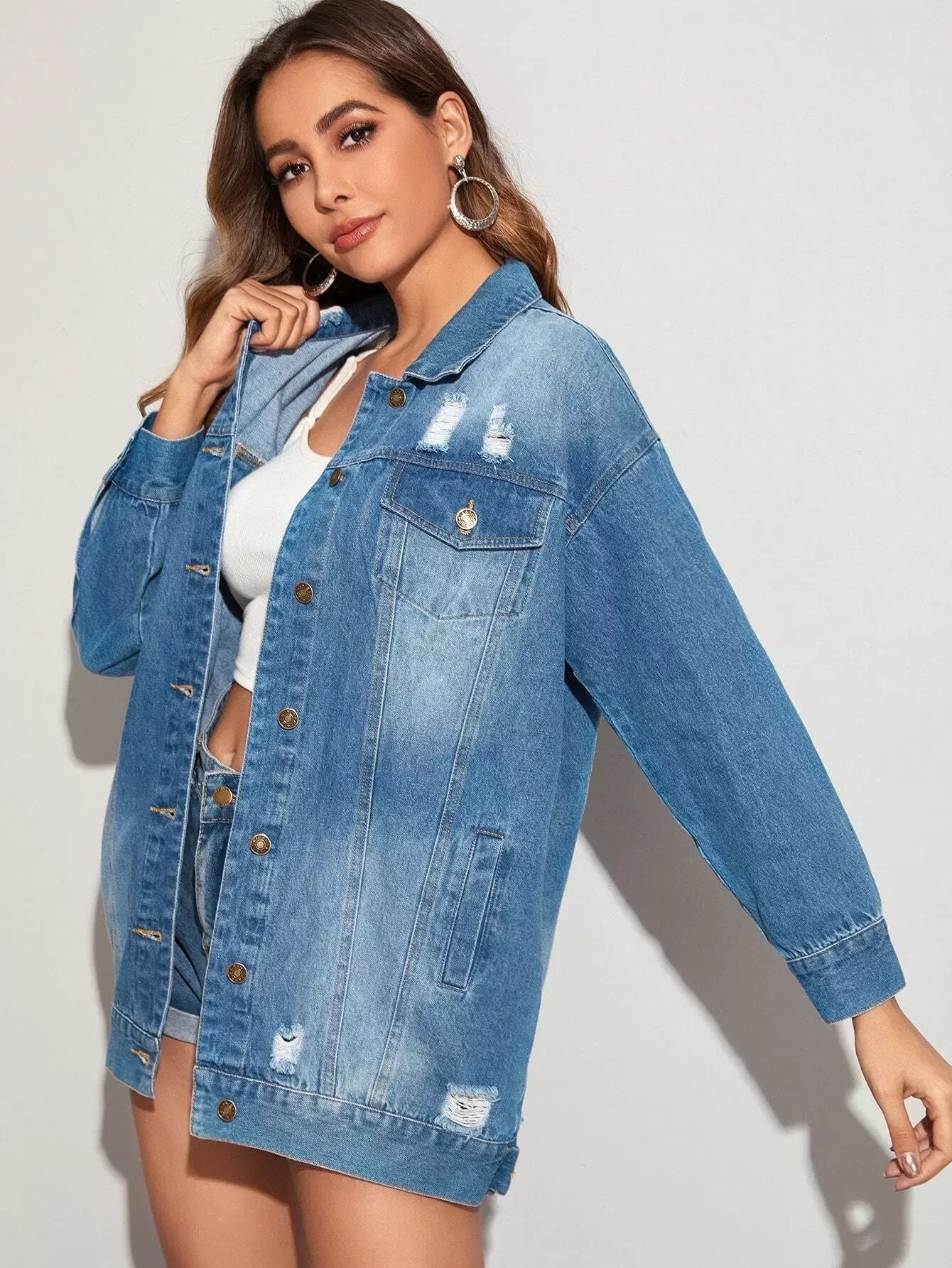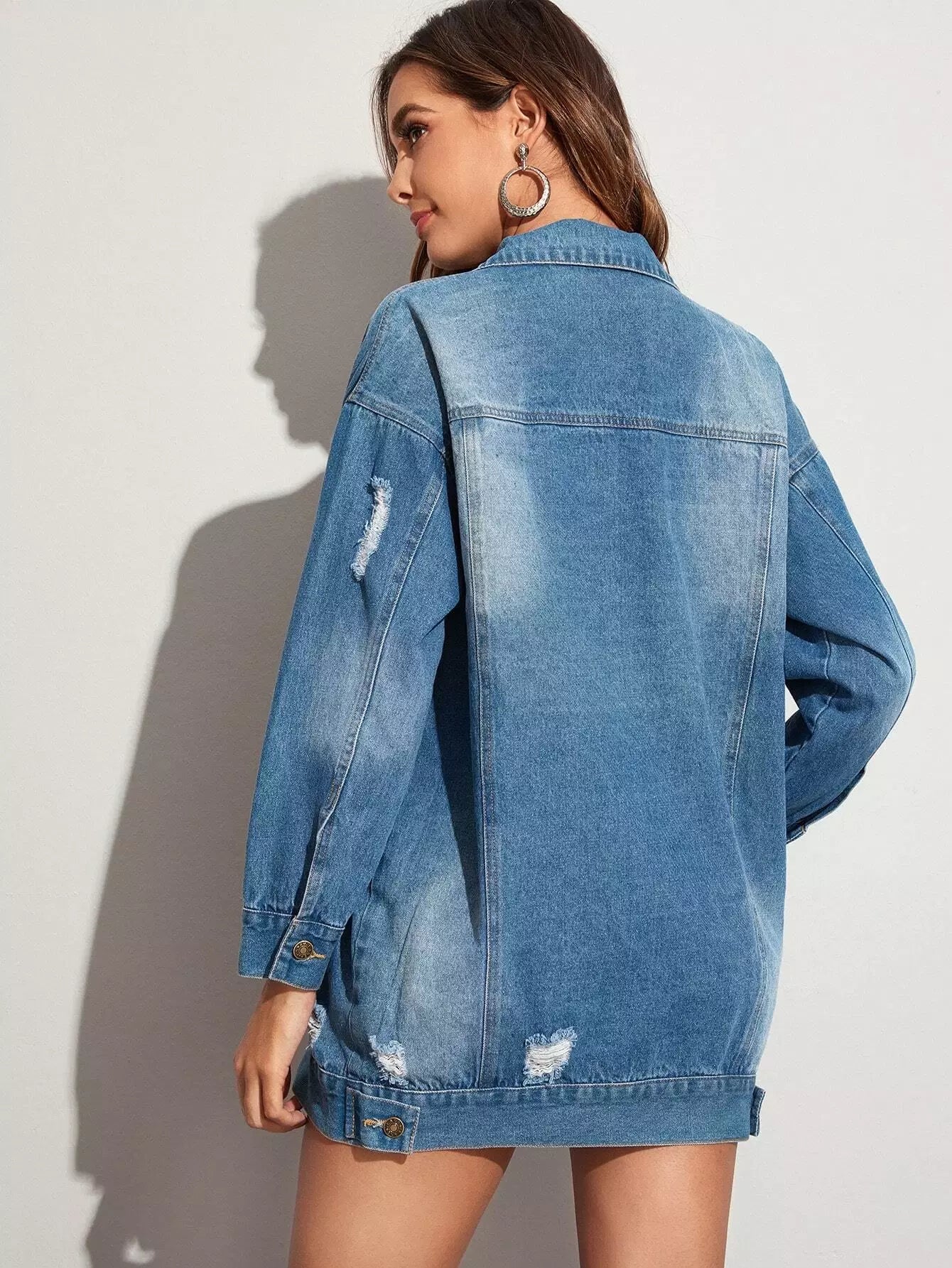جاكيت جينز ممزق بجيب ممزق بغطاء جينز ممزق