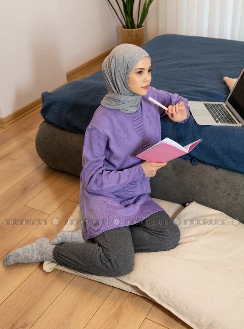 معلومات القماش: 50% أكريليك، 50% قطن. مقاس الموديل: مقاس: 36، الارتفاع: 176 سم، الصدر: 88 سم، الخصر: 60 سم، الأرداف: 90 سم