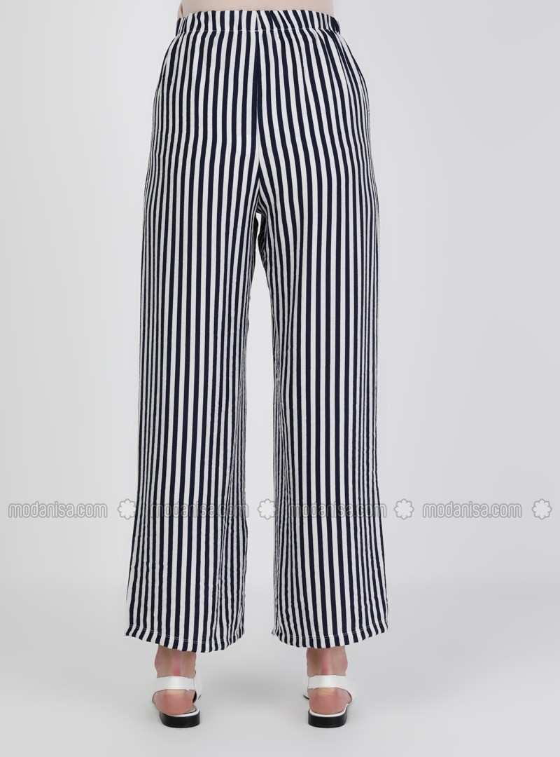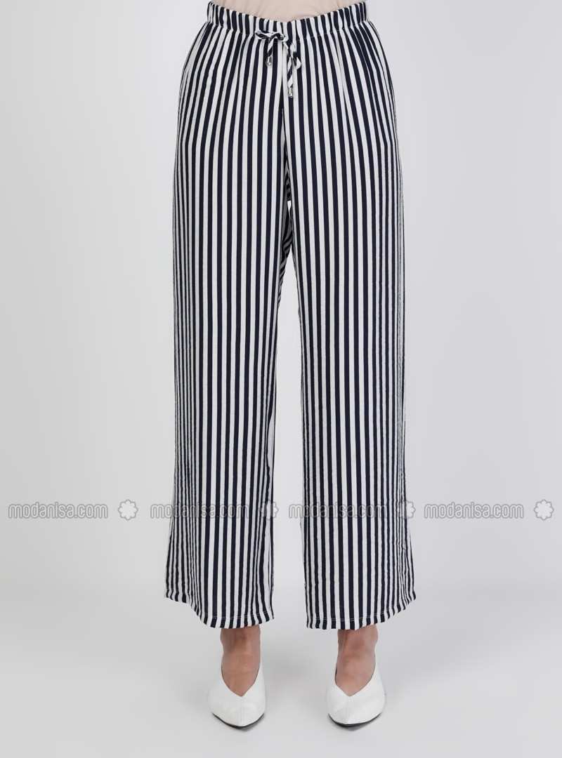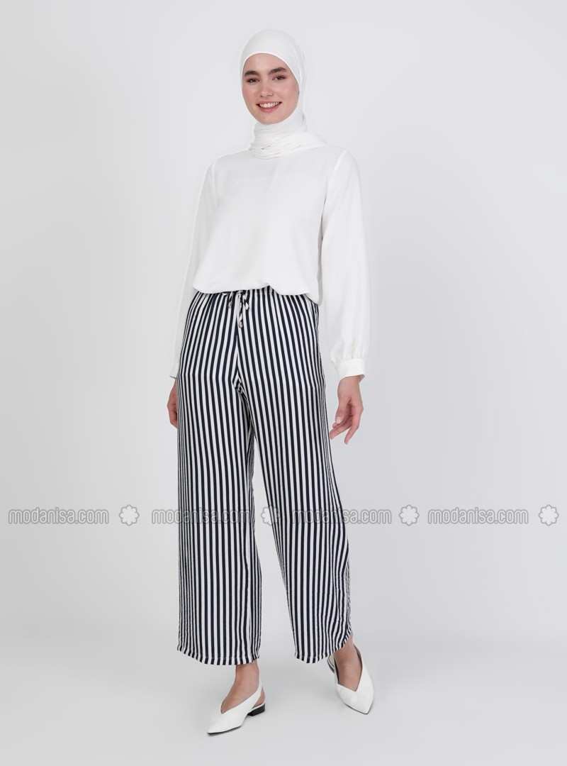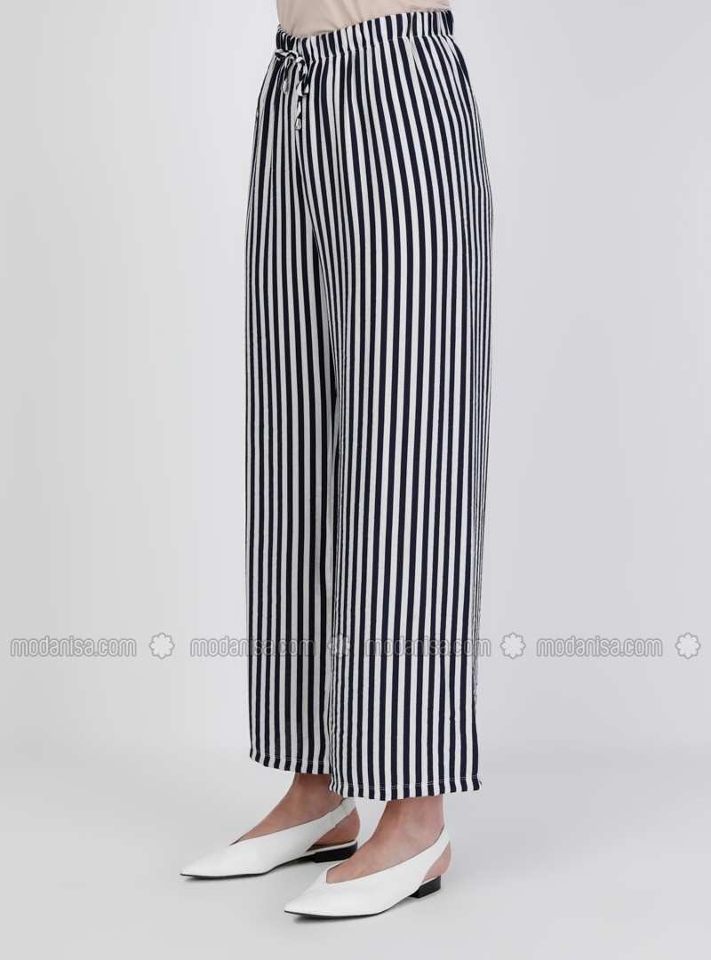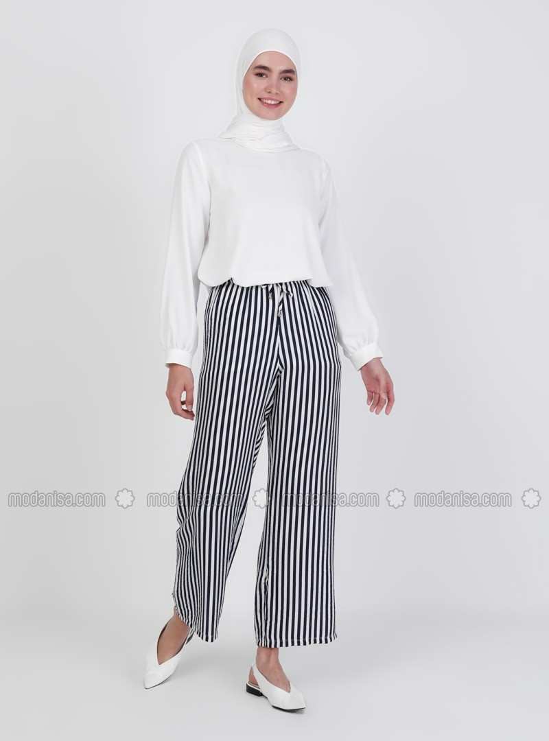 هذا الطراز باللونين الأزرق الداكن والأبيض مصنوع من القطن ويتميز بقصة واسعة جذابة تناسب أي مناسبة غير رسمية أو أنيقة.