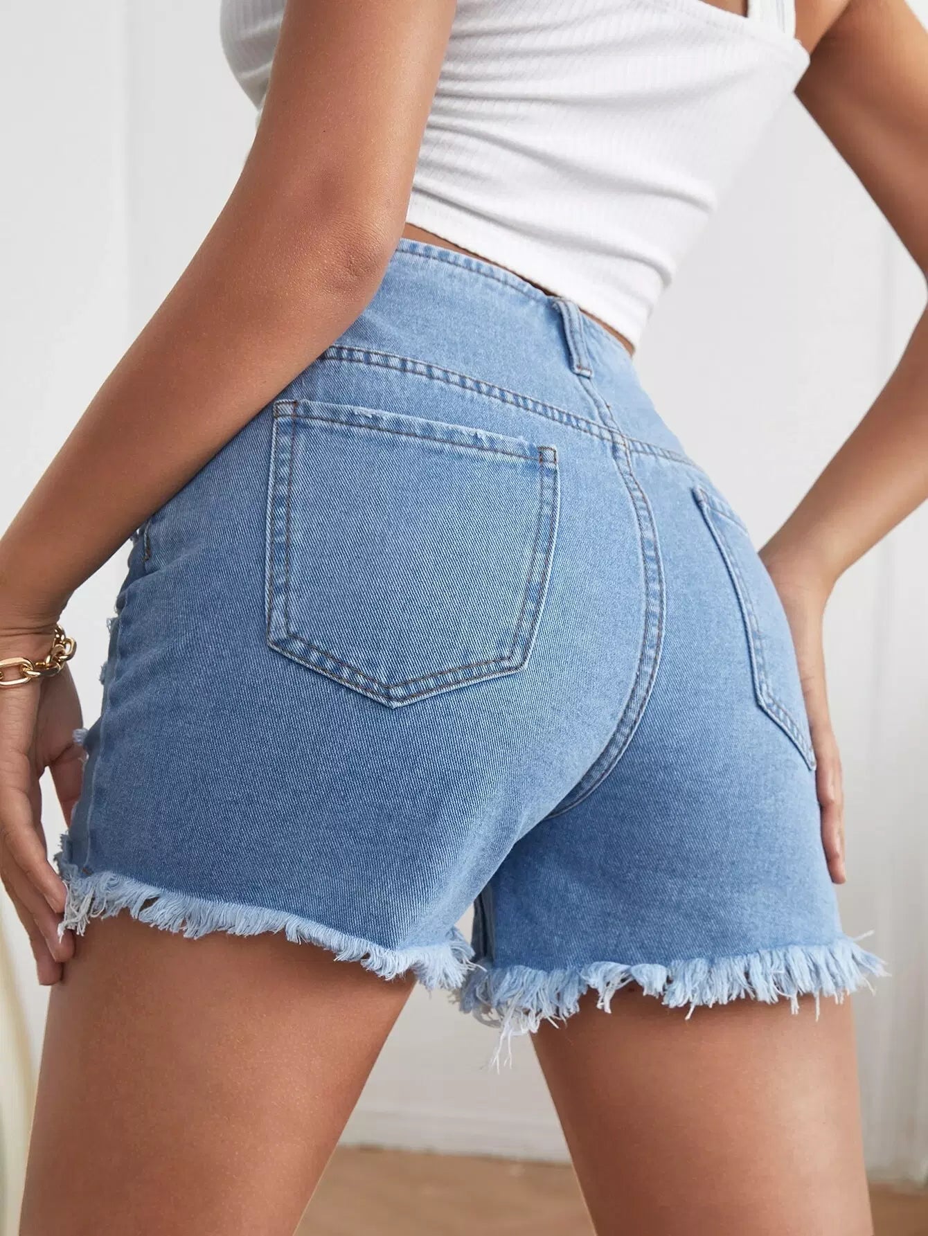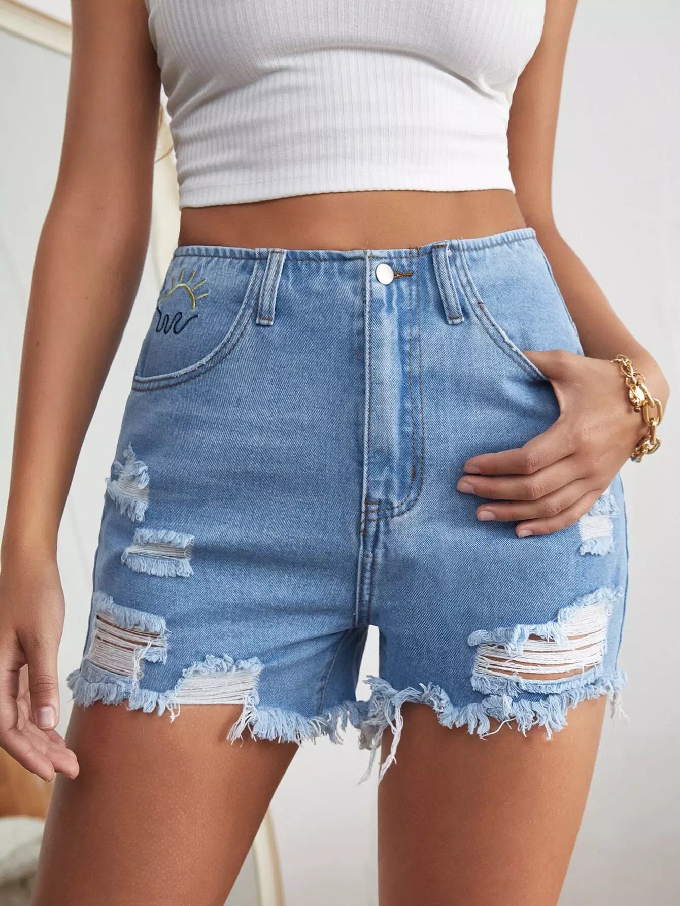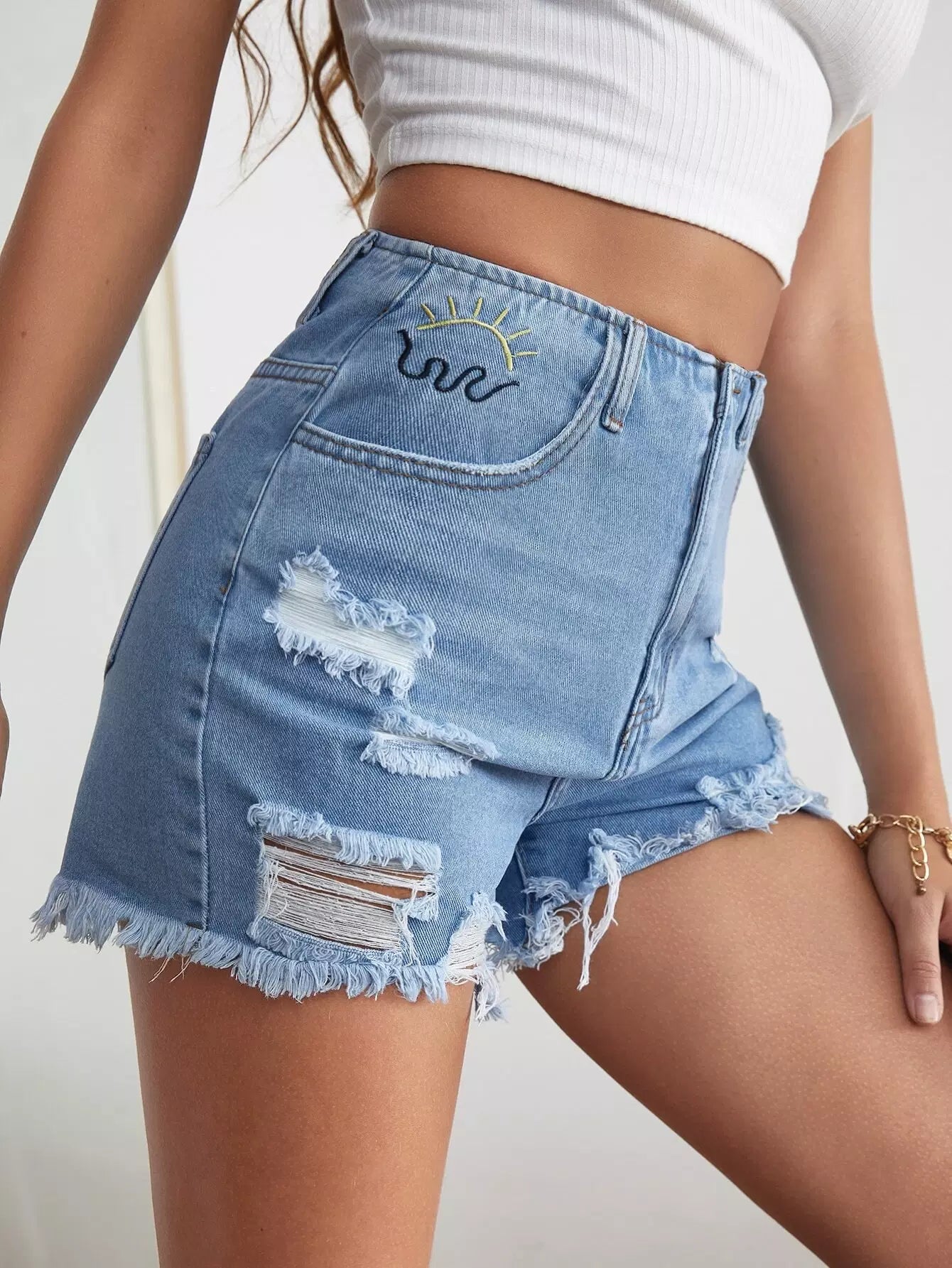 شورت جينز دنيم ممزق بتطريزات جرافيك بحافة خام