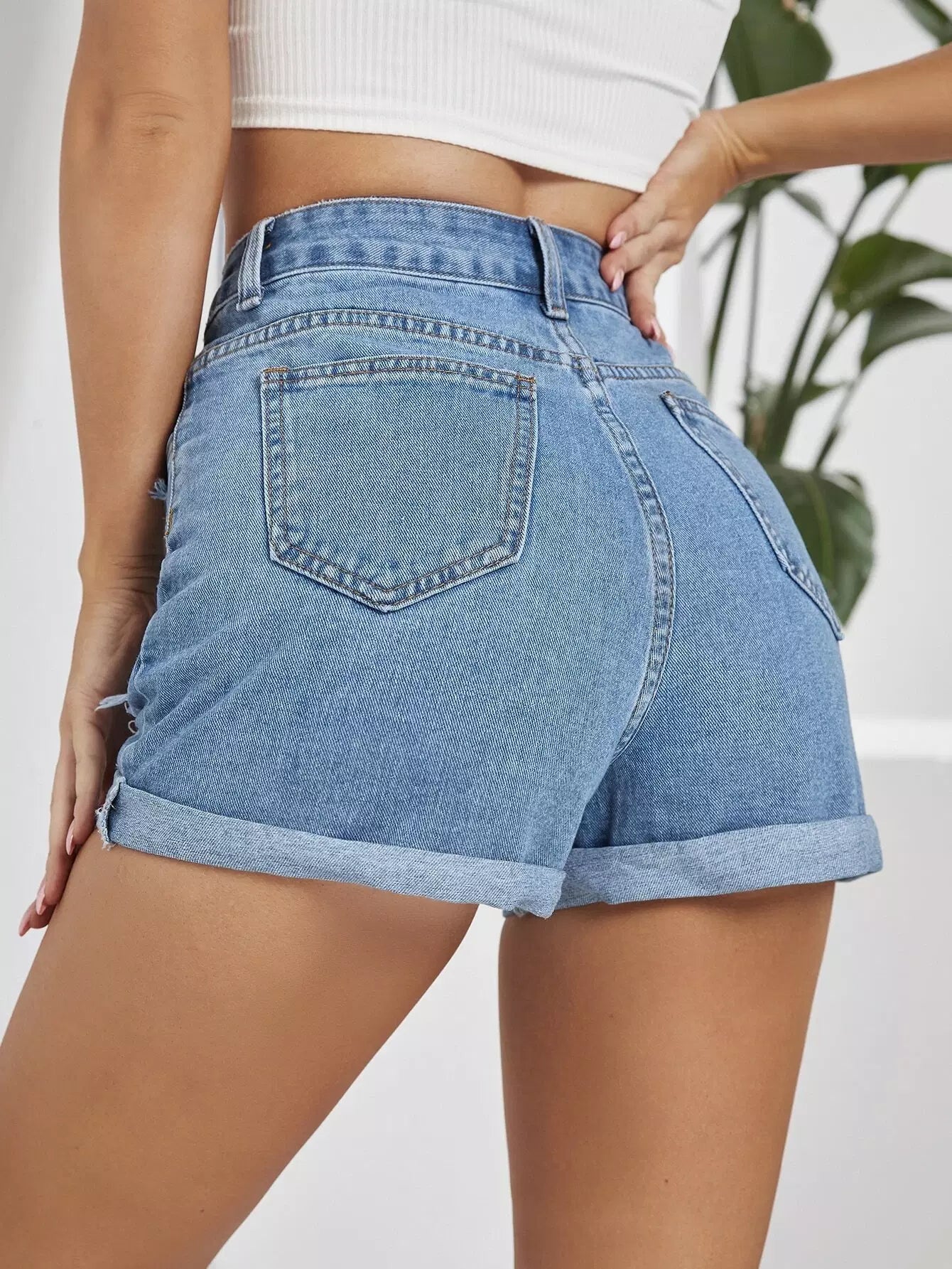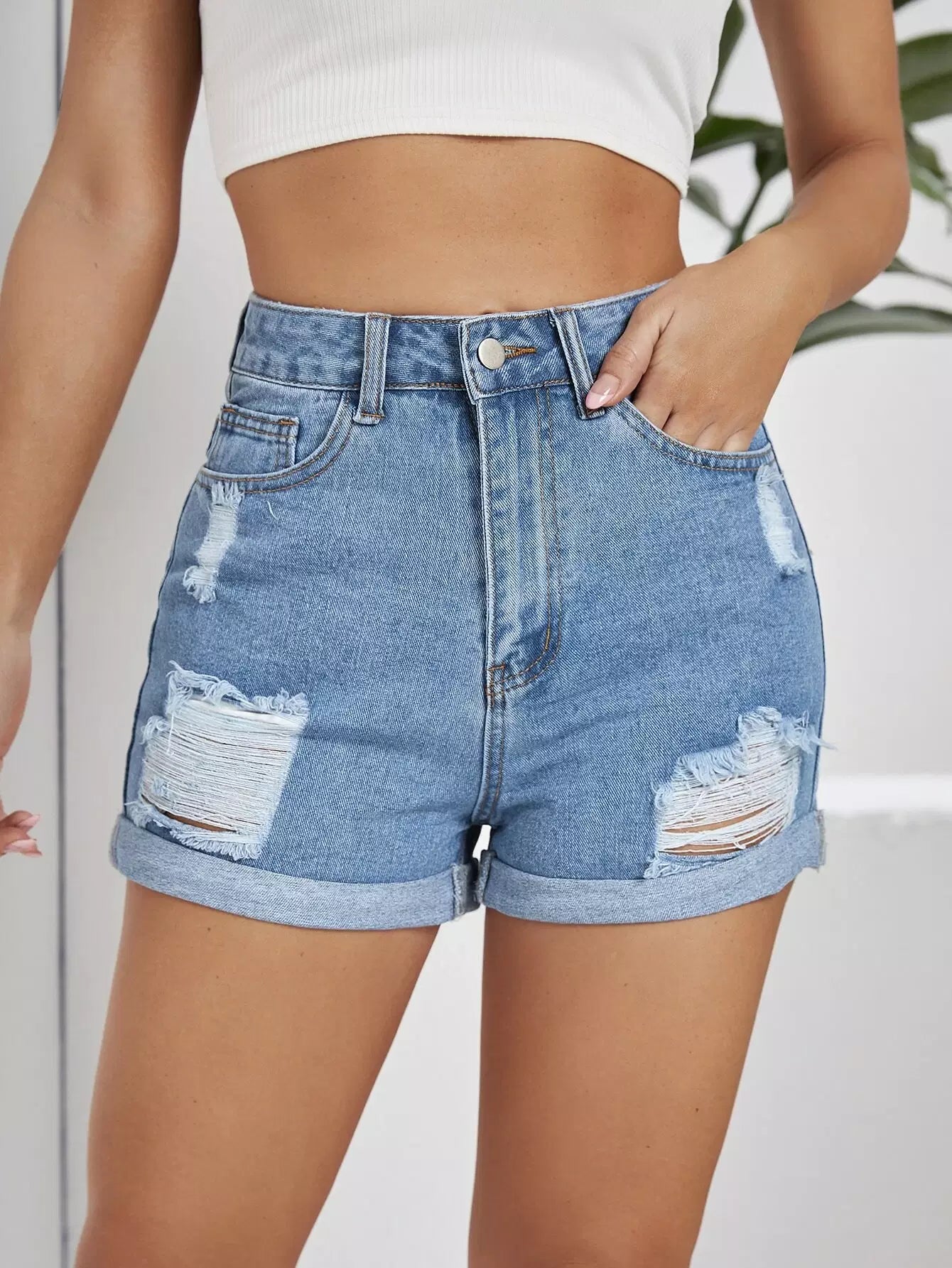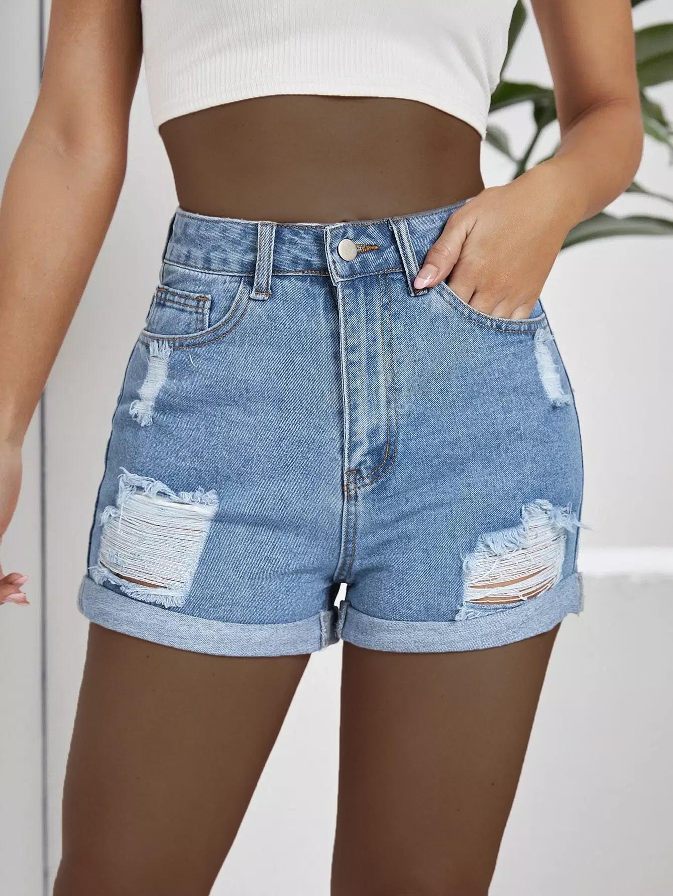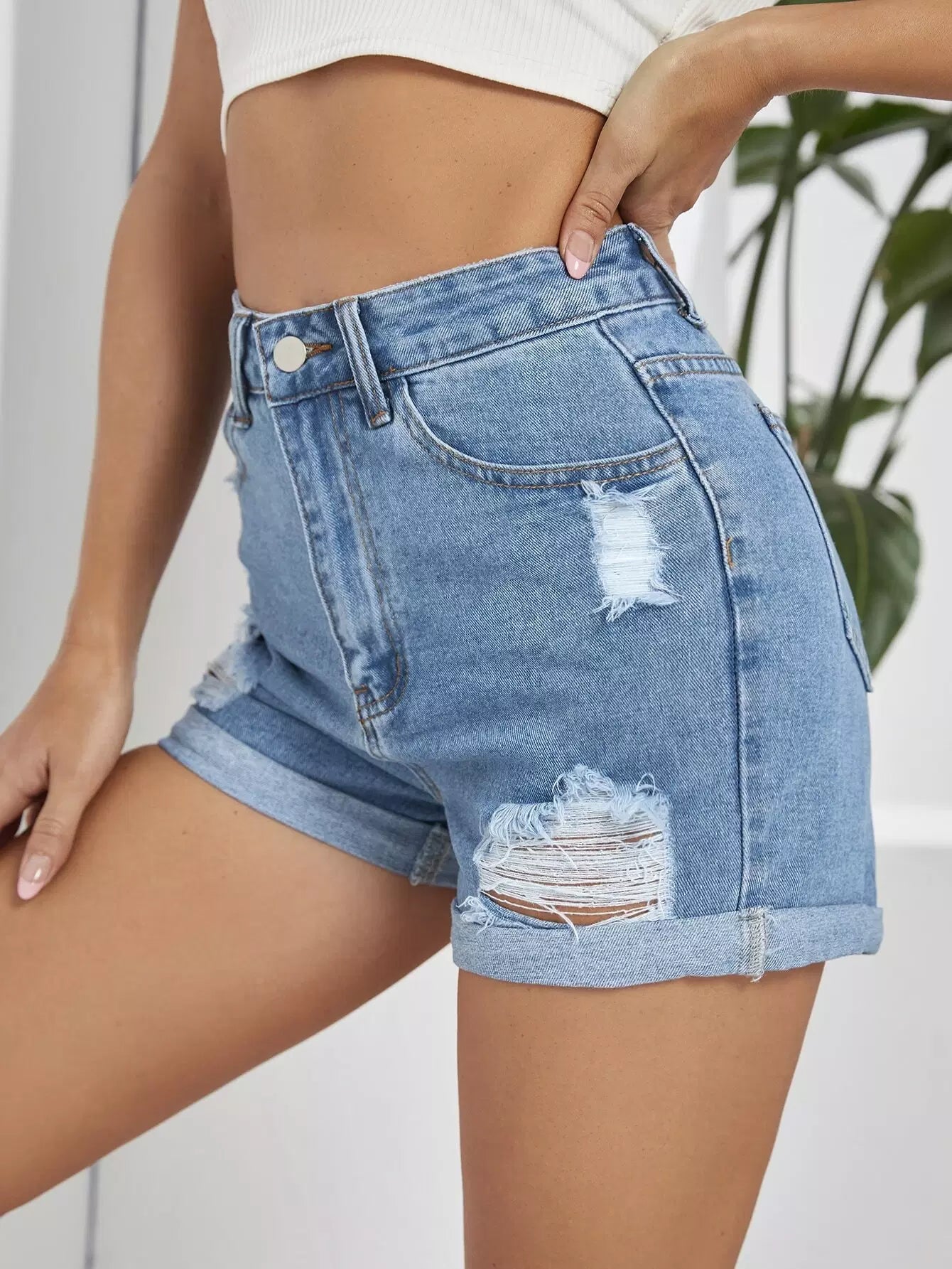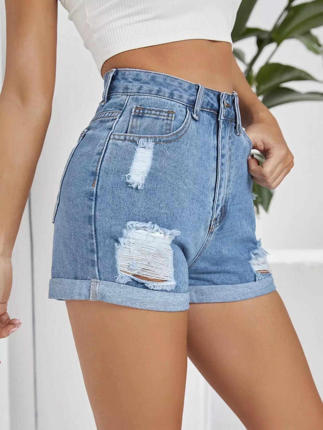 شورت جينز ممزق بخصر مرتفع وحاشية ملفوفة