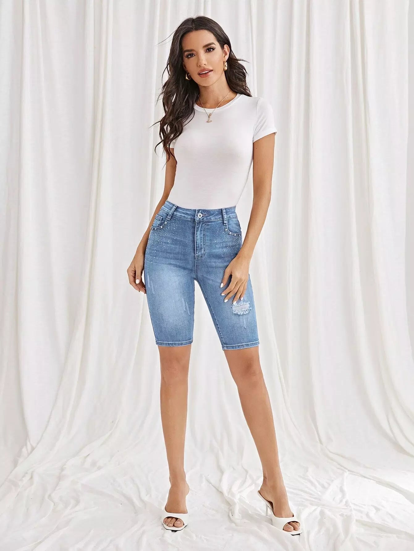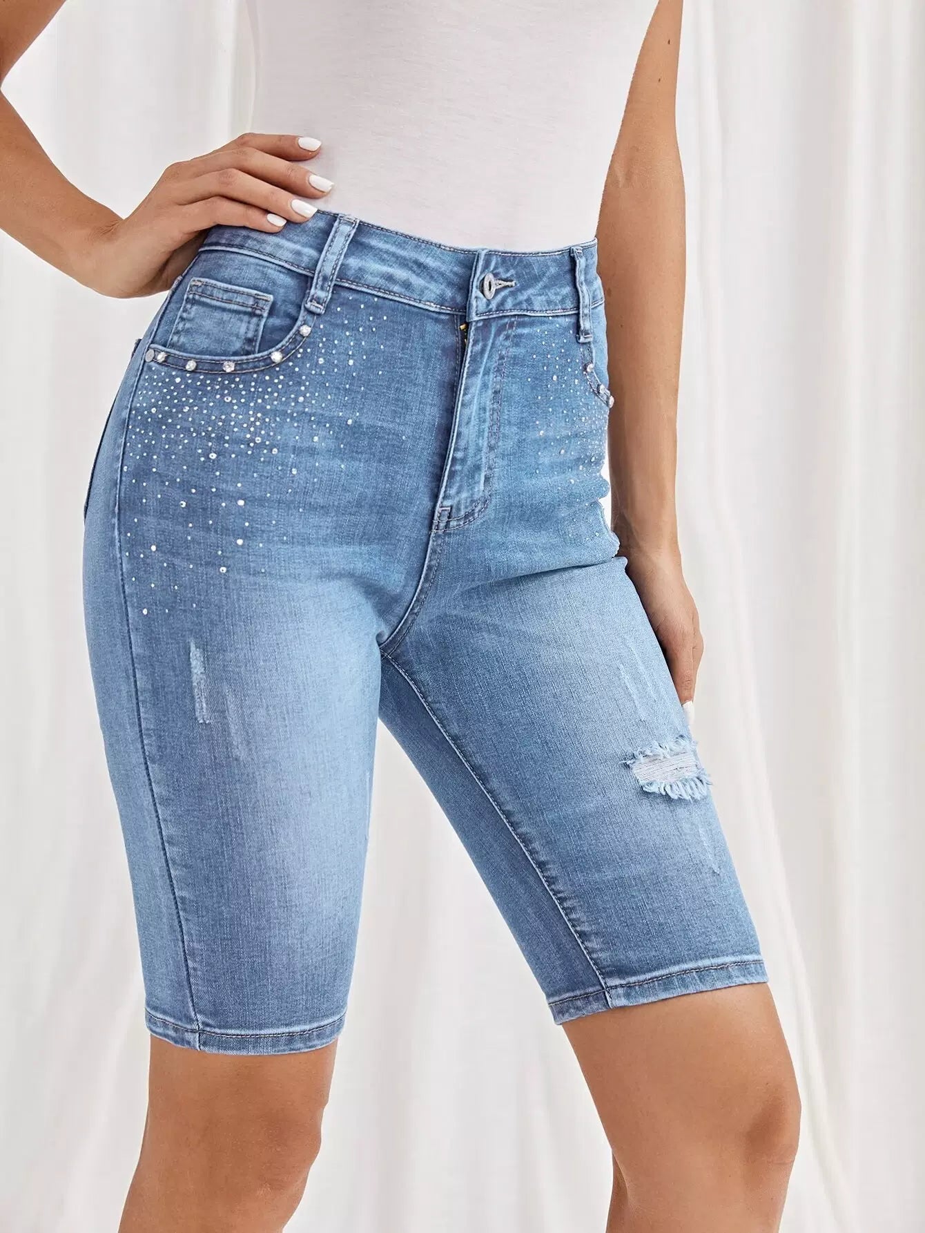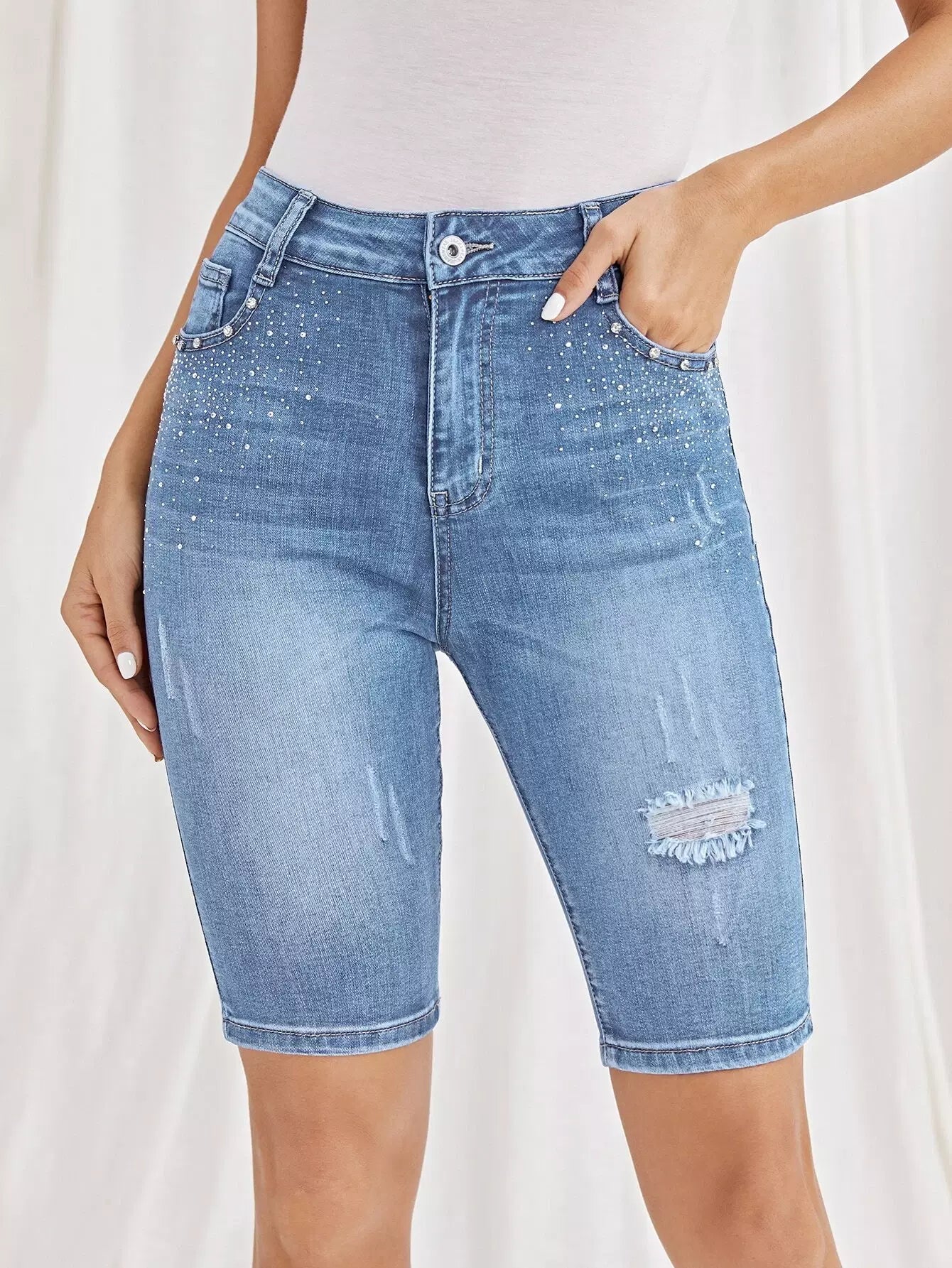 شورت جينز برمودا دنيم ممزق مزين بأحجار الراين