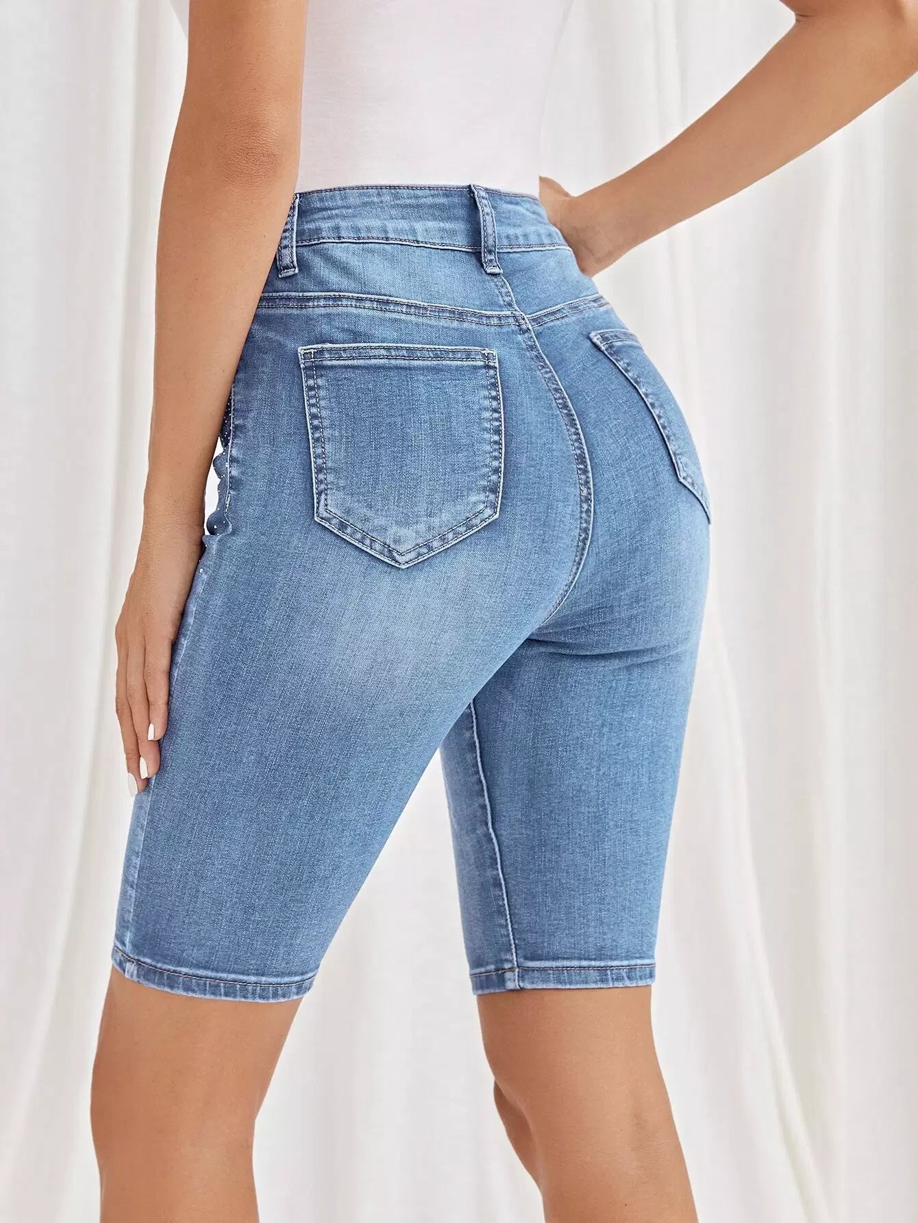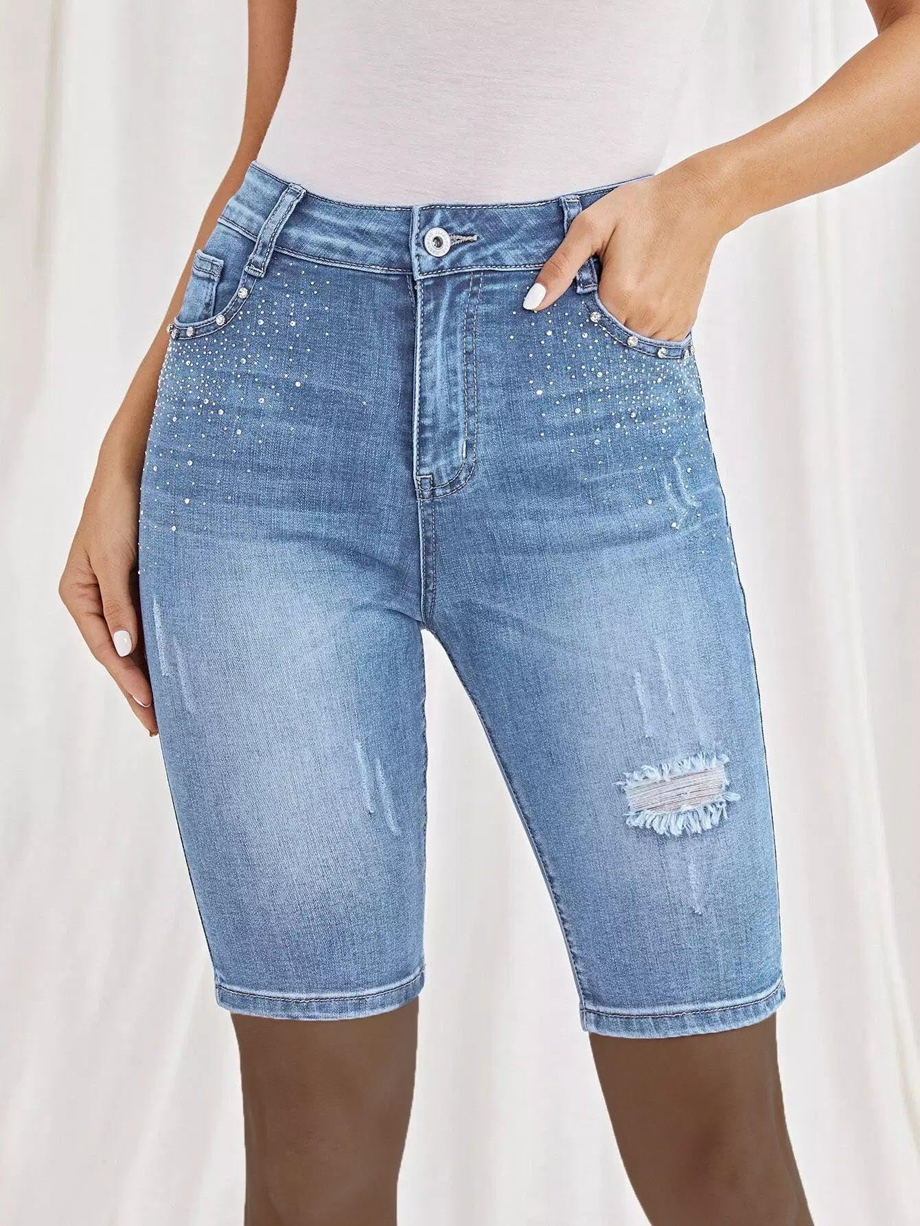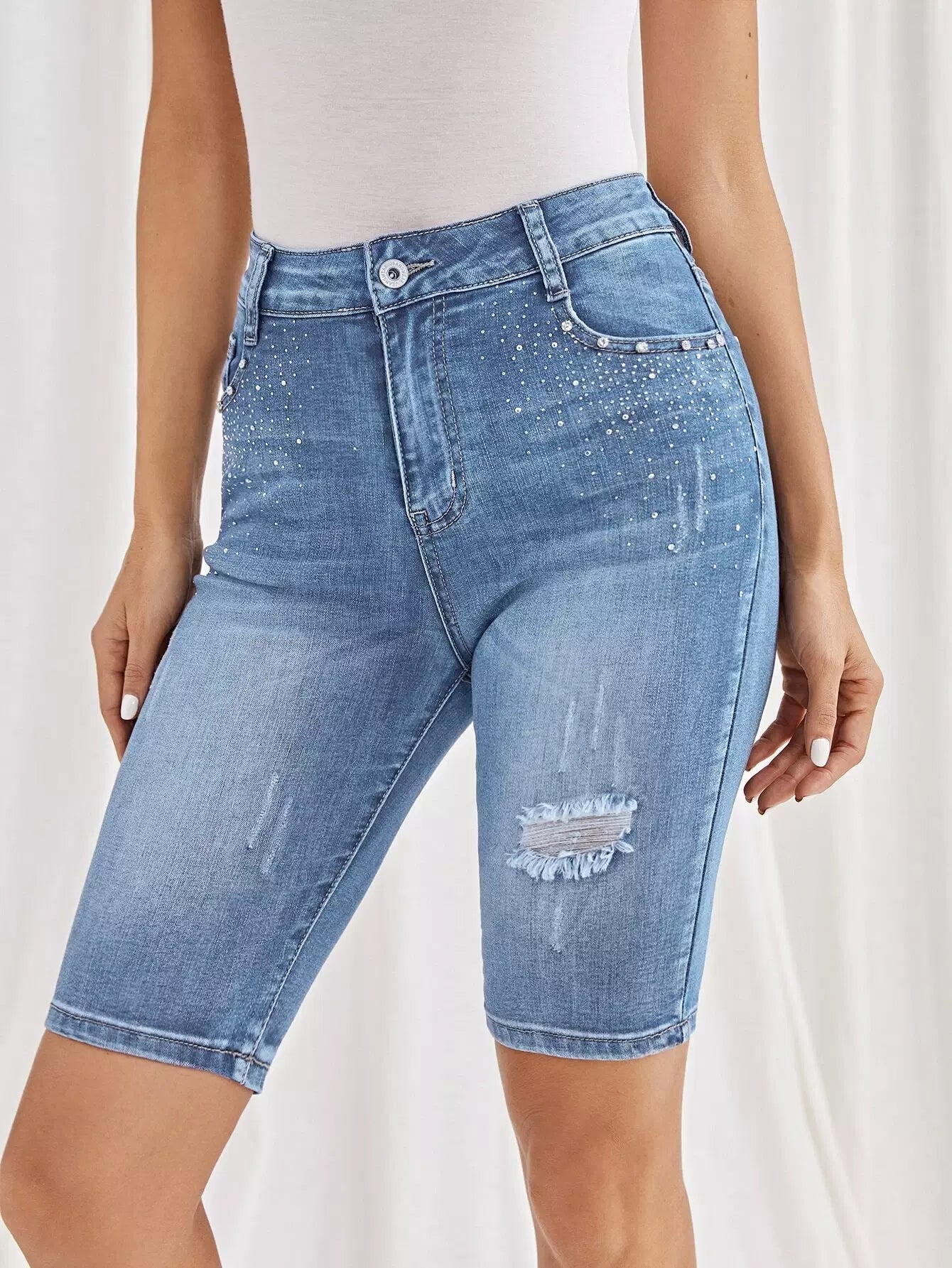 شورت جينز برمودا دنيم ممزق مزين بأحجار الراين