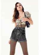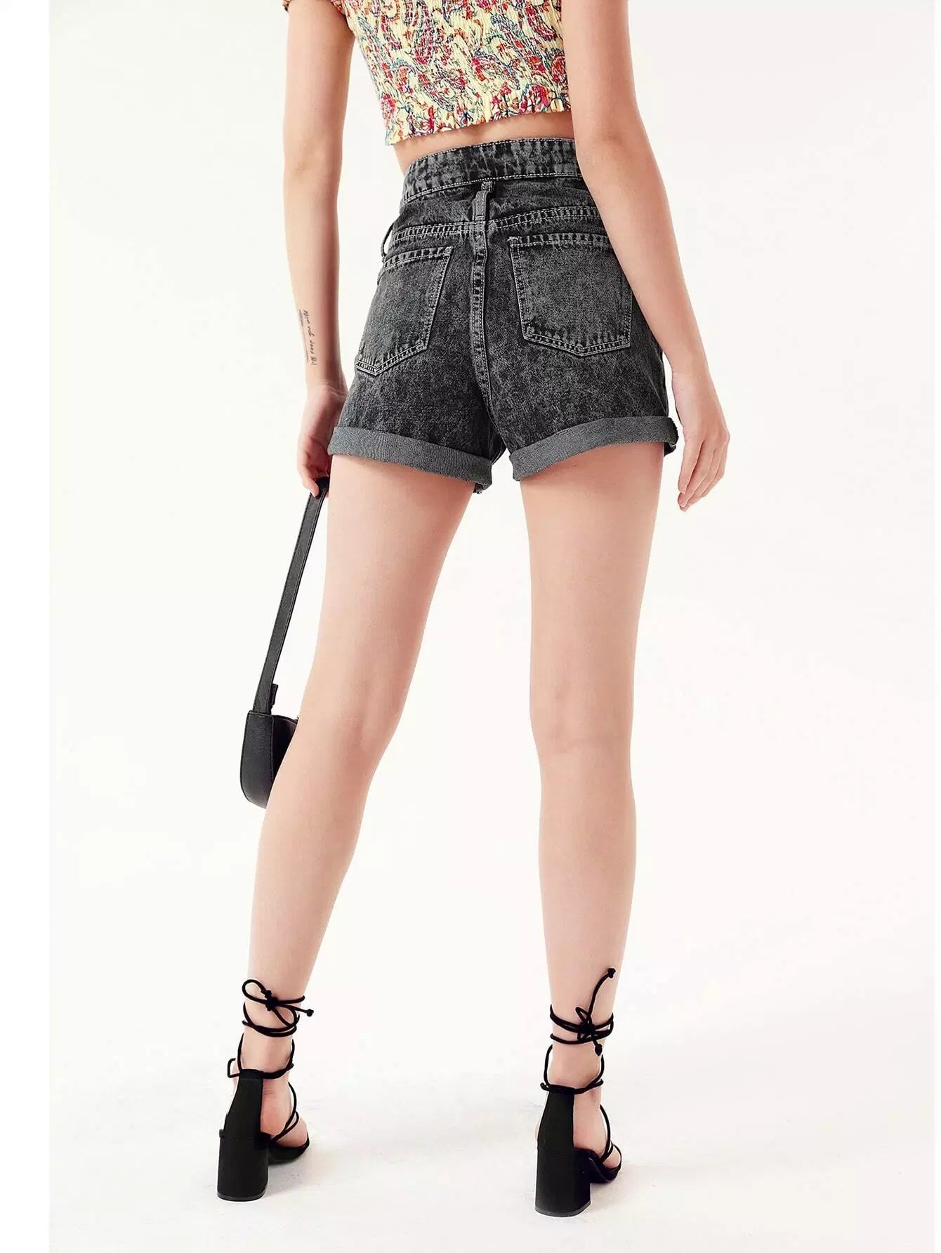 شورت جينز بحافة مائلة بجيب مائل بحاشية ملفوفة