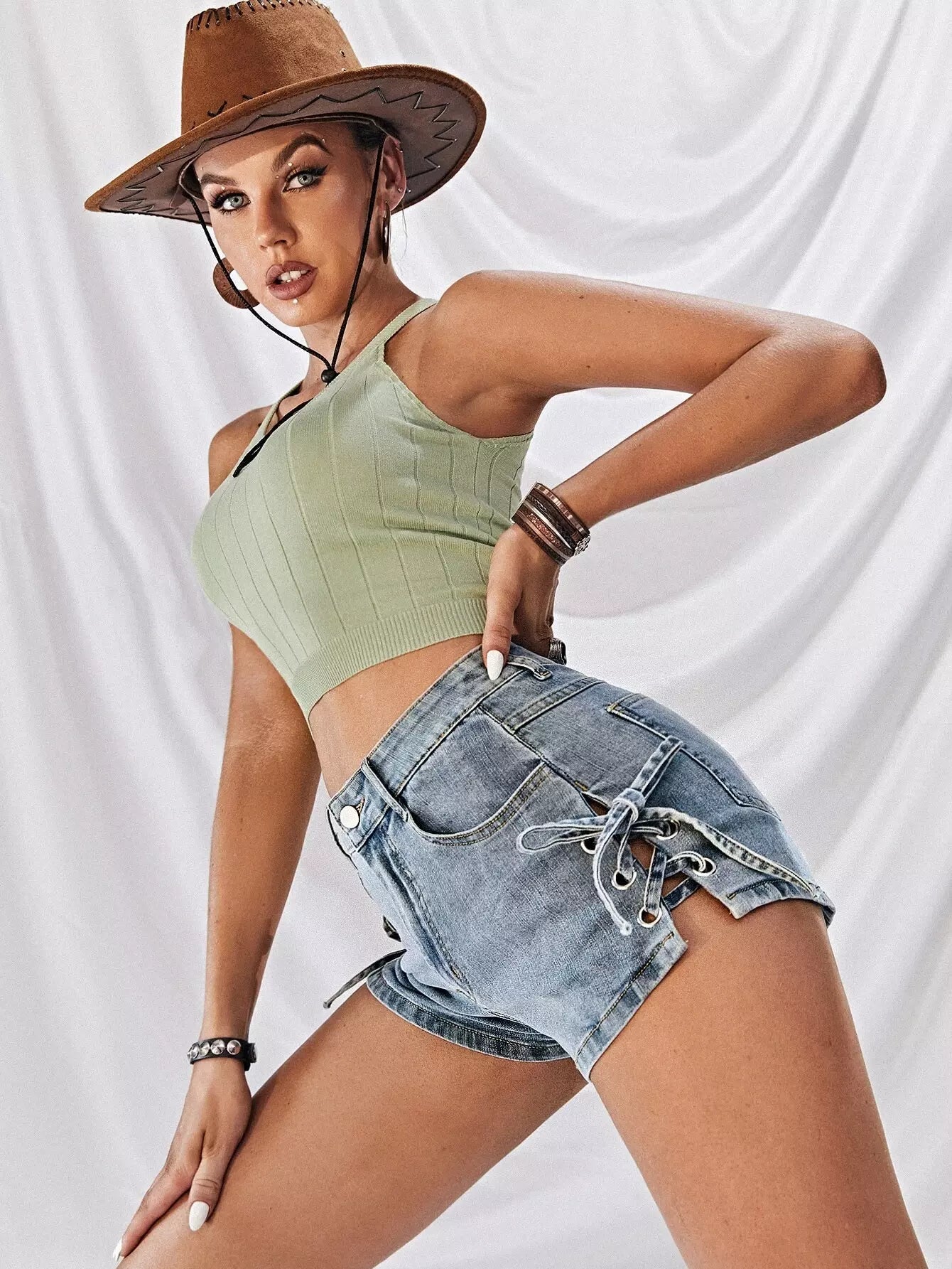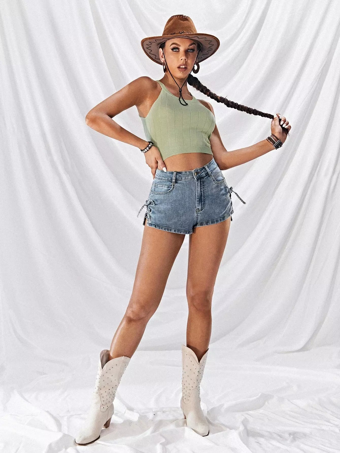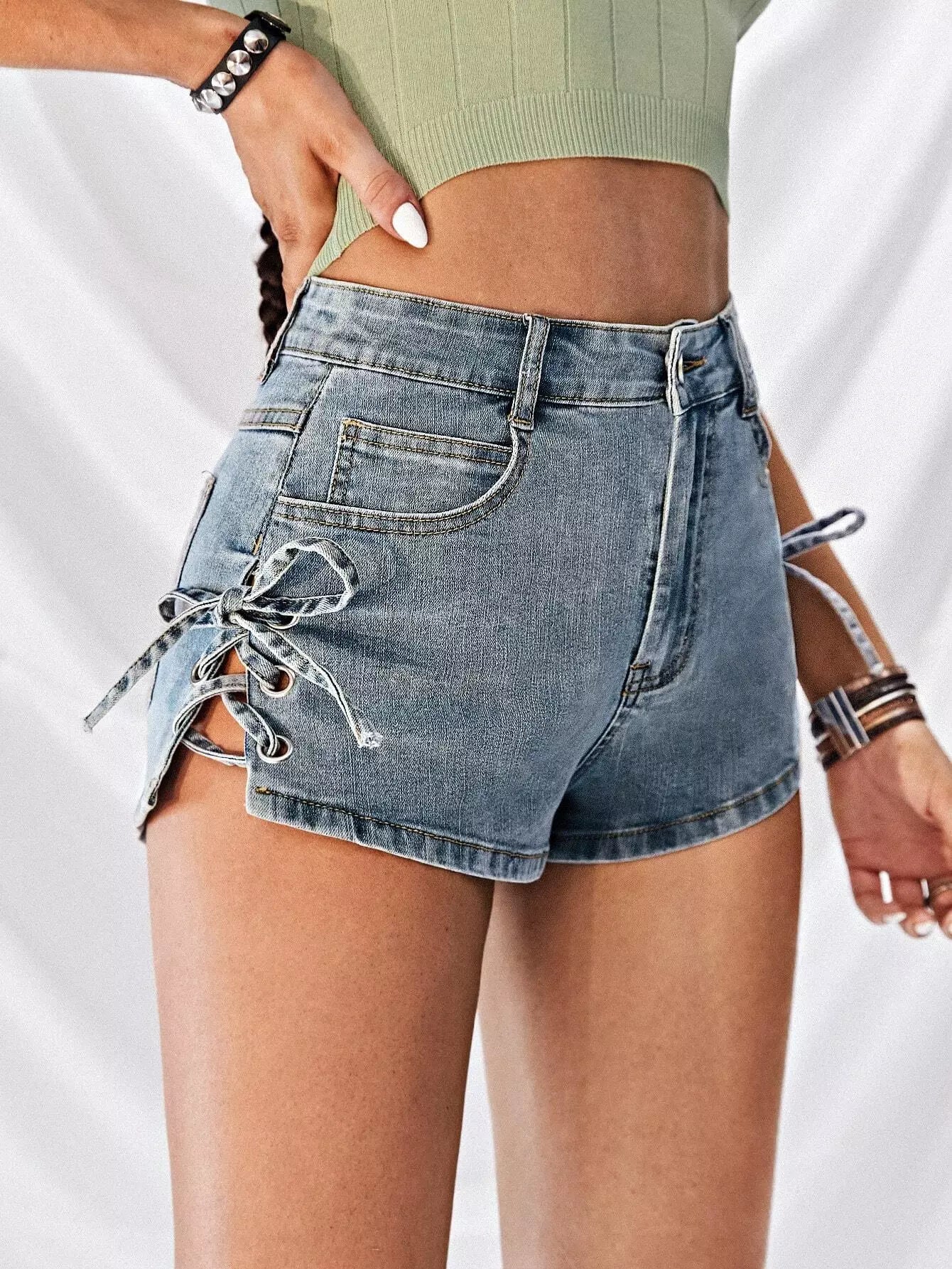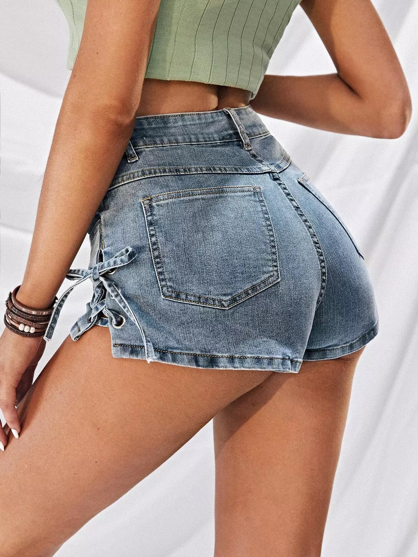 بنطلون جينز جينز قصير بسحاب بأربطة جانبية بسحاب