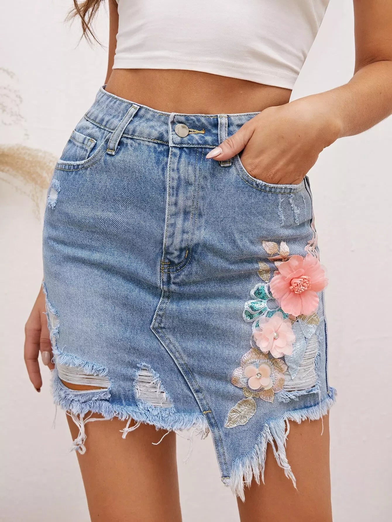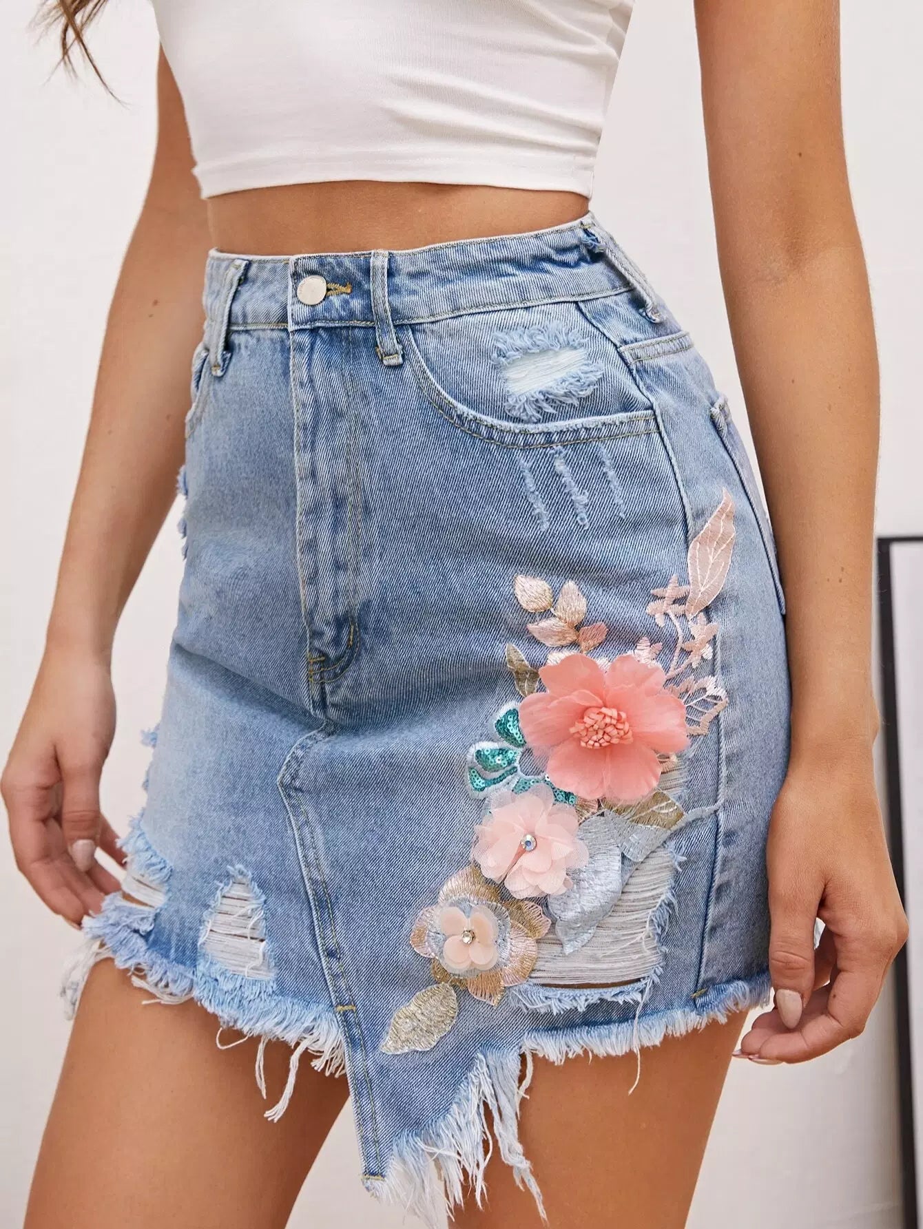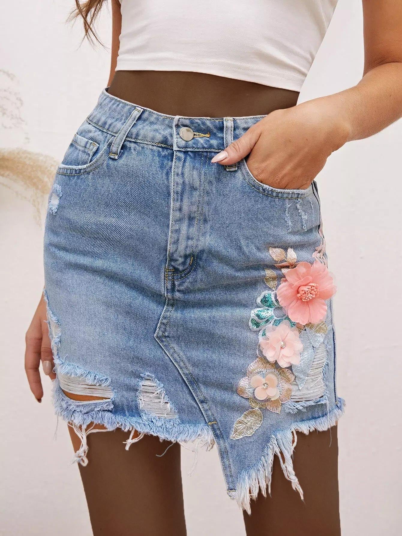 تنورة دنيم مطرزة بتطريزات زهرية مزركشة ومزخرفة