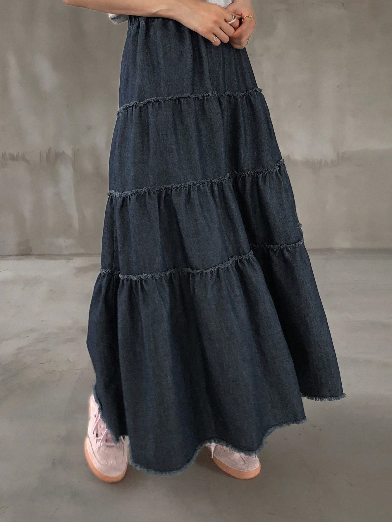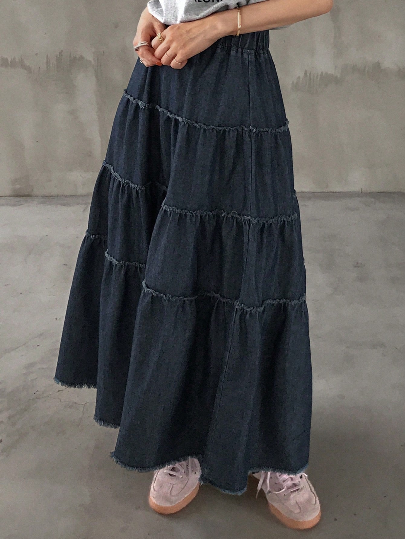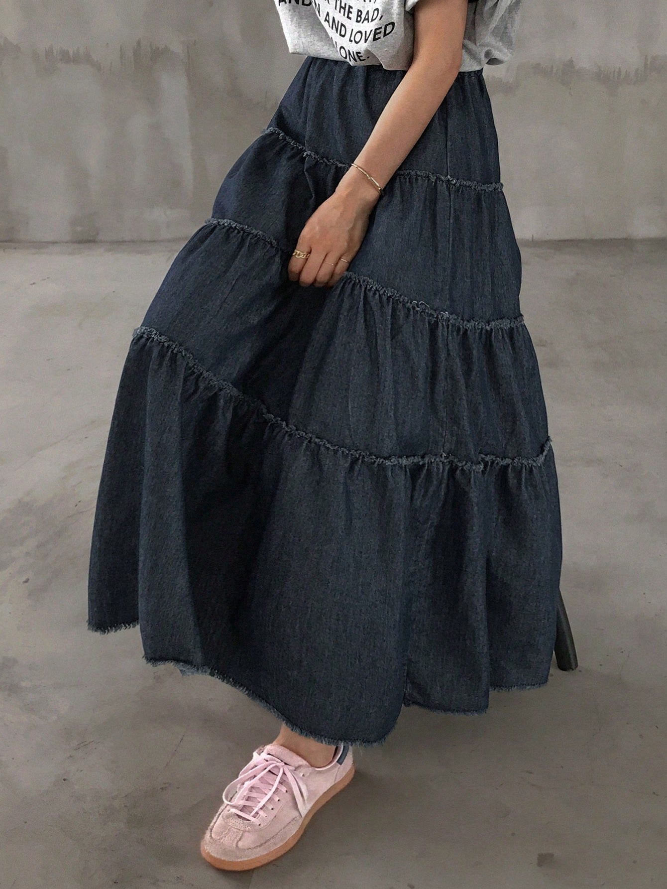 FRIFUL Women's Elastic Waist Denim A-Line Skirt With Ruffle Hem Jeans Skirt