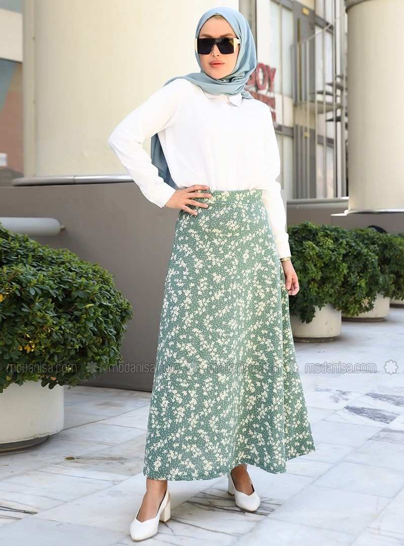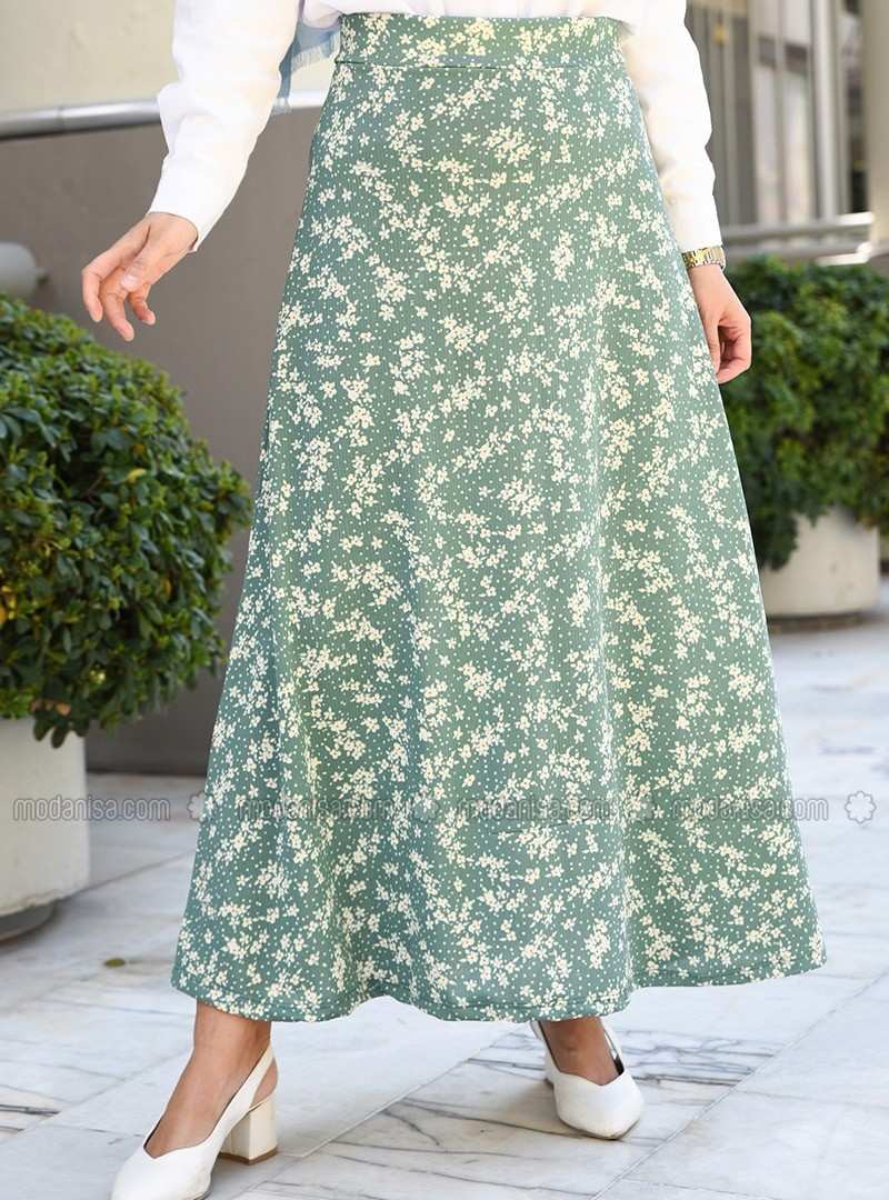 تنورة غير مبطنة بالزهور اللوزية الخضراء