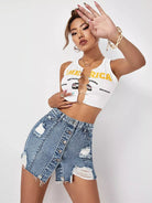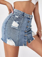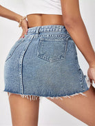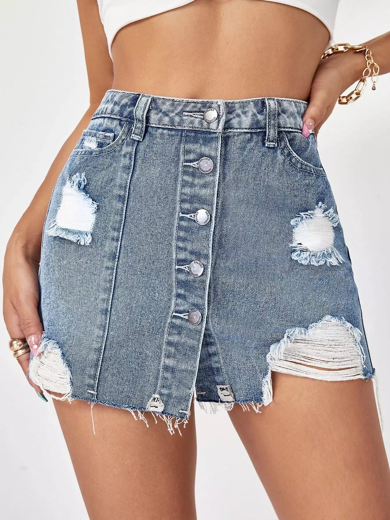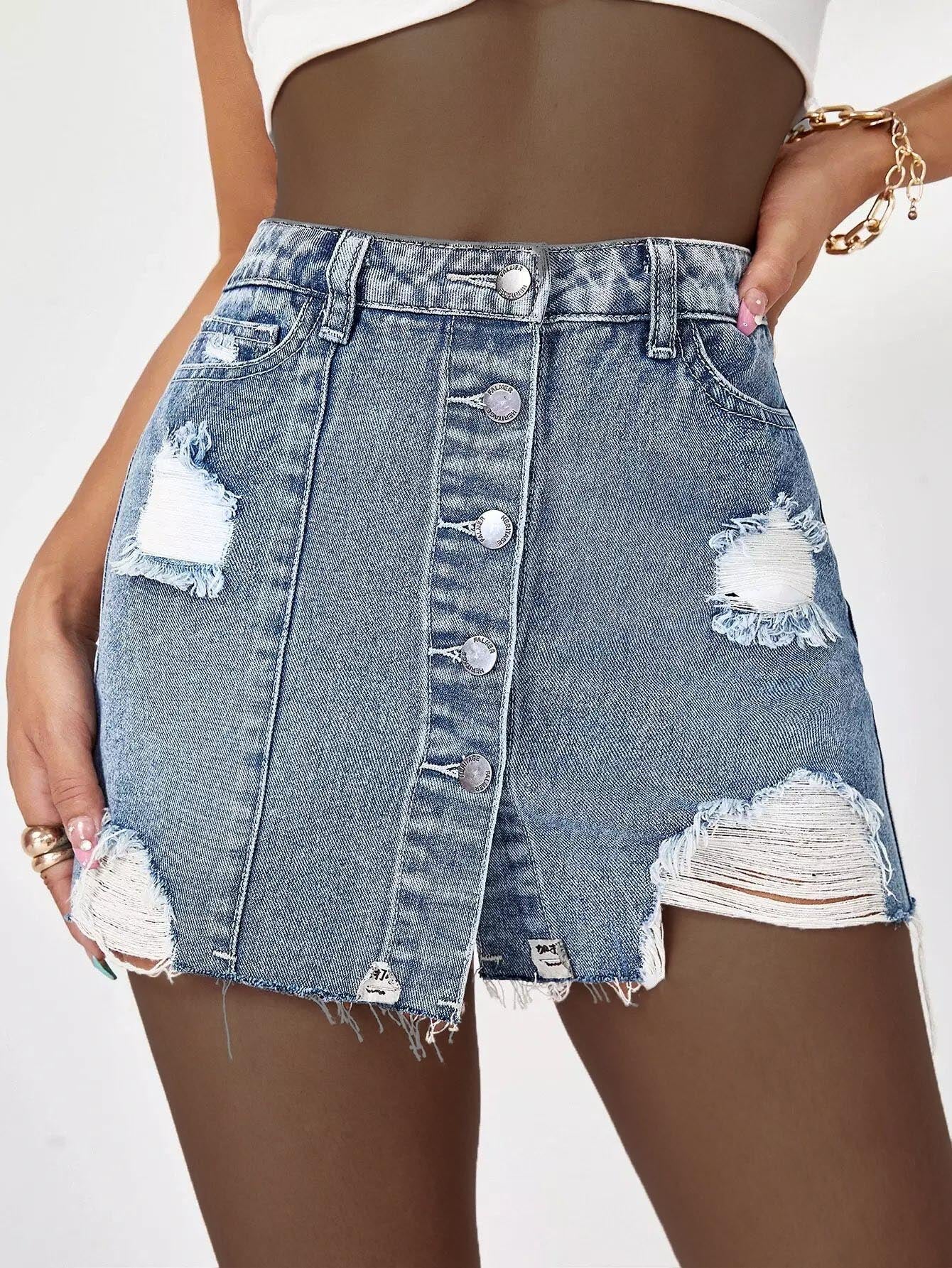 تنورة دنيم عالية الخصر بأزرار أمامية ممزقة من الأمام بحافة خام
