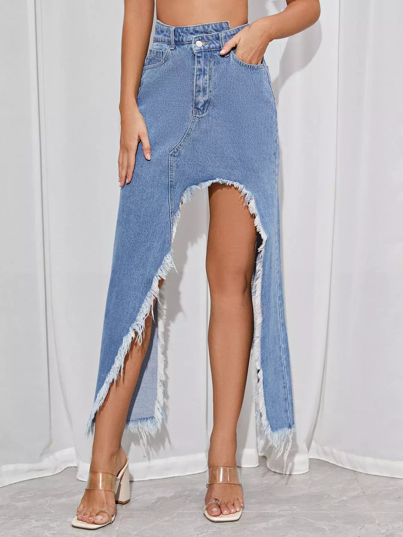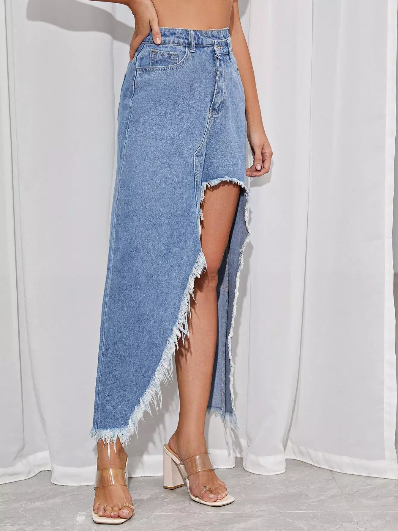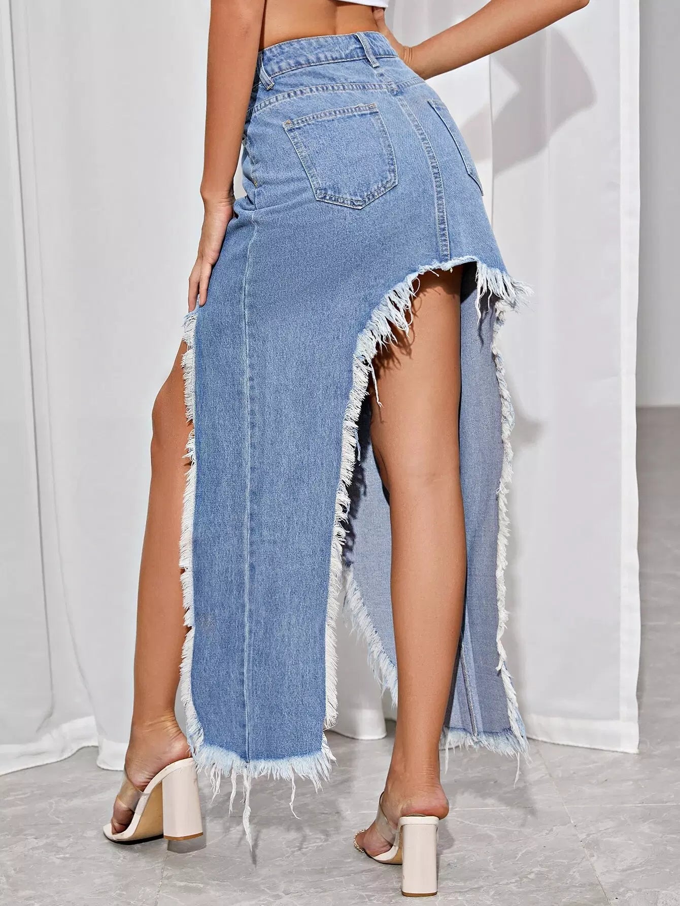 تنورة دنيم عالية الخصر عالية الخصر بحاشية خفيفة، مشقوقة الفخذين