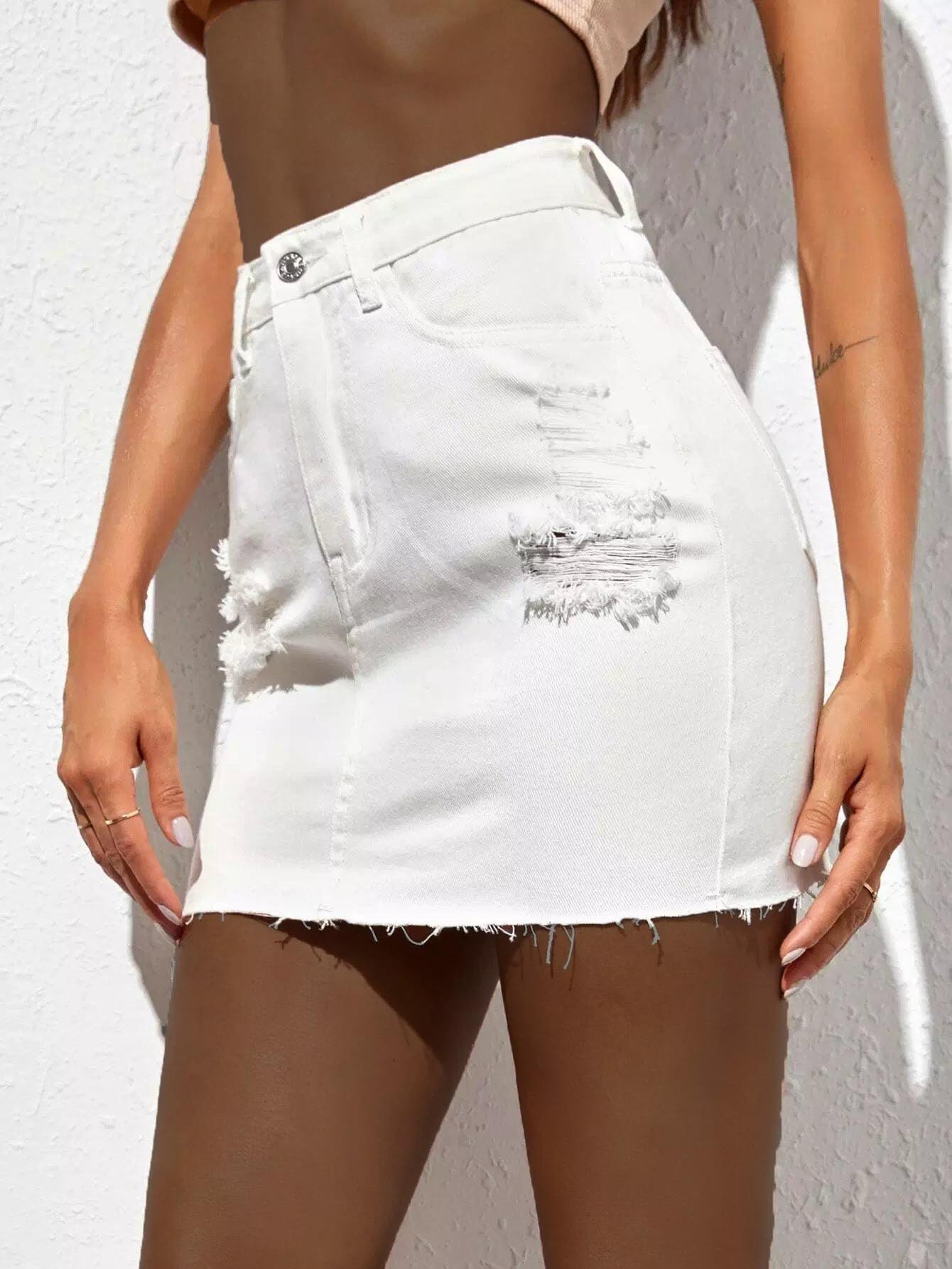 تنورة دنيم قصيرة ممزقة بحوافها الخام