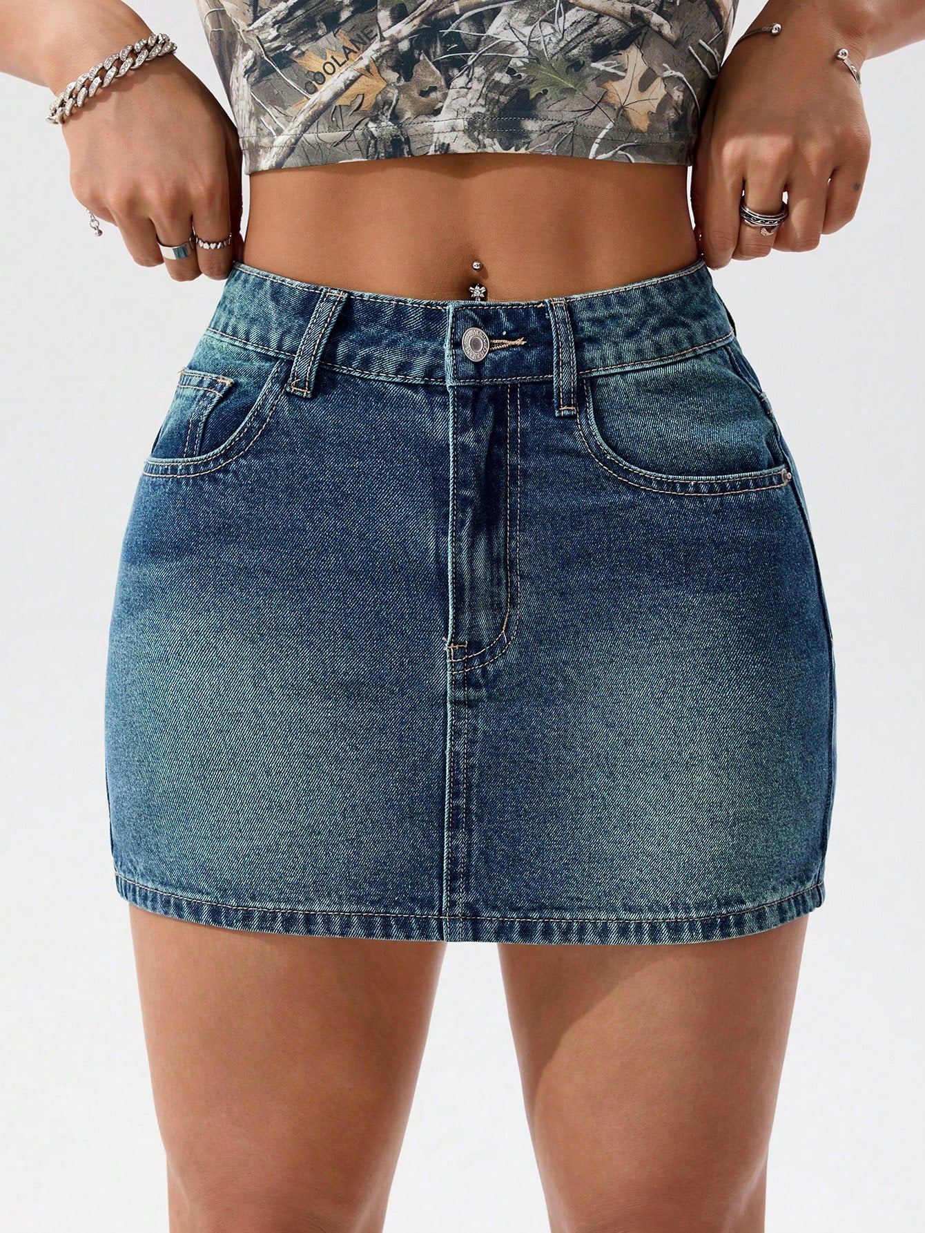 women SHEIN PETITE Women's Summer Casual Washed Side Pockets Bodycon Denim Mini Skirt
