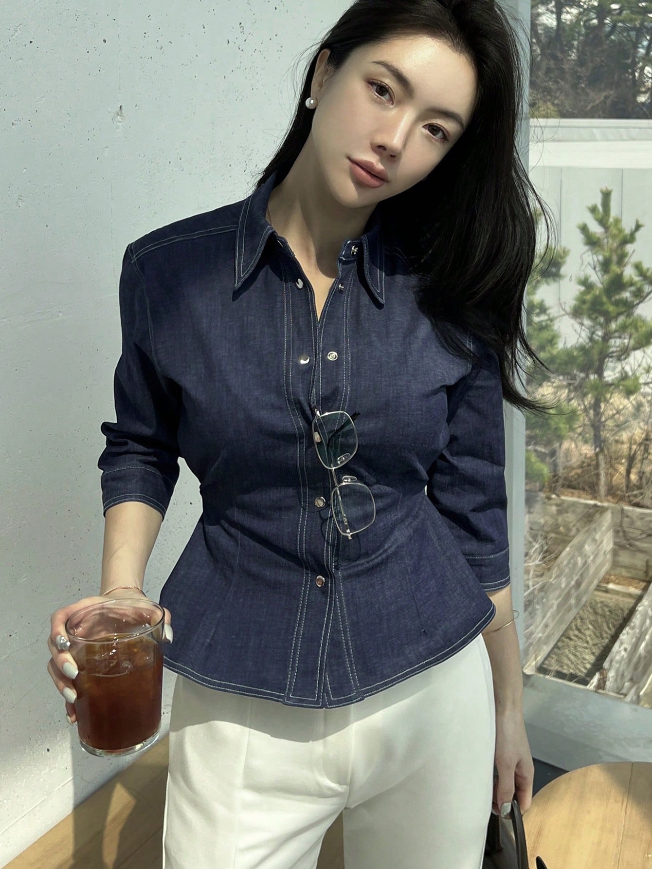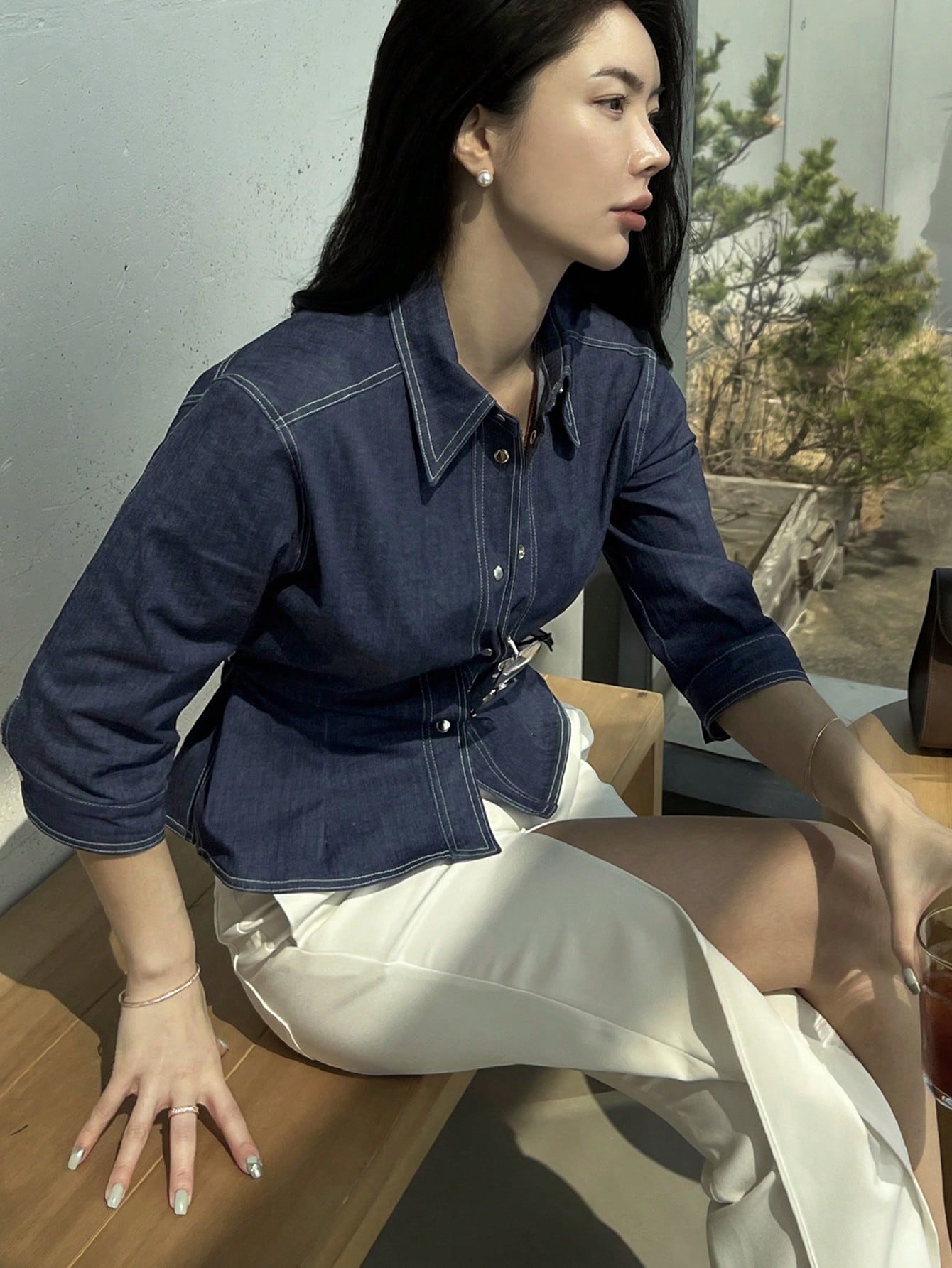 women DAZY Women Solid Fitted Cropped Button Up Denim Shirt