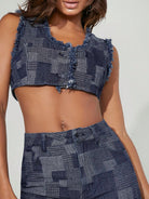 طقم من قطعتين من Denimoi، مكون من بلوزة قصيرة وشورت من قماش الدنيم المرقّع