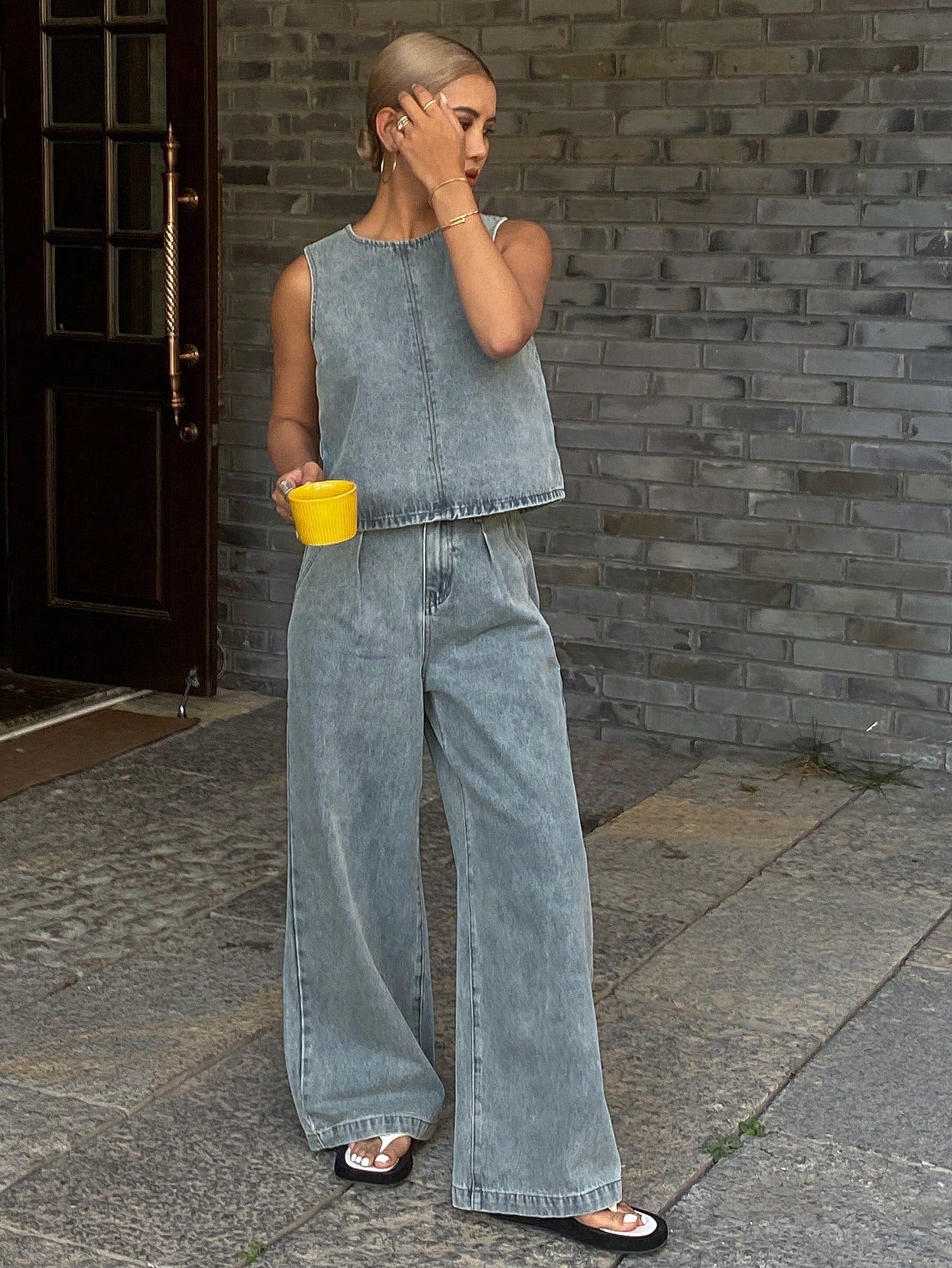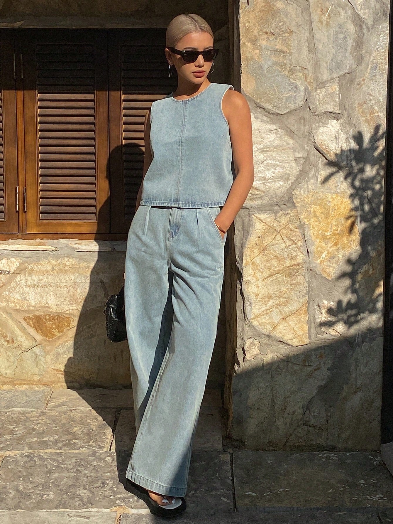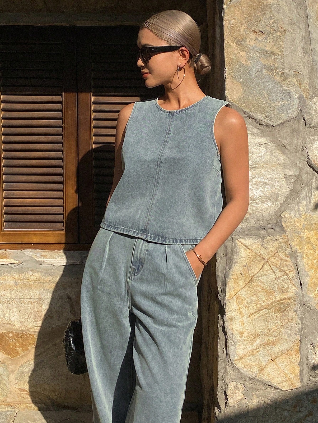 women Livesso Women's Casual Loose Fit Round Neck Vest And Denim Jeans Set