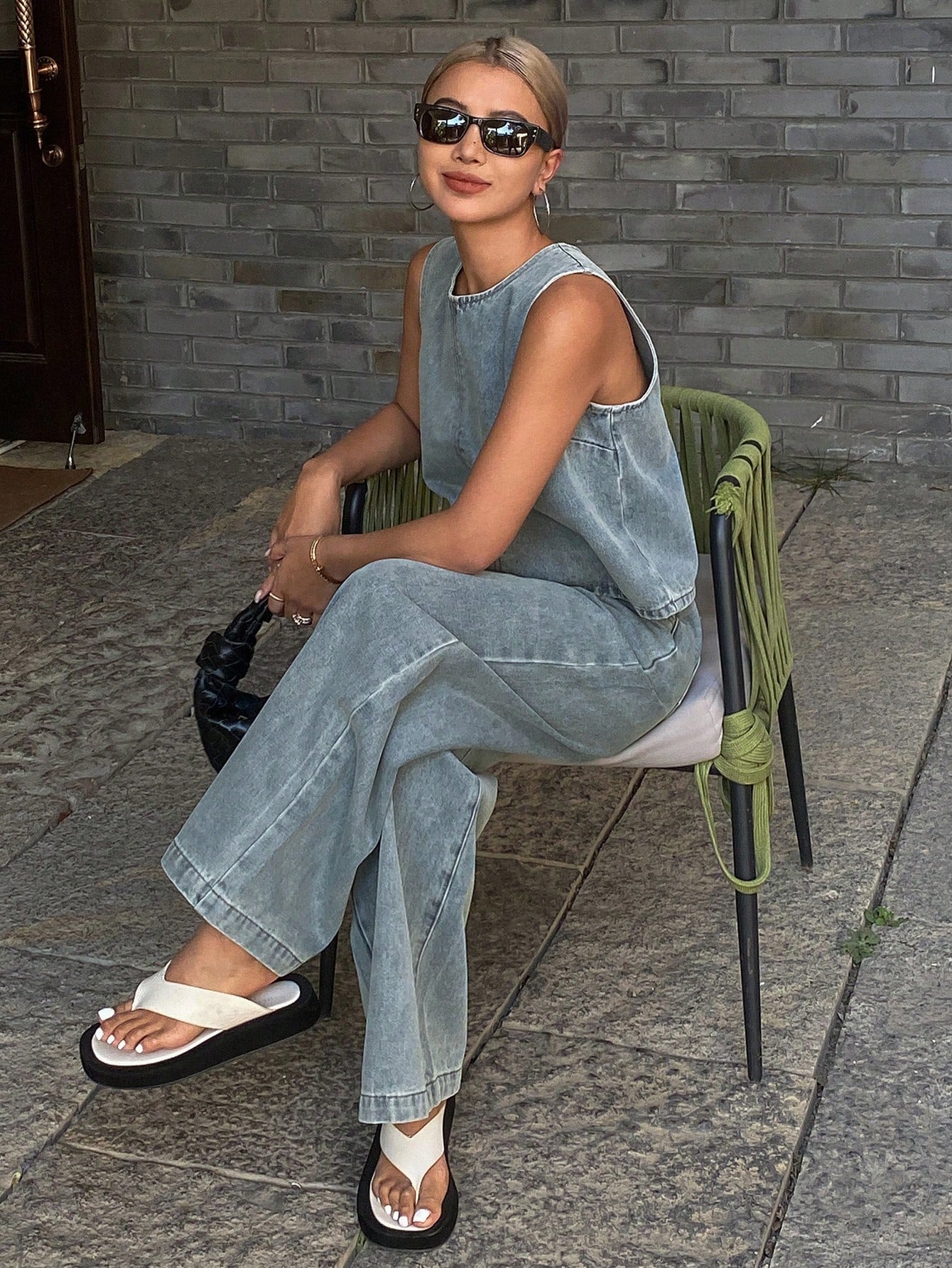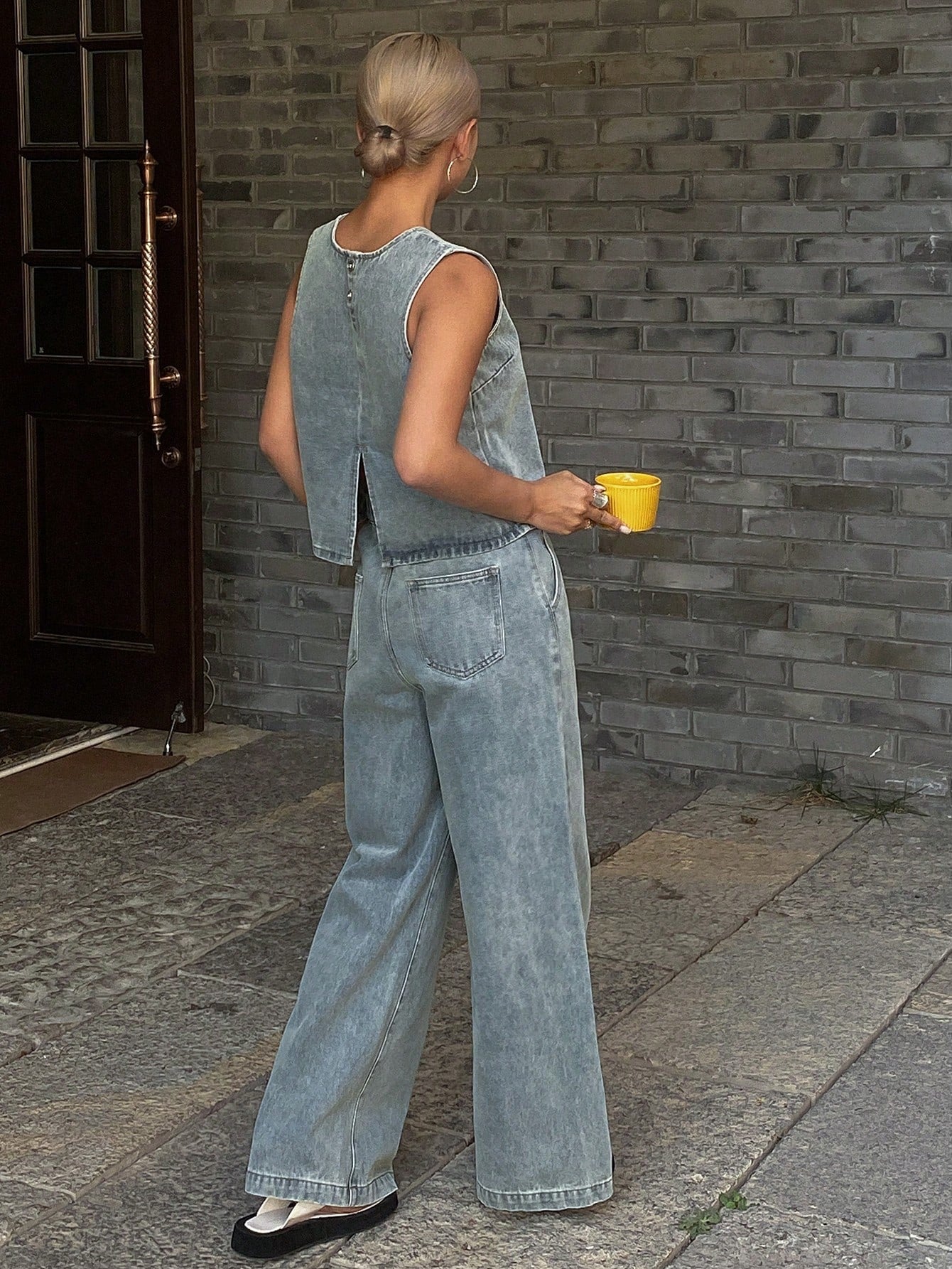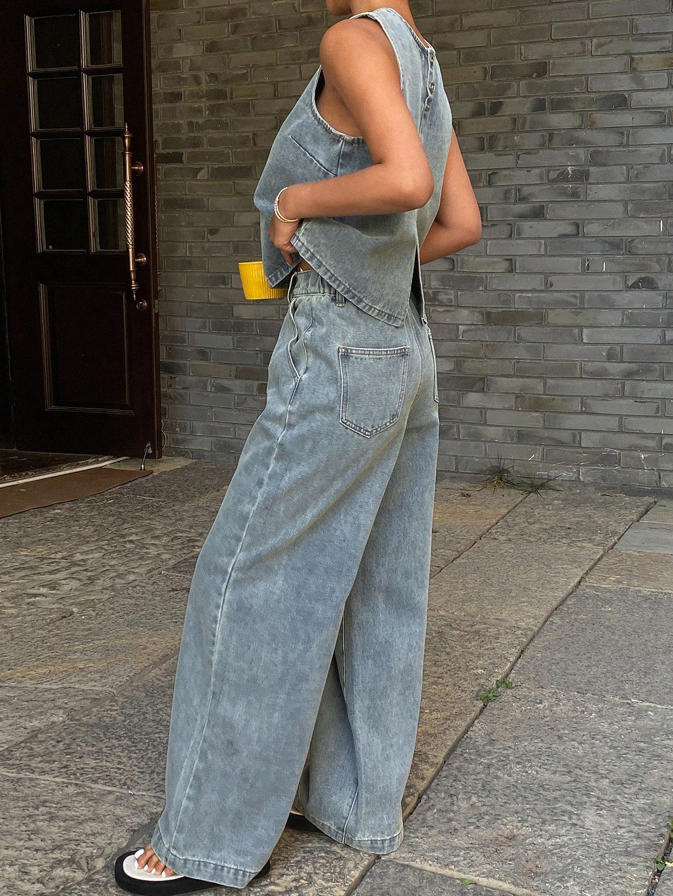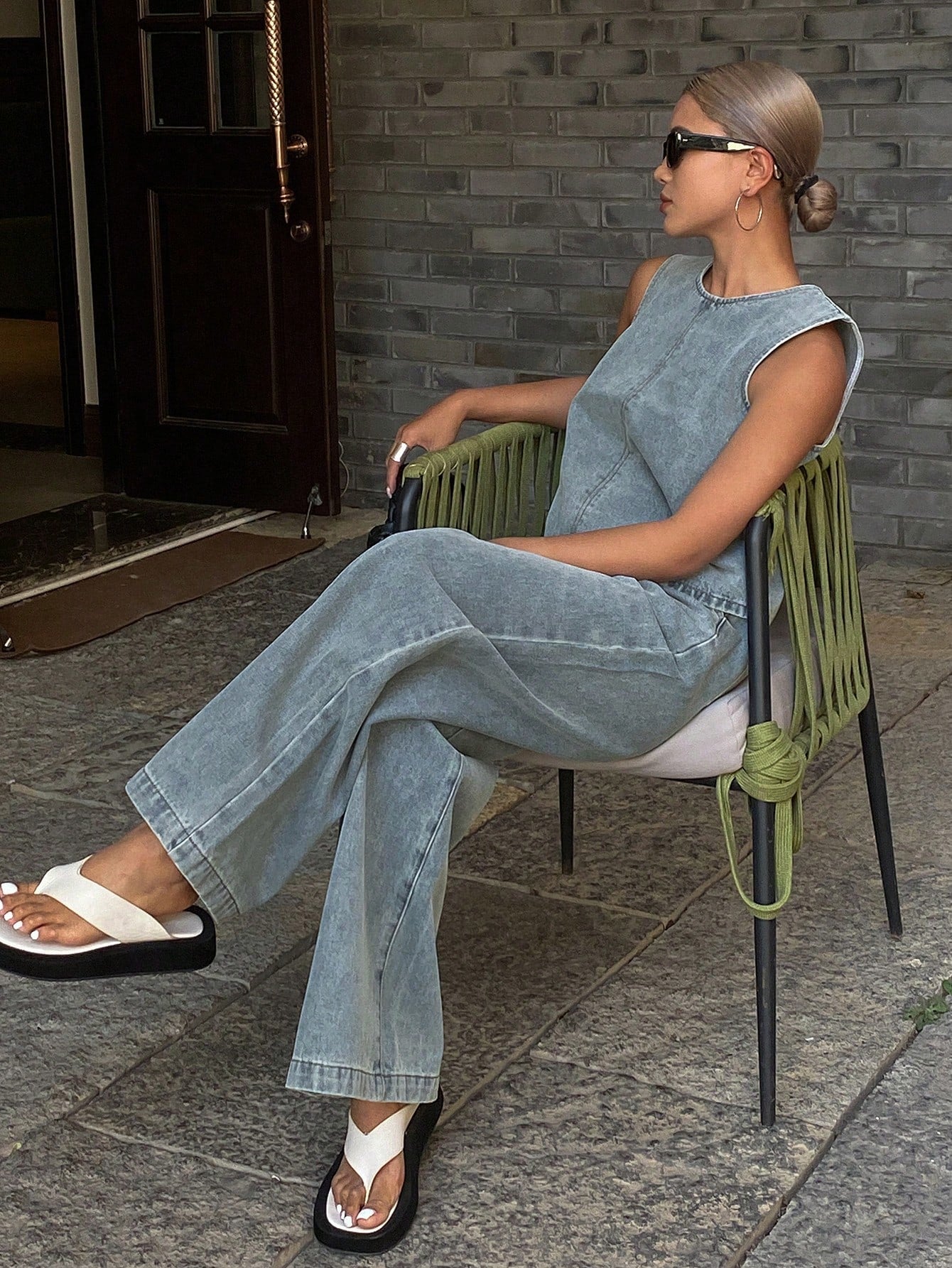 women Livesso Women's Casual Loose Fit Round Neck Vest And Denim Jeans Set