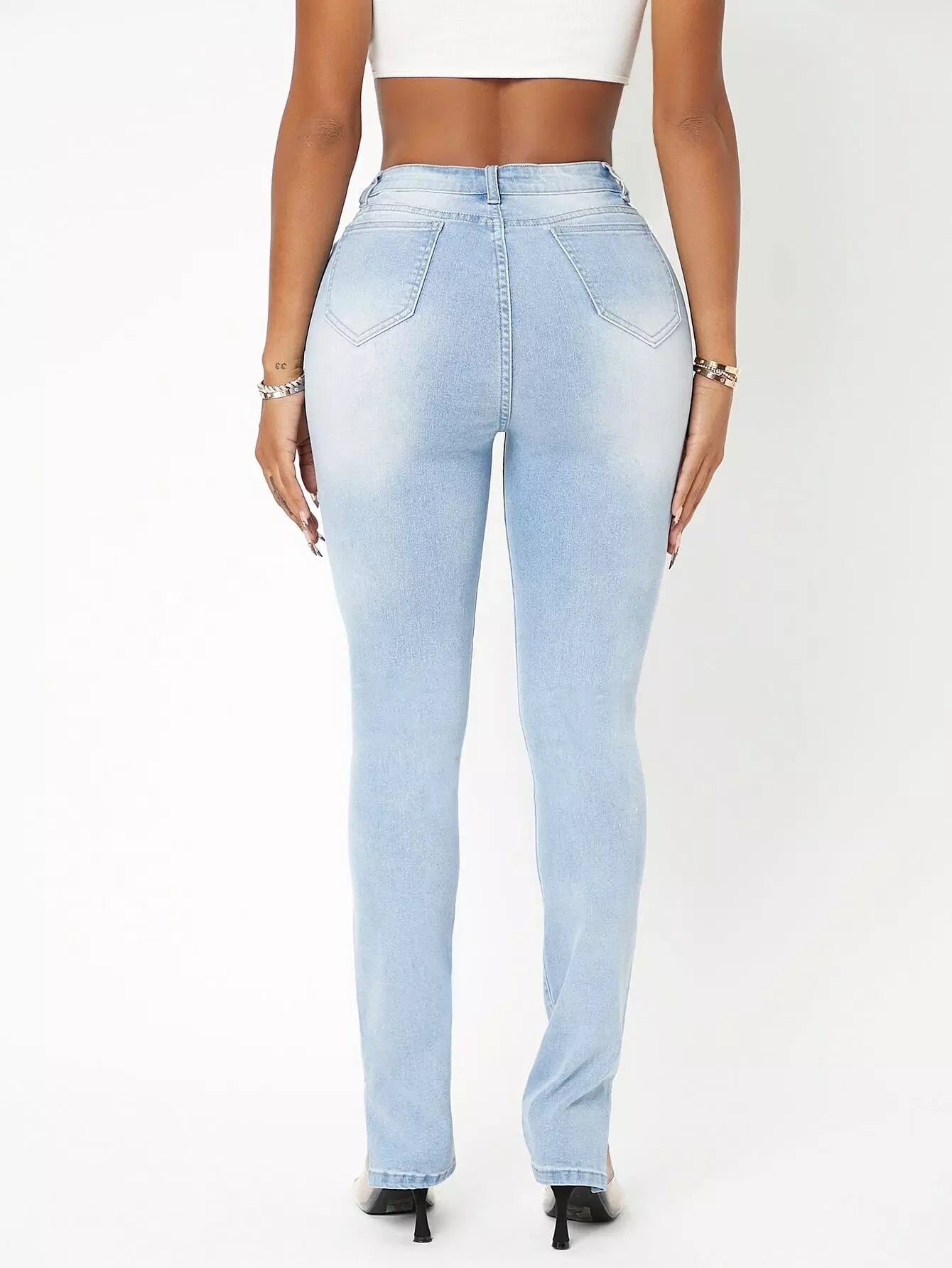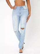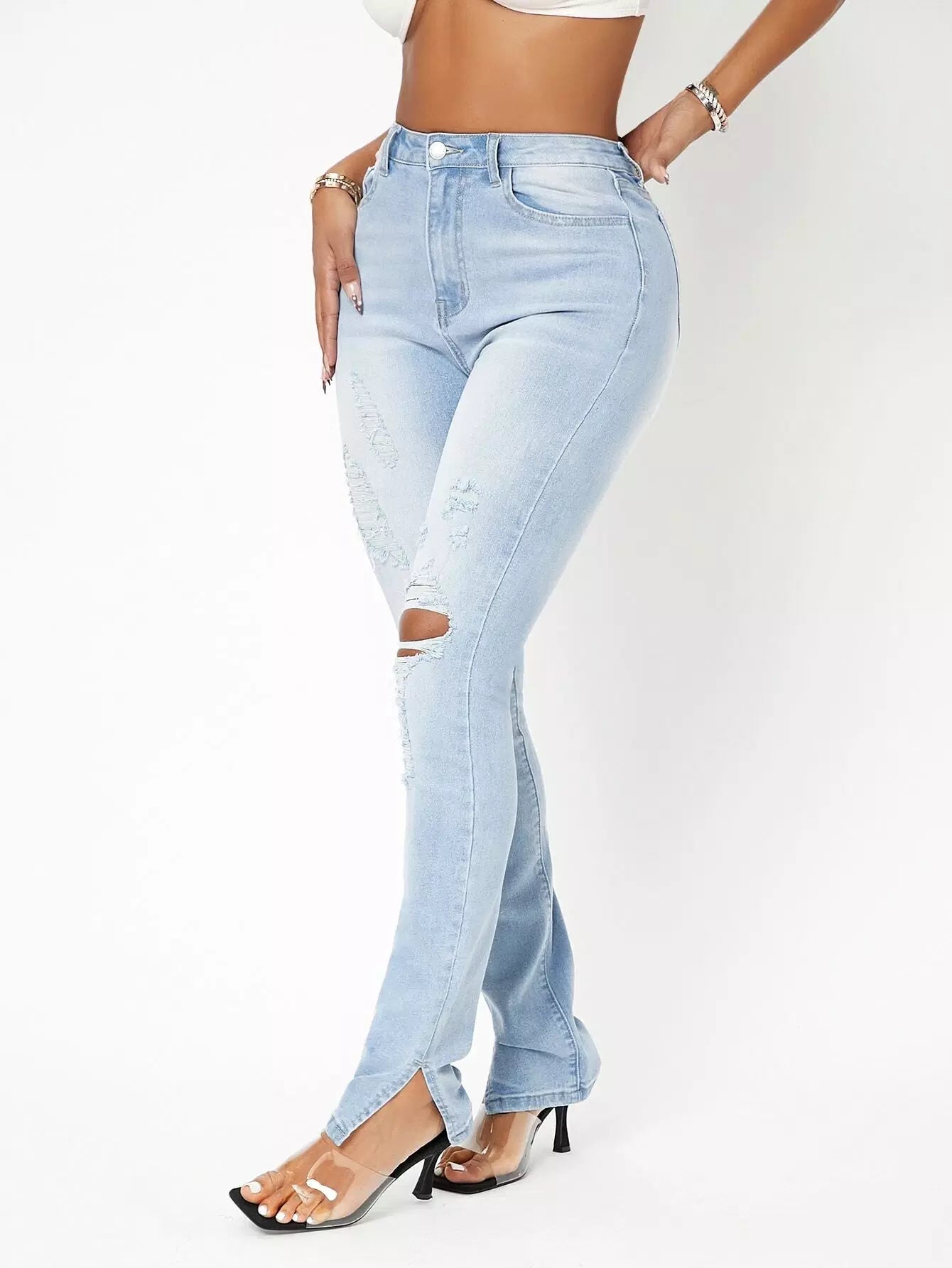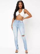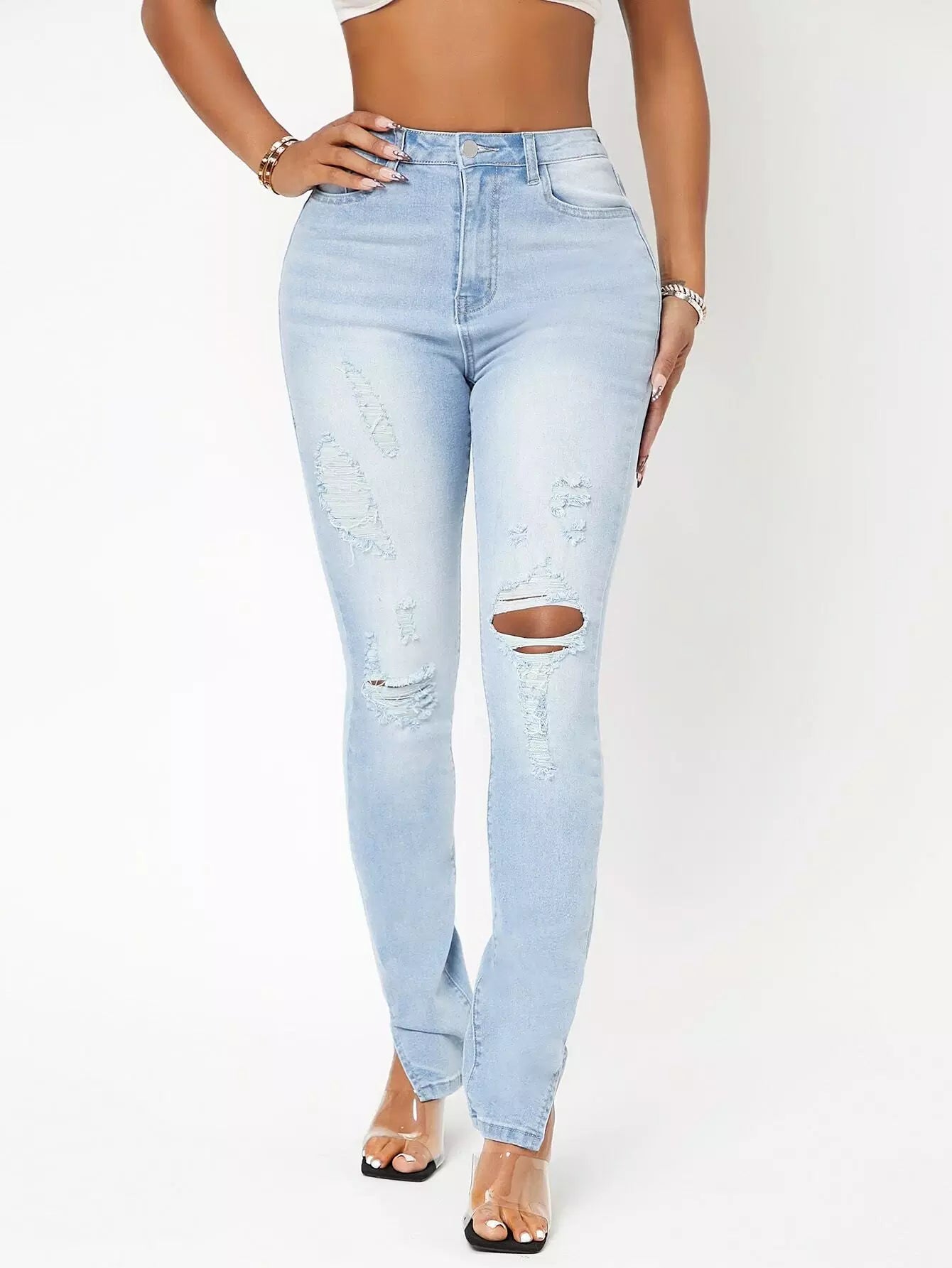 بنطلون جينز سكيني ممزق عالي الخصر ومتعرج الشكل