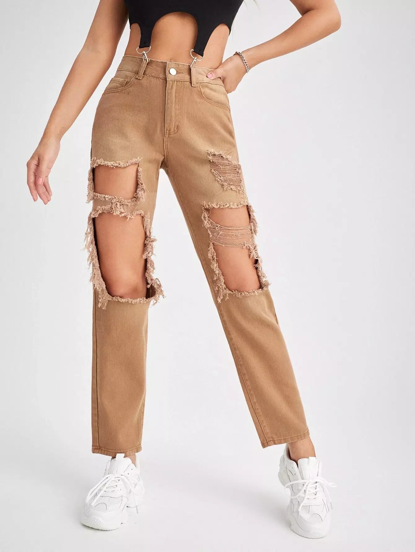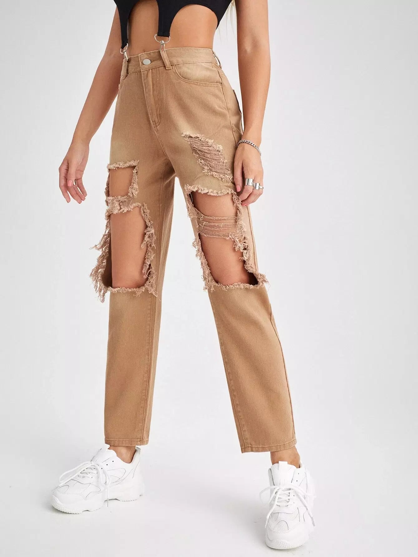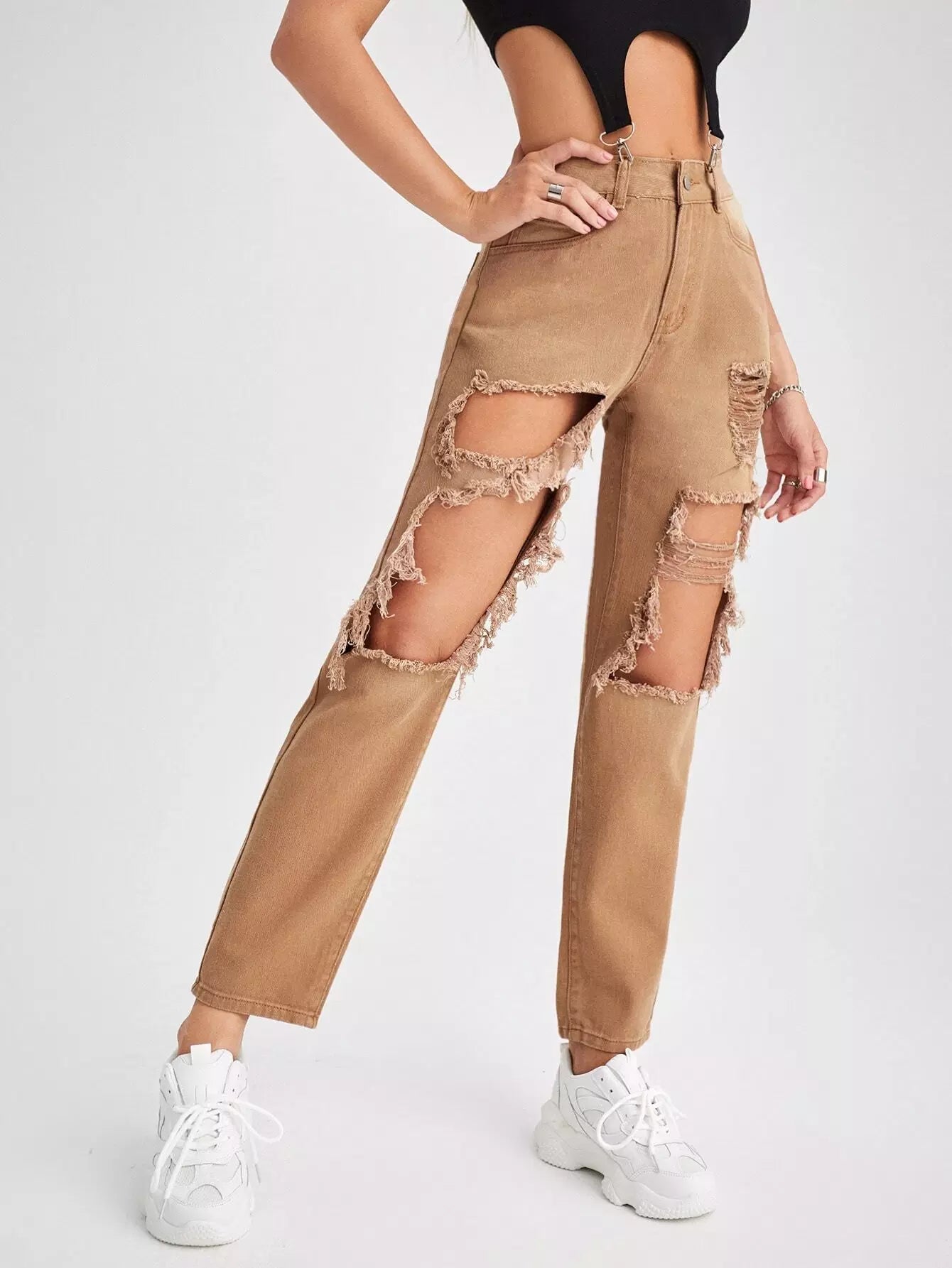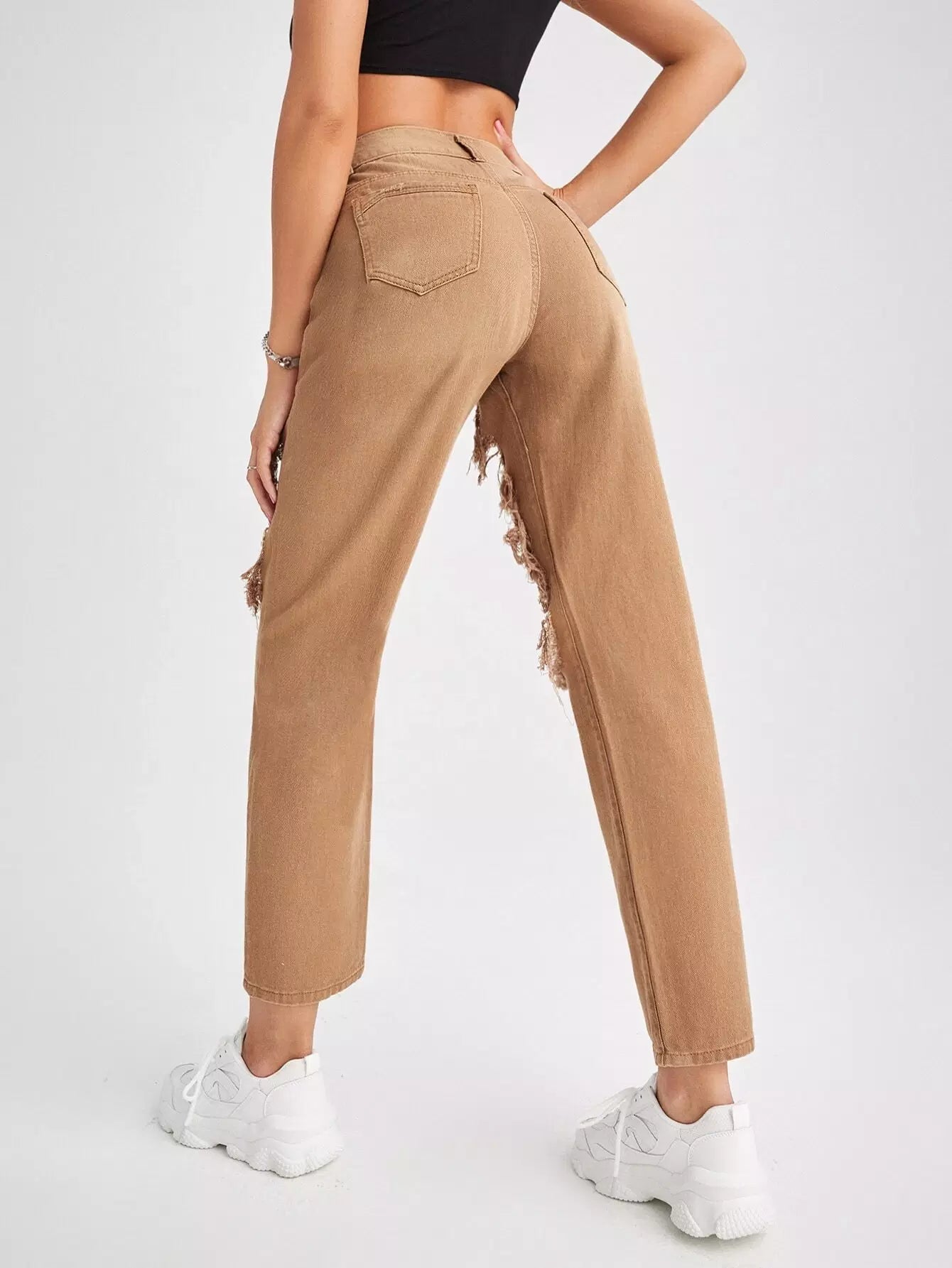 بنطلون جينز بقصّة عالية الخصر ممزق