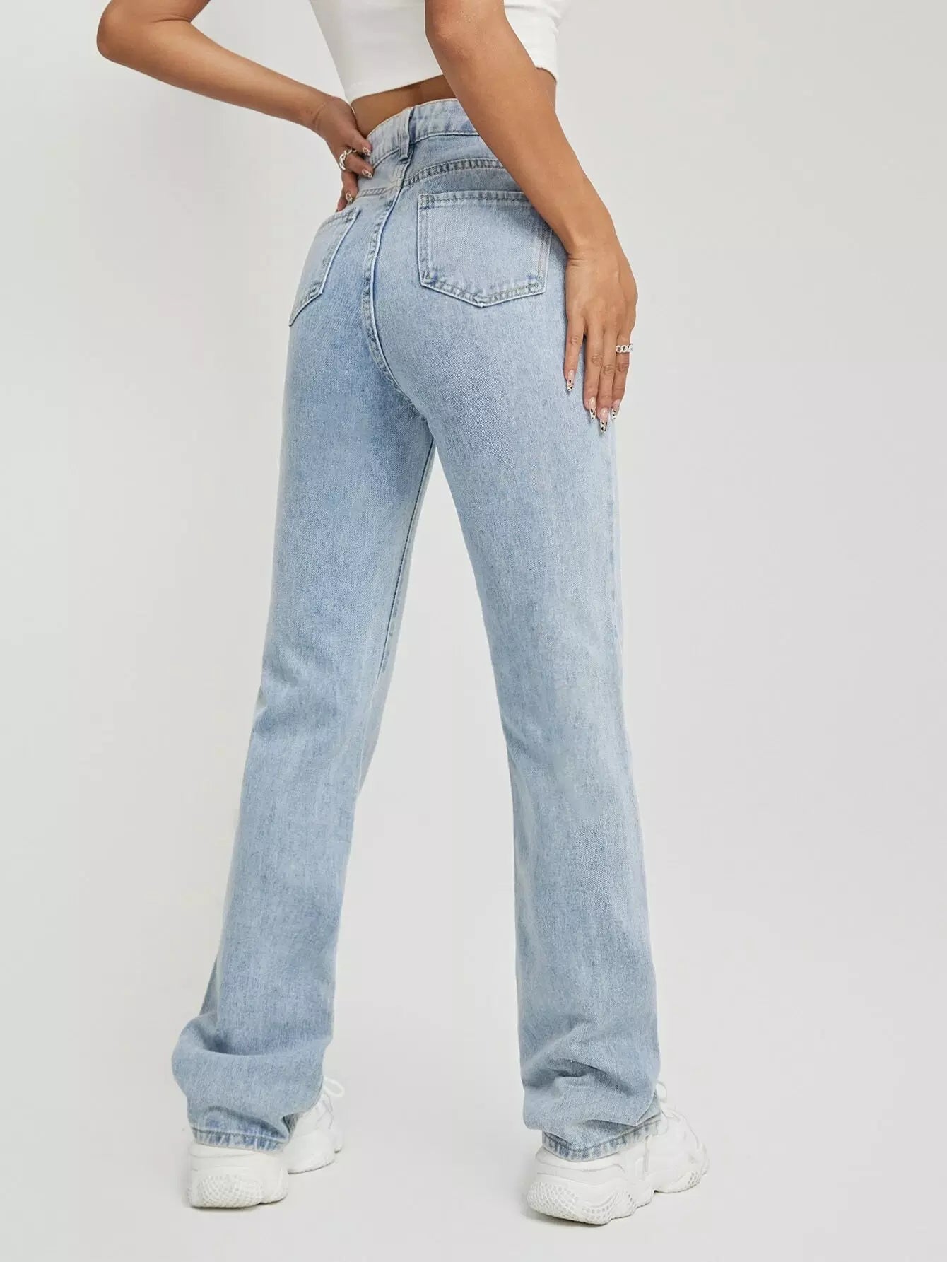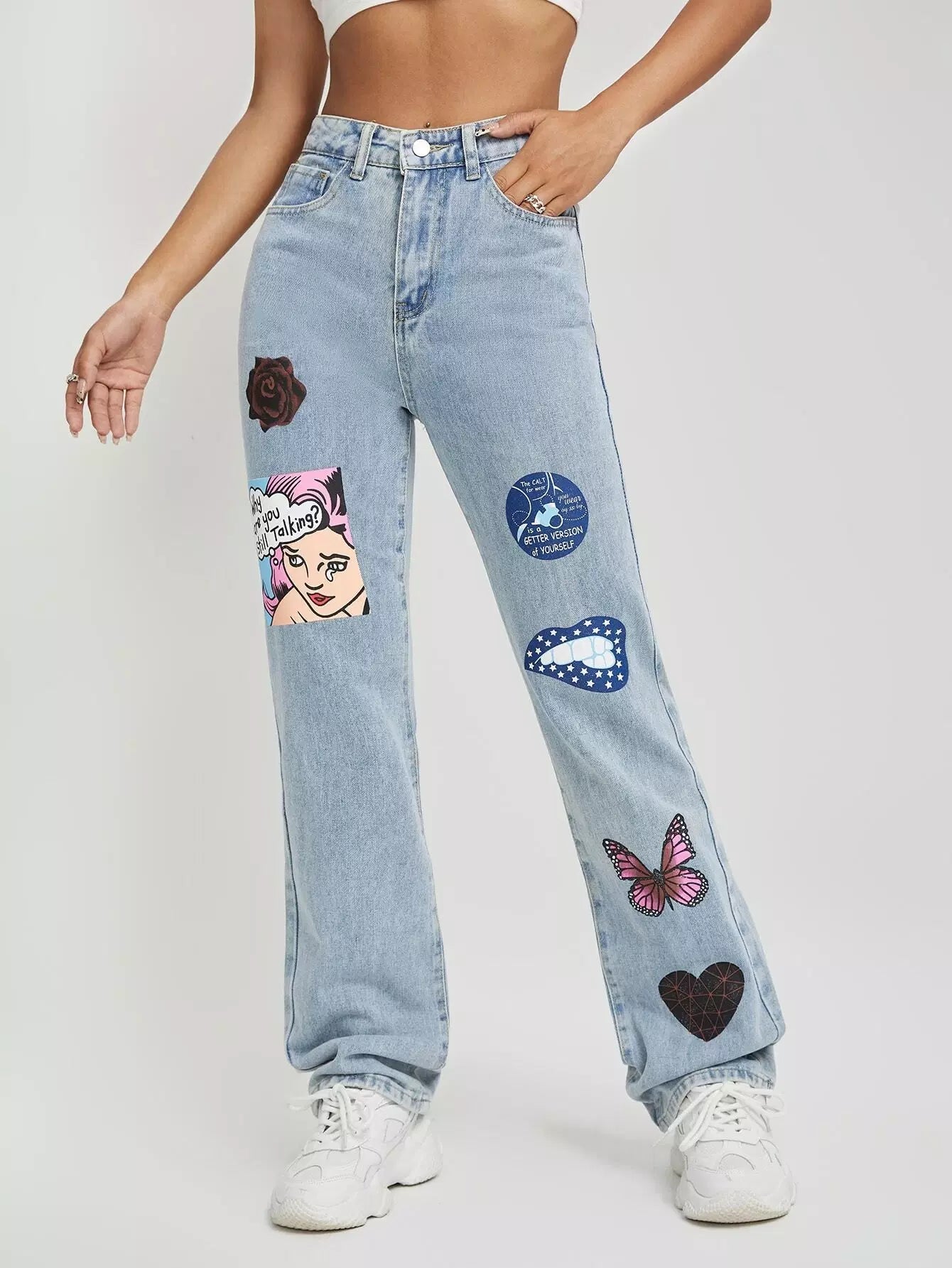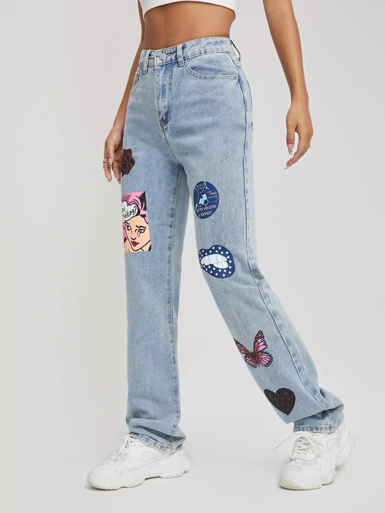 بنطلون جينز جرافيك عالي الخصر ورسومات الفراشات