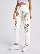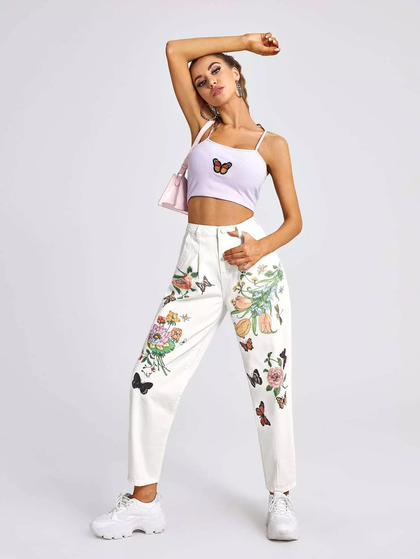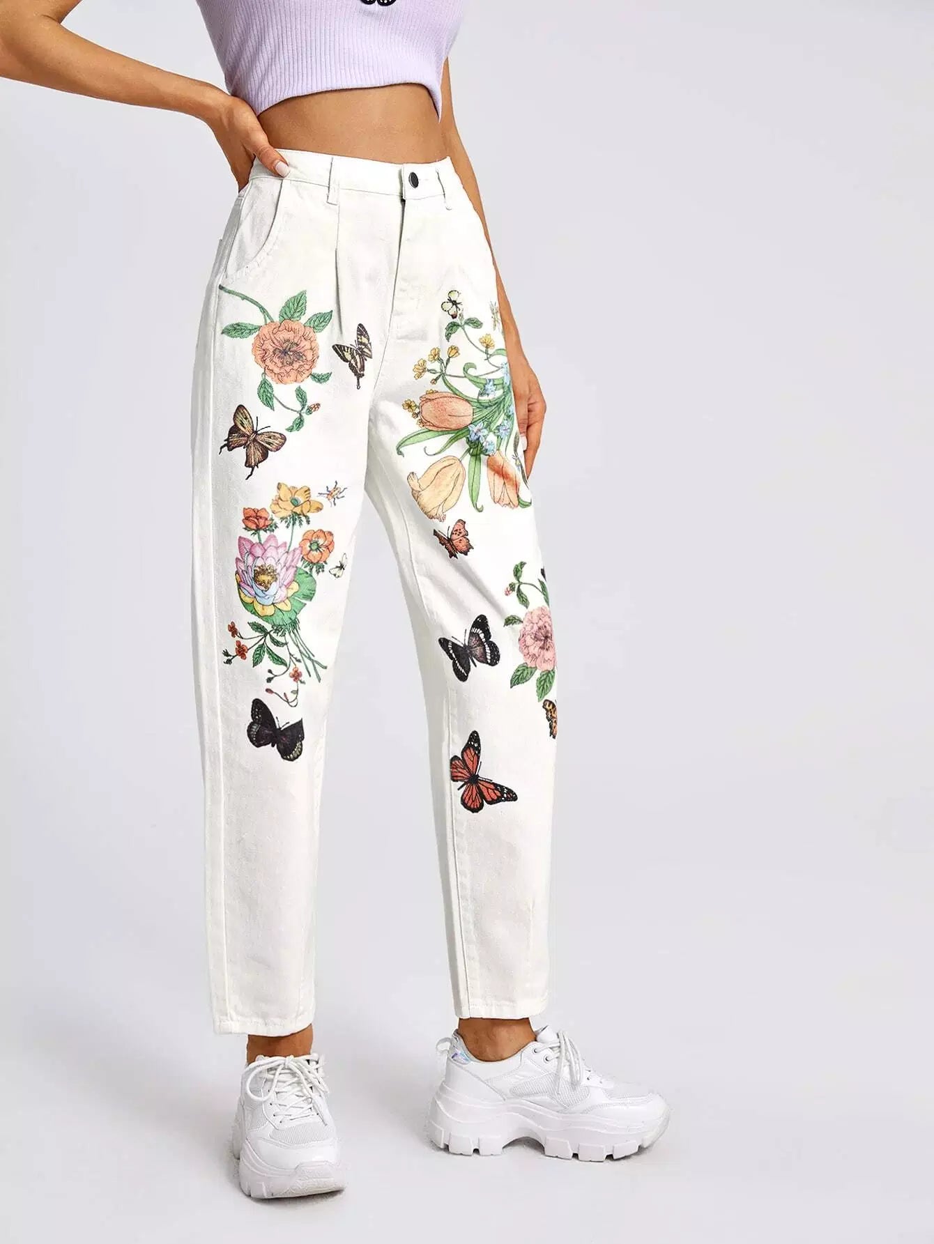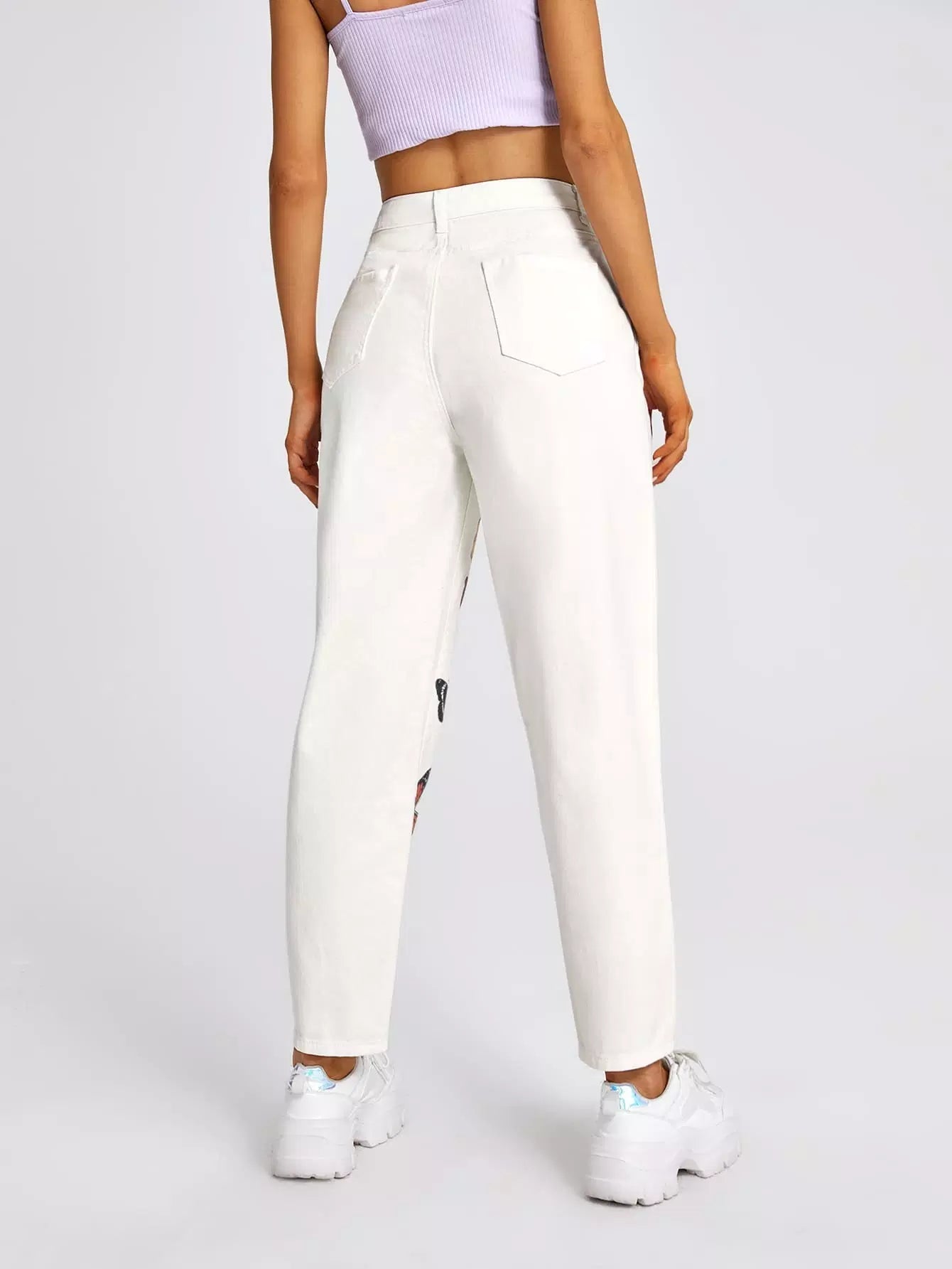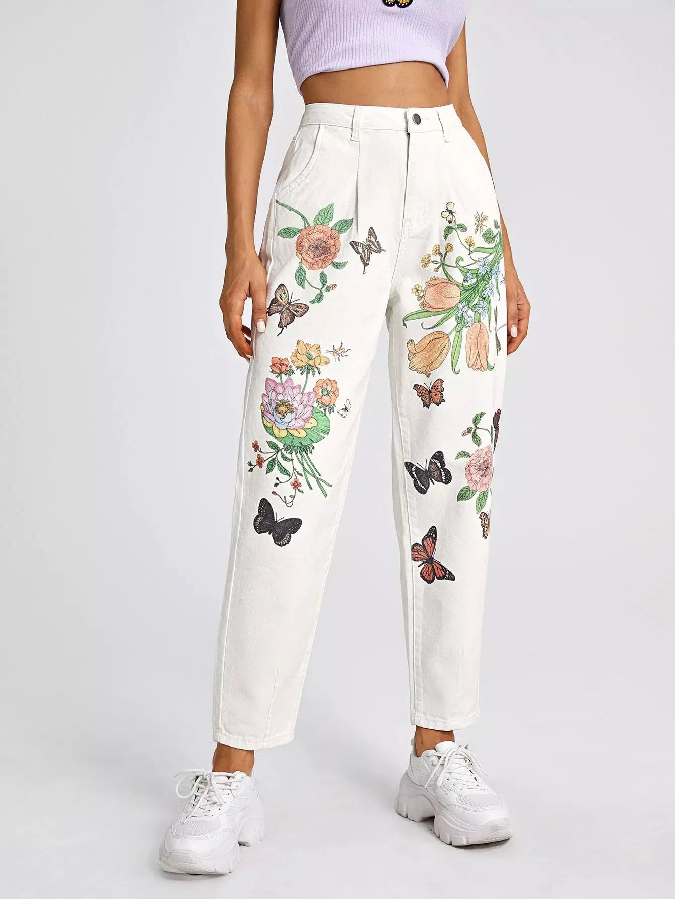 بنطلون جينز عالي الخصر بطبعة زهور وحيوانات للأمهات