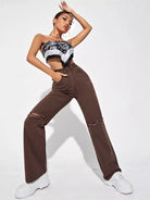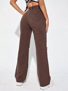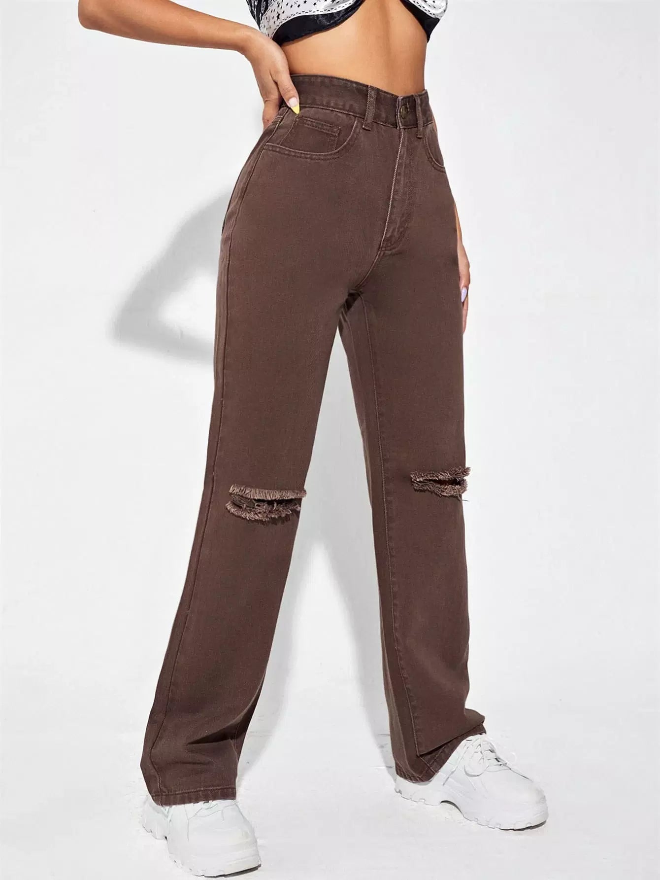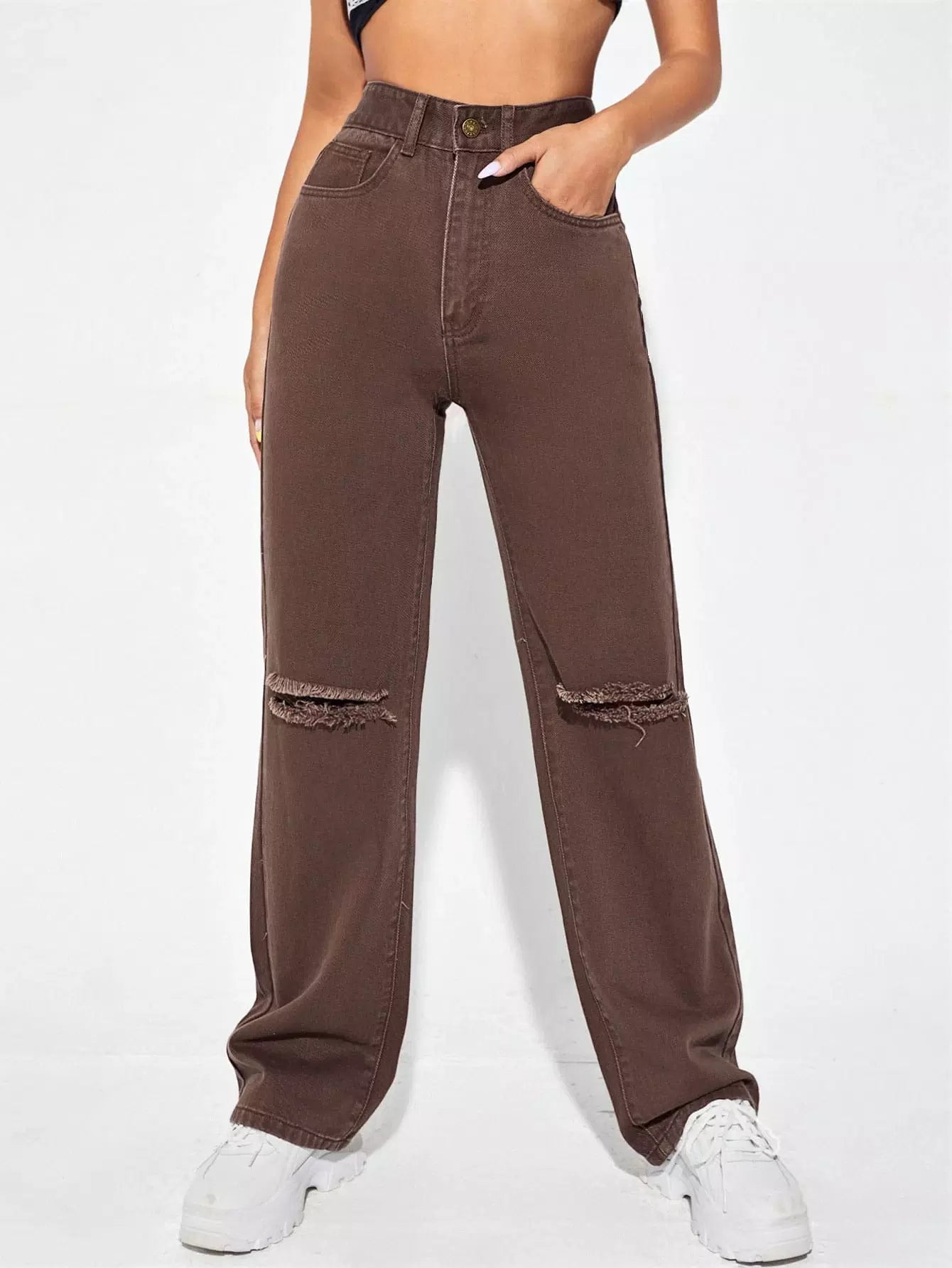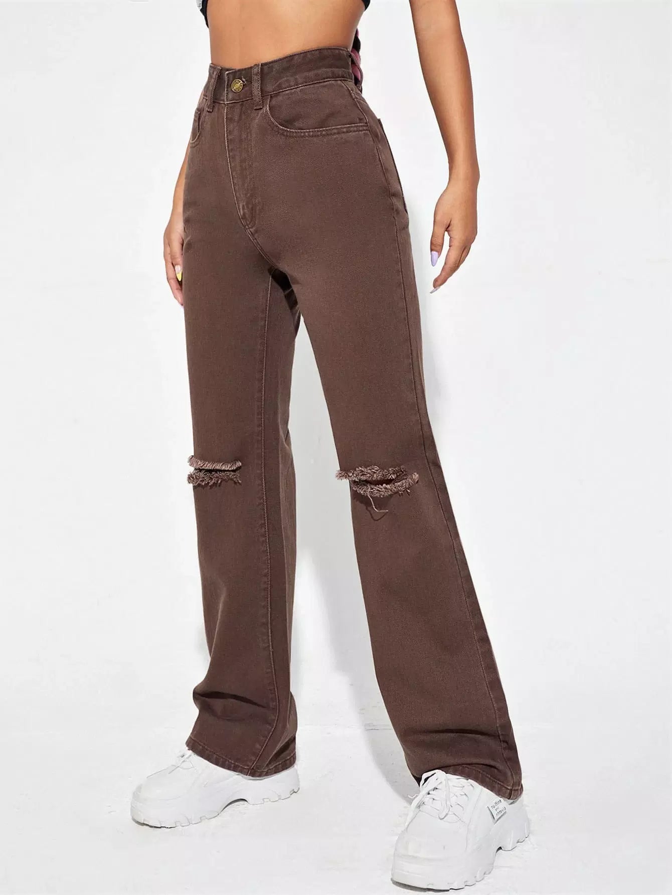 بنطلون جينز بخصر عالٍ ممزق وعريض الساقين