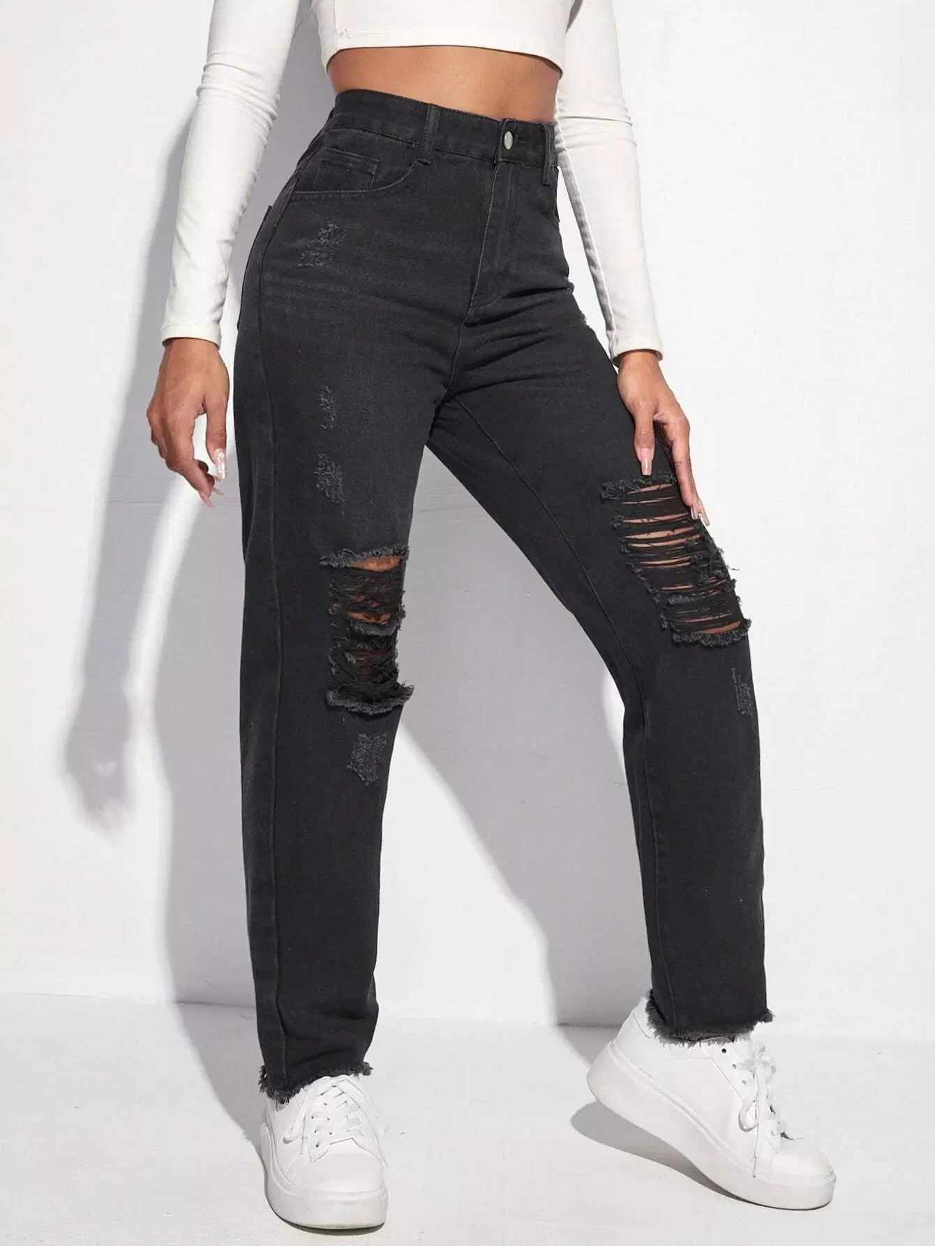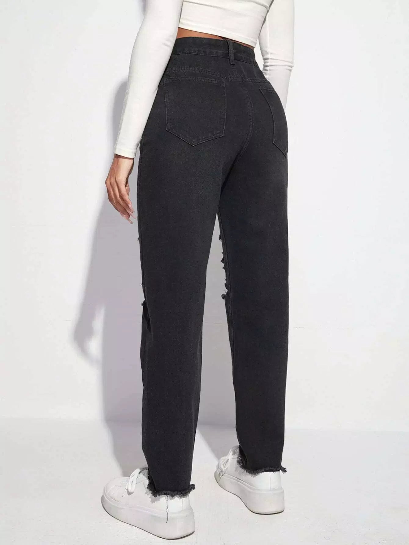 بنطلون جينز بحواف ممزق عالي الخصر بحافة خام