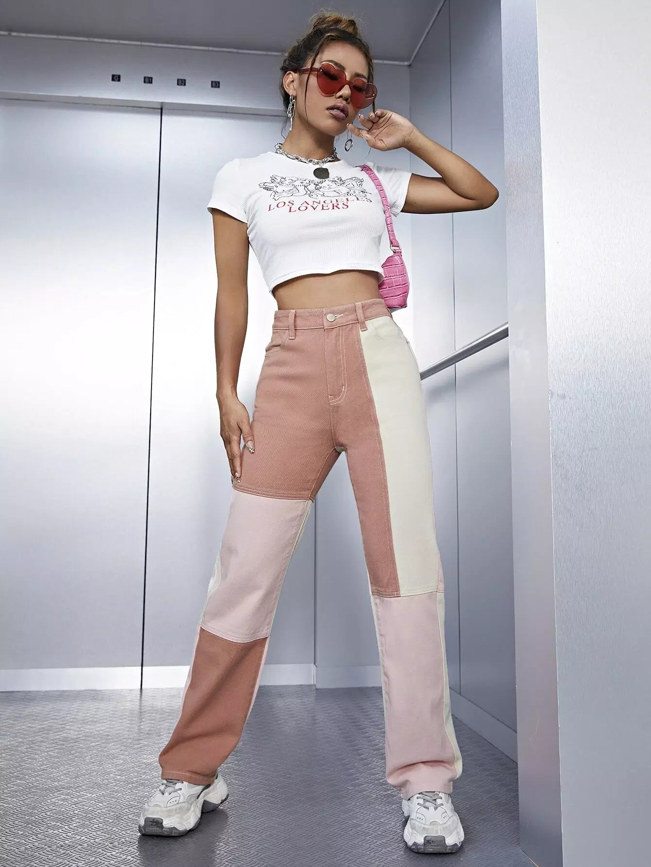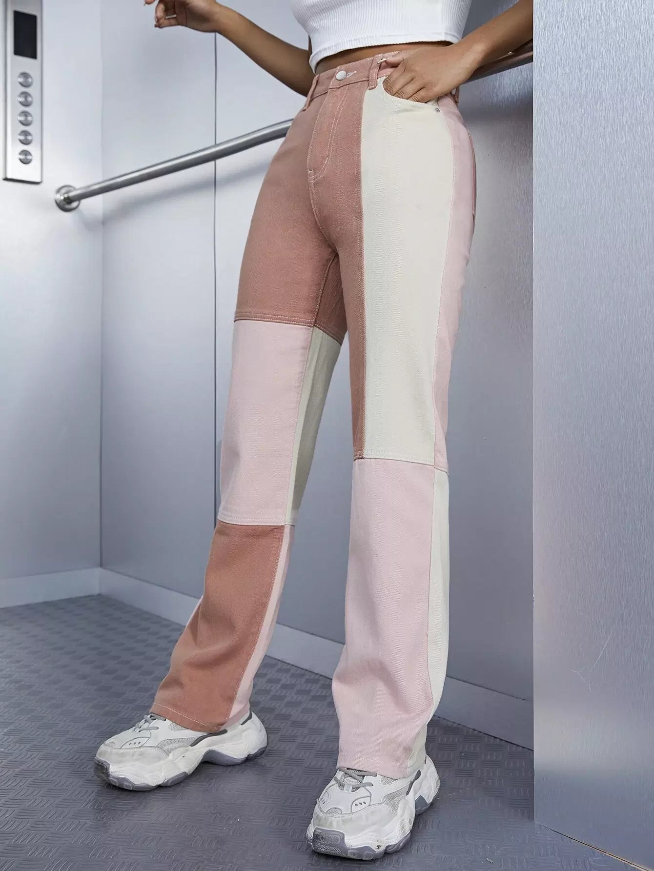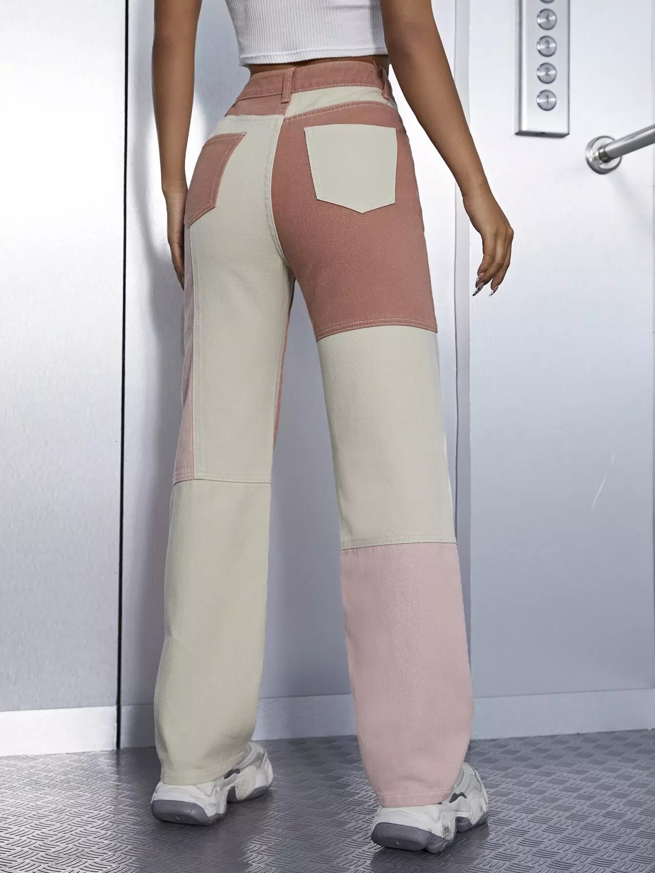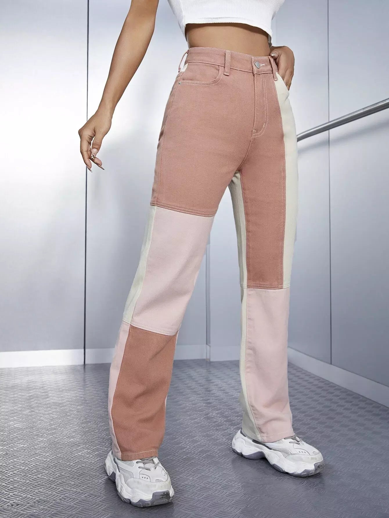 بنطلون جينز بجيوب مائلة عالية الخصر عالية الخصر