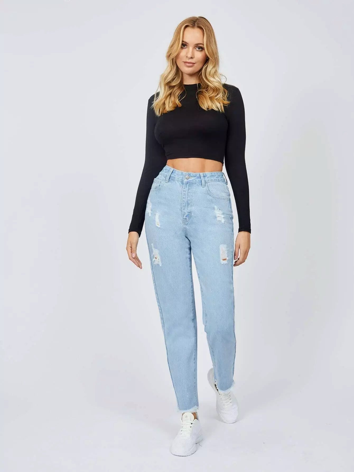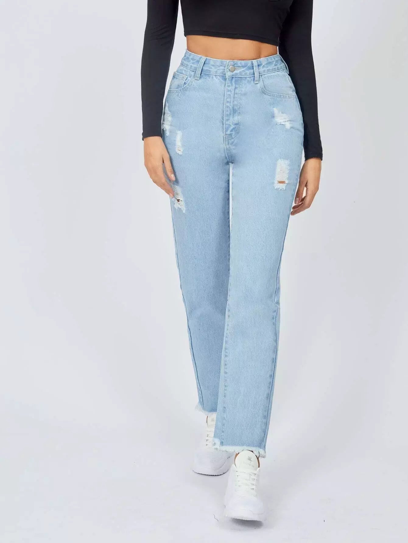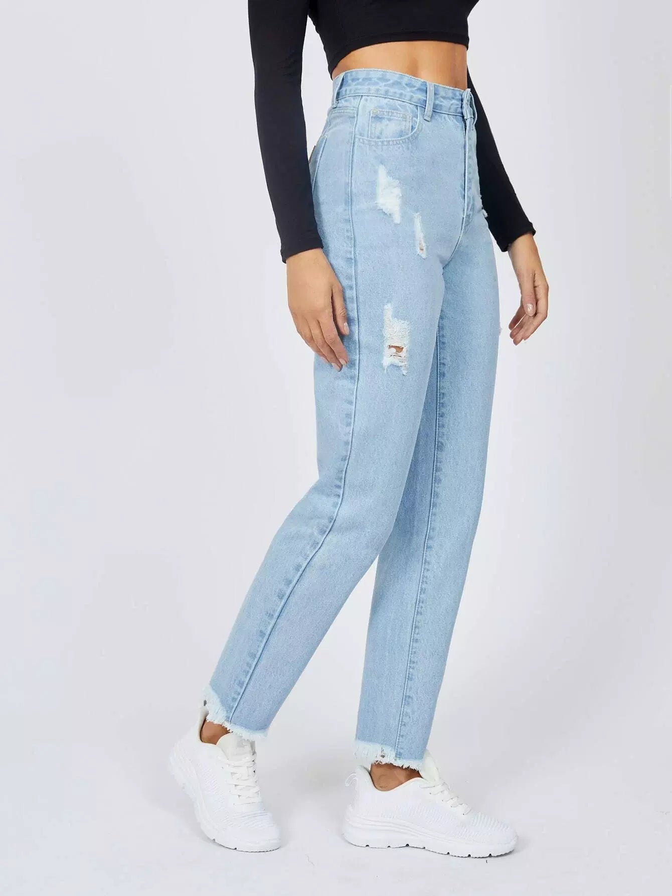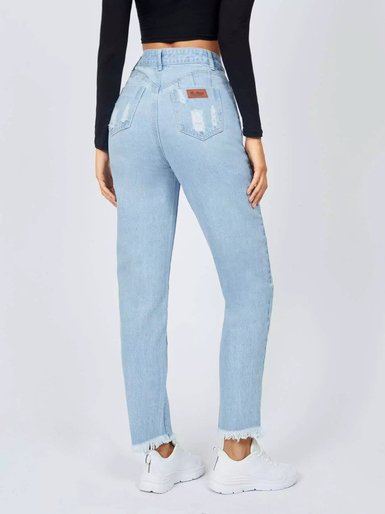 للنساء - بنطال جينز ممزق بحاشية خام مرقّع