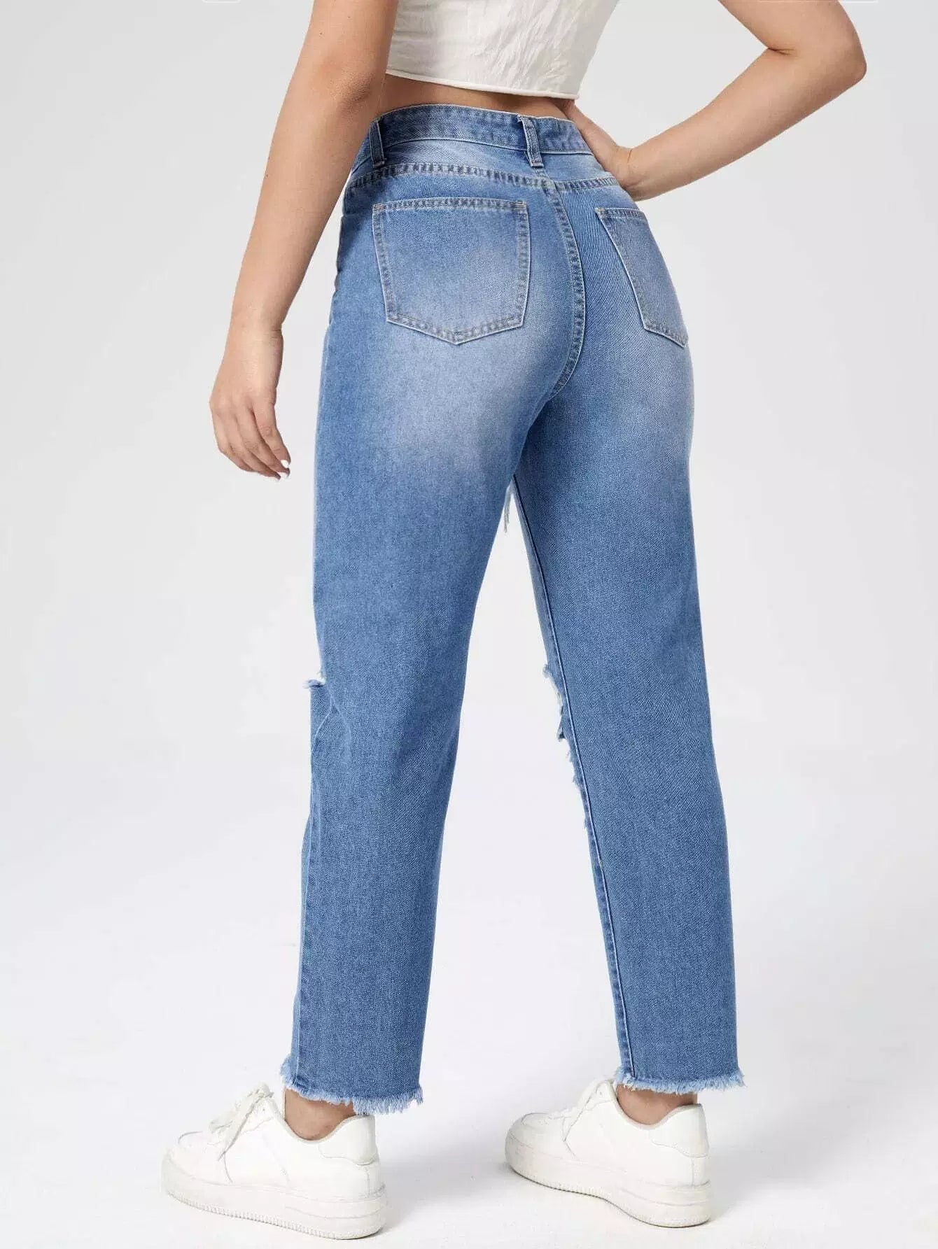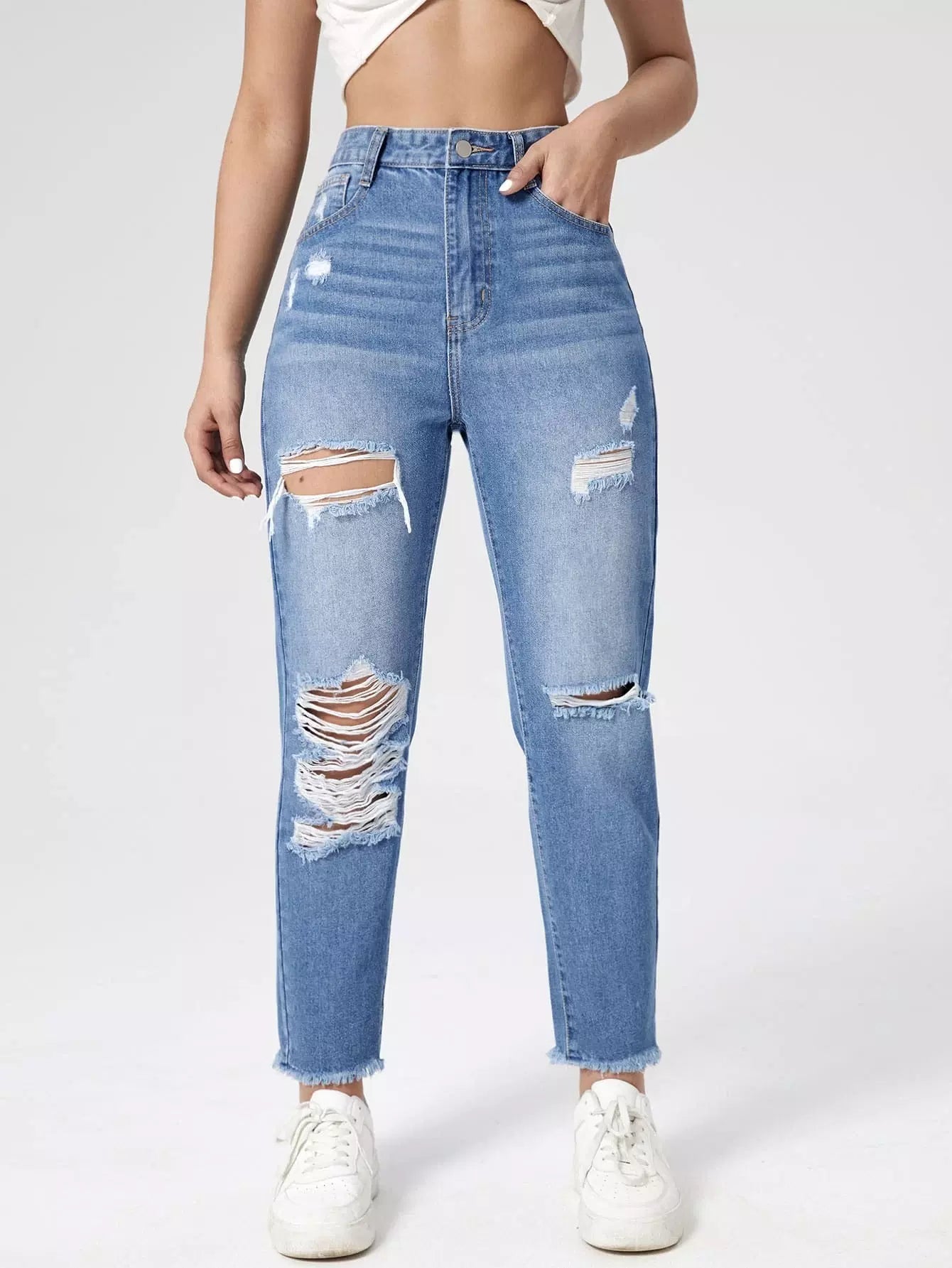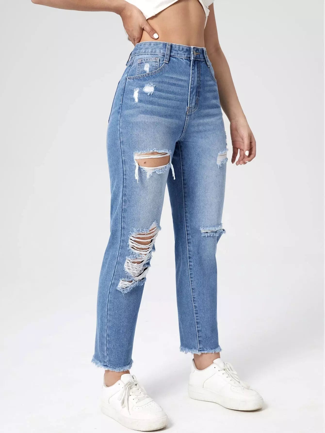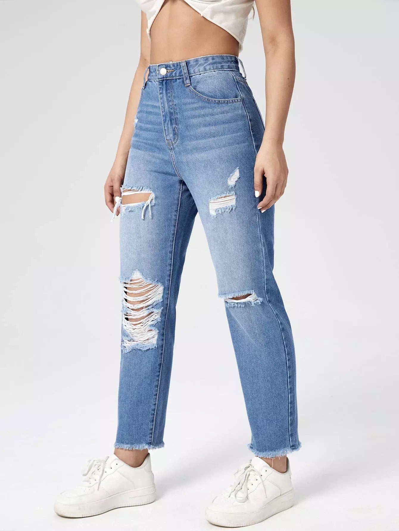 بنطال جينز ممزق بخصر مرتفع وحافة خام
