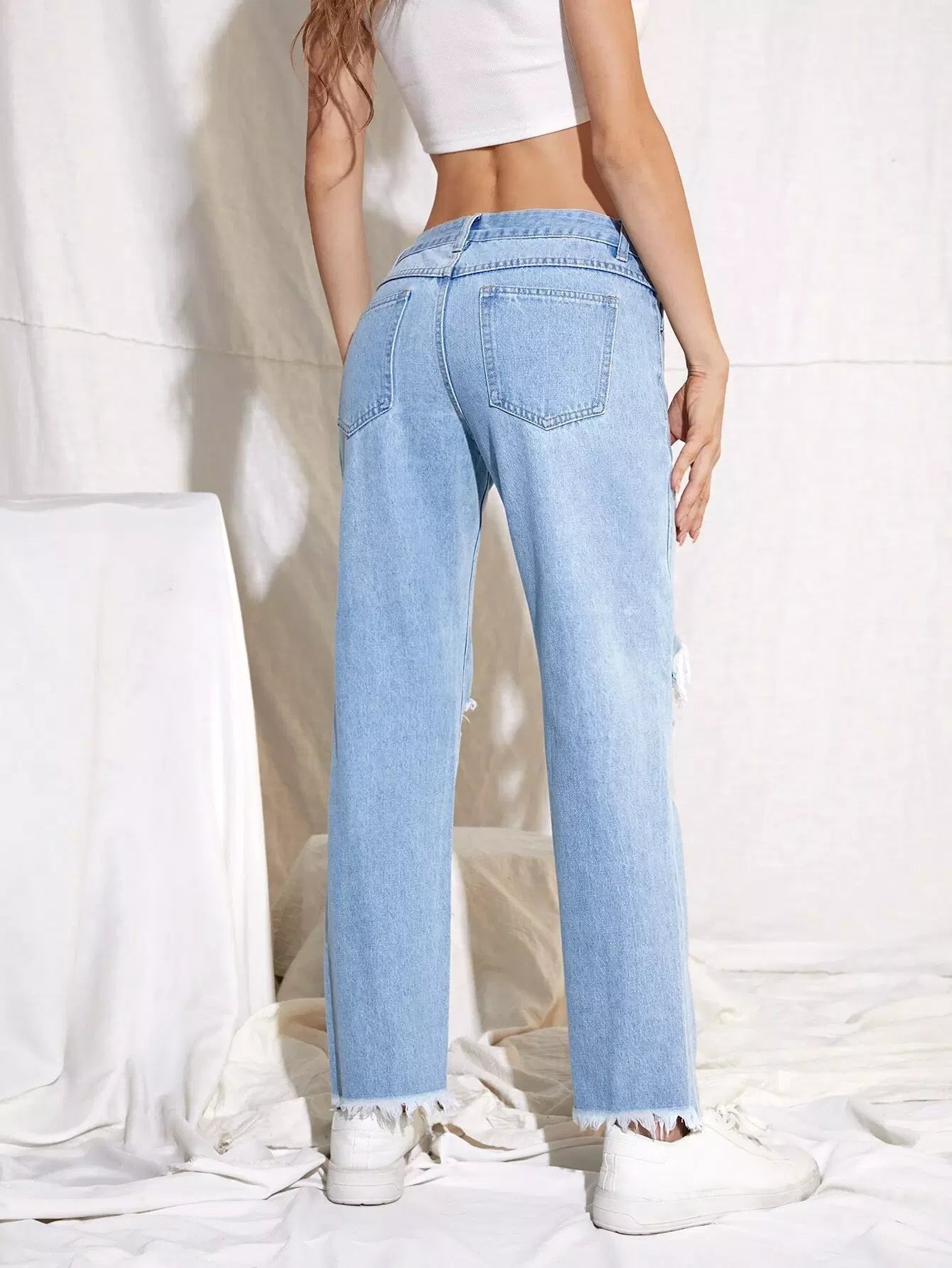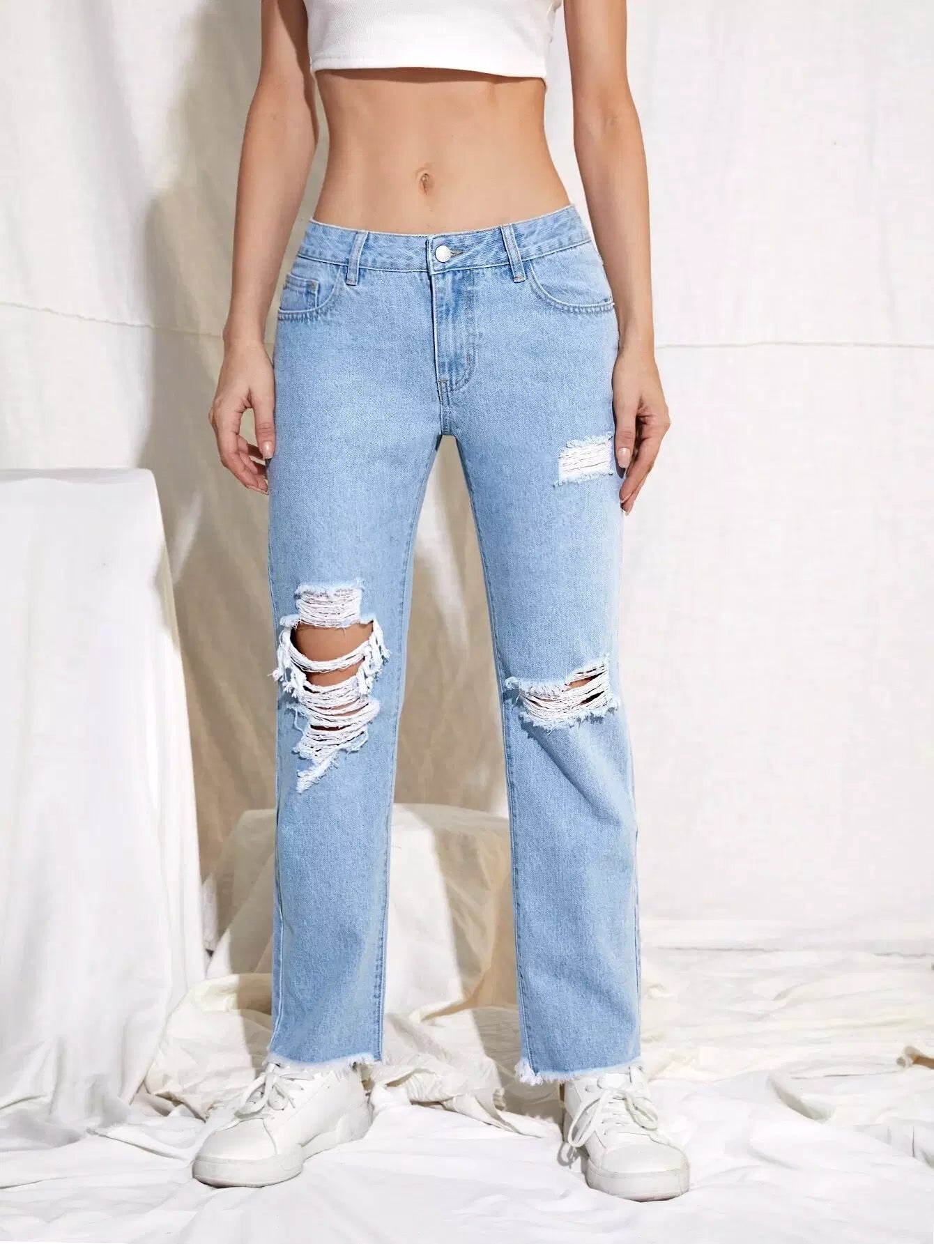 بنطال جينز ممزق بسحاب وحاشية خام وساق مستقيمة