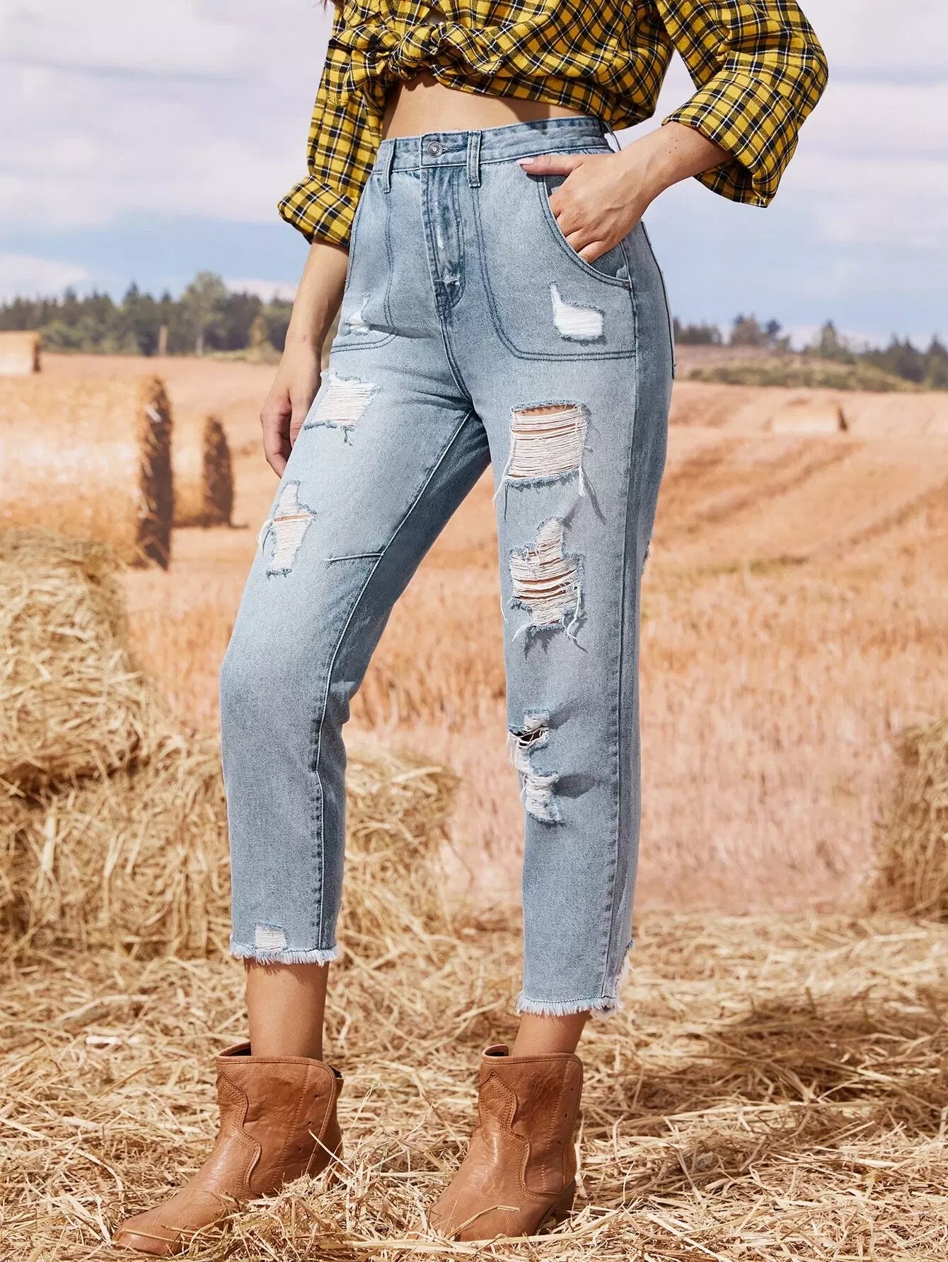 بنطال جينز ممزق ذو حافة غير مكتملة وجيب مائل